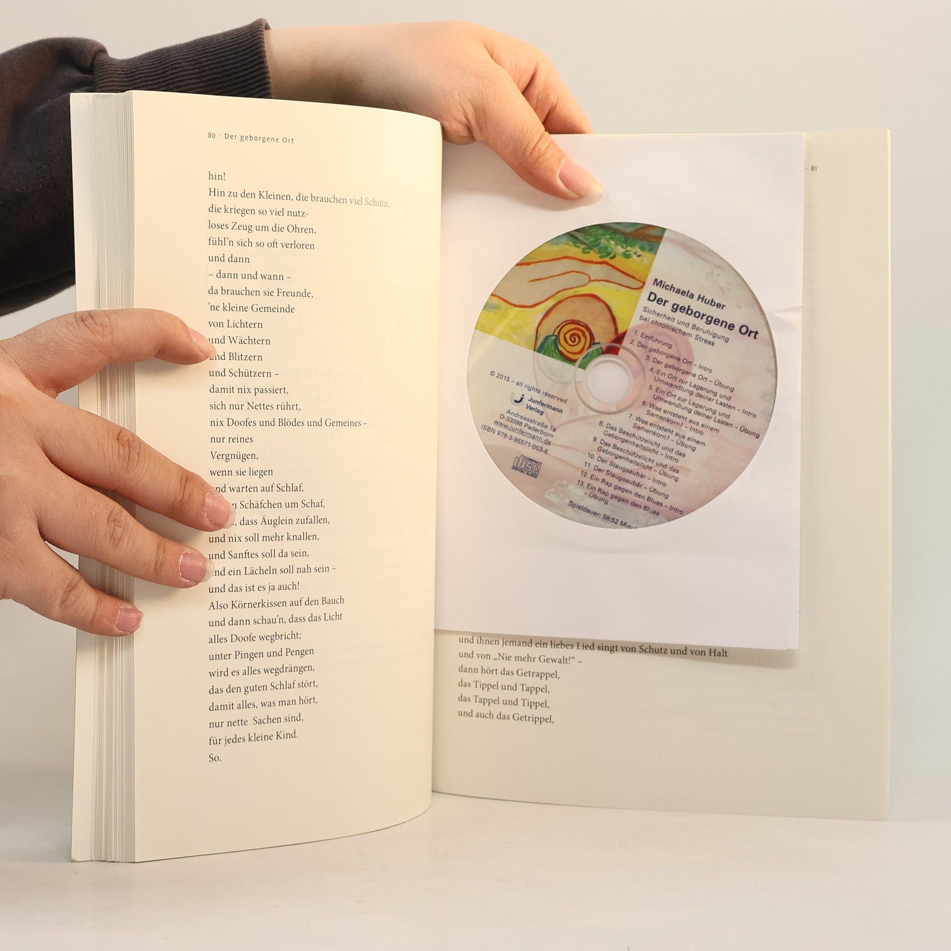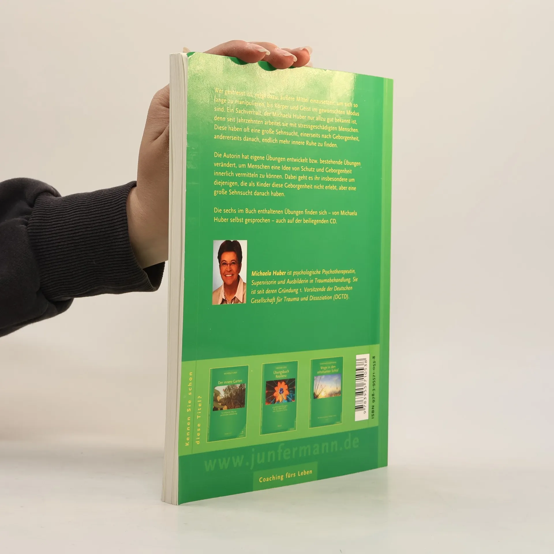 Wer gestresst ist neigt dazu, äußere Mittel einzusetzen, um sich so lange zu manipulieren, bis Körper und Geist im gewünschten Modus sind. Ein Sachverhalt, der Michaela Huber nur allzu gut bekannt ist, denn seit Jahrzehnten arbeitet sie mit stressgeschädigten Menschen. Diese haben oft eine große Sehnsucht, einerseits nach Geborgenheit, andererseits danach, endlich mehr innere Ruhe zu finden. Die Autorin hat eigene Übungen entwickelt bzw. bestehende Übungen verändert, um Menschen eine Idee von Schutz und Geborgenheit innerlich vermitteln zu können. Dabei geht es ihr insbesondere um diejenigen, die als Kinder diese Geborgenheit nicht erlebt, aber eine große Sehnsucht danach haben.