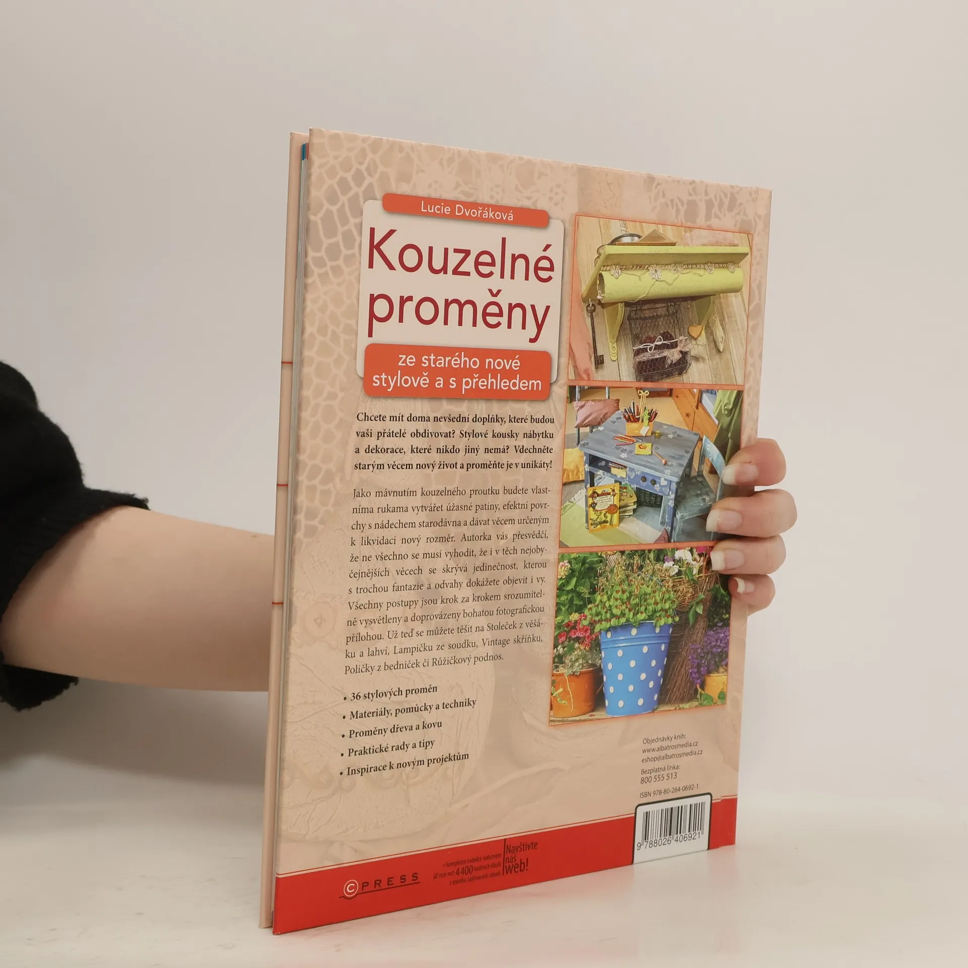 Ze starého nové - stylově a s přehledem. Chcete mít doma nevšední doplňky, které budou vaši přátelé obdivovat? Stylové kousky nábytku a dekorace, které nikdo jiný nemá? Vdechněte starým věcem nový život a proměňte je v unikáty. Jako mávnutím kouzelného proutku budete vlastníma rukama vytvářet úžasné patiny, efektní povrchy s nádechem starodávna a dávat věcem určeným k likvidaci nový rozměr. Autorka vás přesvědčí, že ne všechno se musí vyhodit, že i v těch nejobyčejnějších věcech se skrývá kouzlo, které s trochou fantazie a odvahy dokážete objevit i vy. Všechny projekty jsou srozumitelně vysvětleny a doprovázeny bohatou fotografickou přílohou. - 35 jedinečných proměn - Materiály, pomůcky a techniky - Proměny dřeva a kovu - Praktické rady a tipy - Inspirace k novým projektům