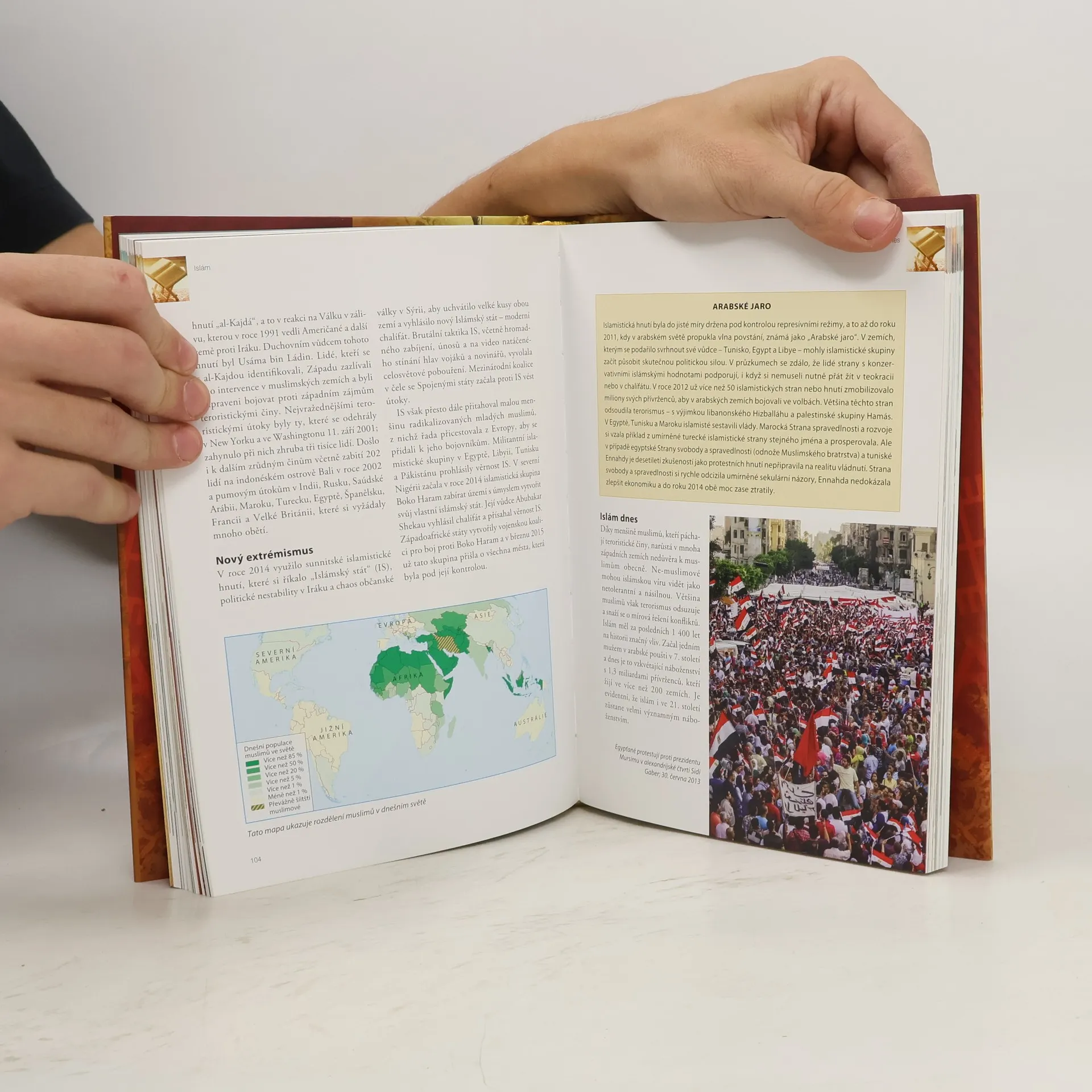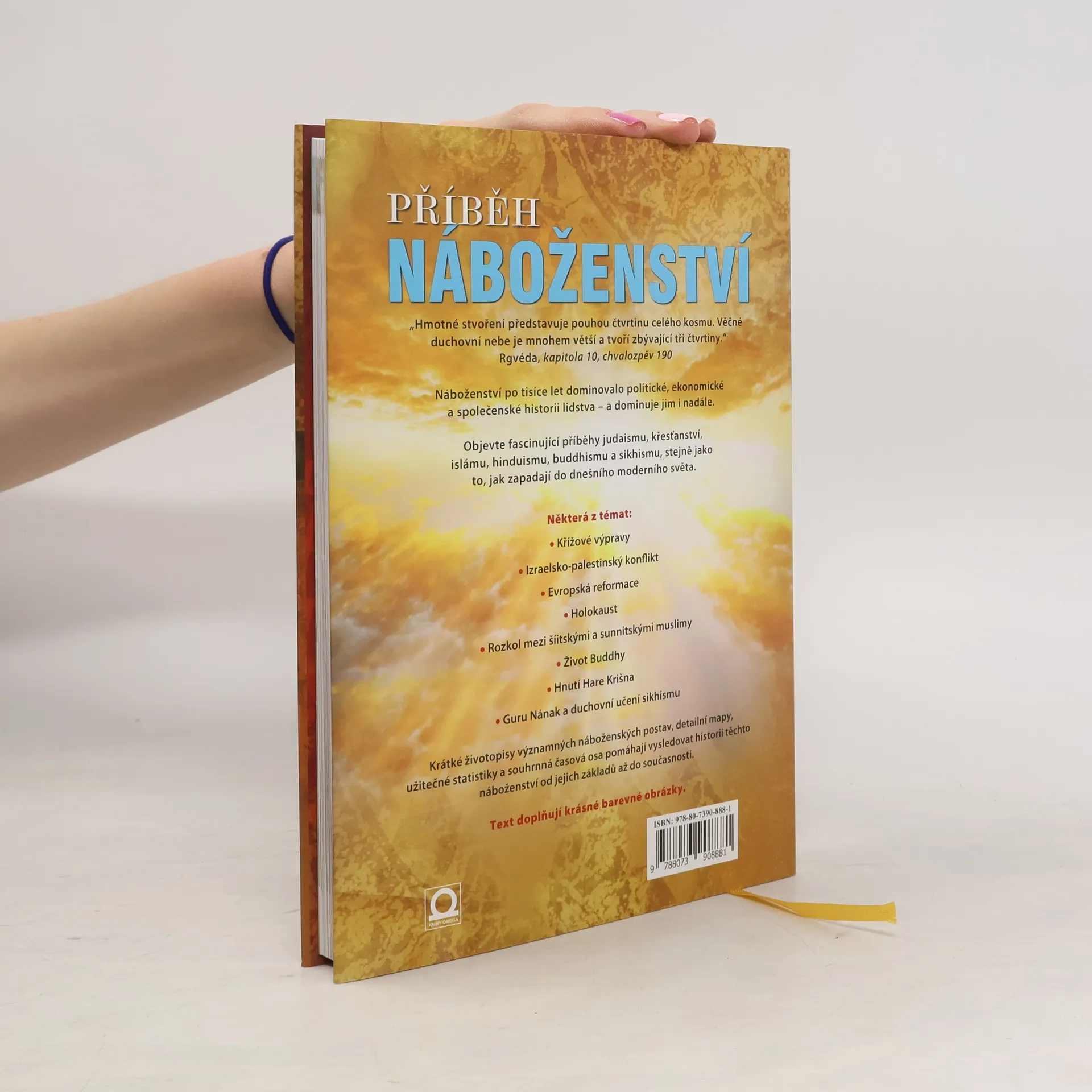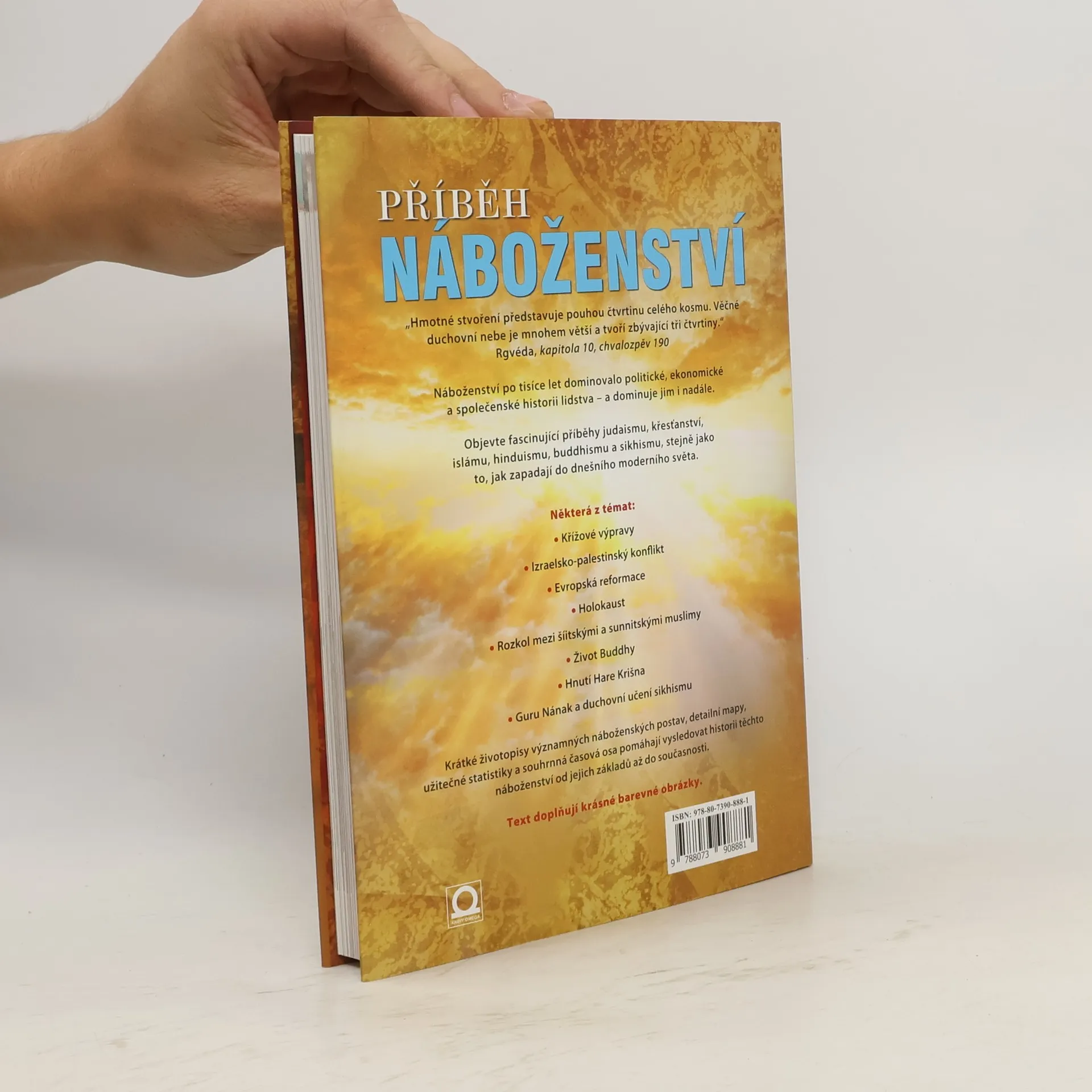Kompletní historie nejdůležitějších náboženských směrů. Publikace sleduje historii nejdůležitějších náboženství světa, od jejich založení až po současnost. Unikátní vývoj dokreslují historické mapy, životopisy slavných náboženských vůdců, statistiky, přehledy svátků i časové osy. Dočítáme se primárně o buddhismu, křesťanství, hinduismu, islámu, judaismu a sikhismu. Výklad je doplněn příběhy prostých věřících z dávné historie a popisem tradicionalismu. Publikace obsahuje více než 100 barevných fotografií.