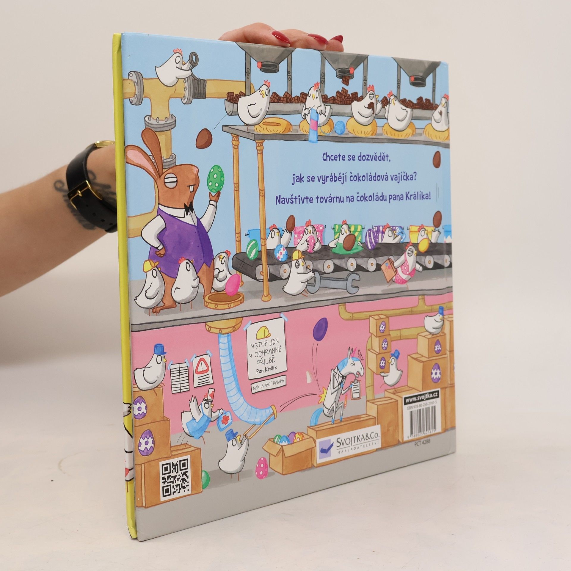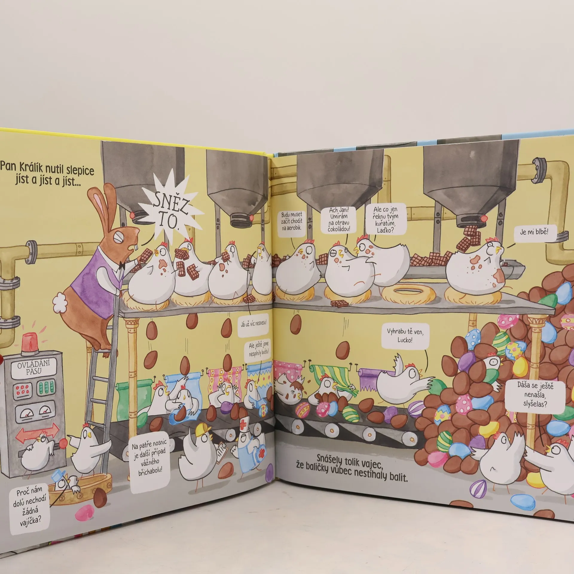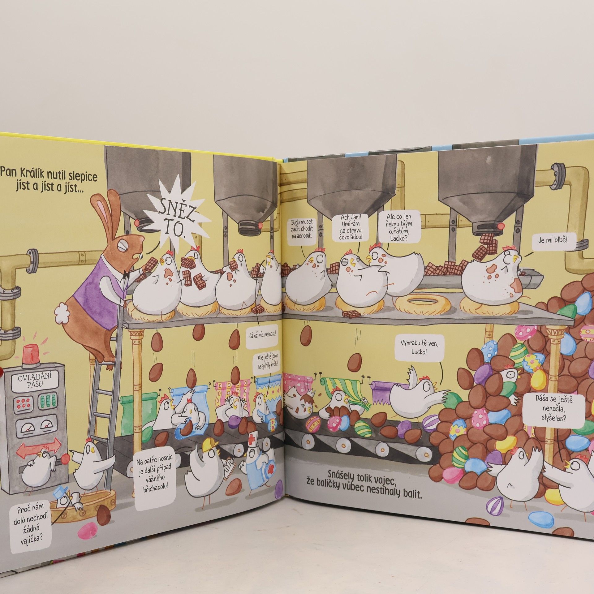 Víte, jak se vyrábějí čokoládová vajíčka? Možná to není tak jednoduché, jak si myslíte! V továrně, kterou řídí králík (pro vás pan Králík), mají poslední dobou dost napilno. Šéf se rozhodl zvýšit výrobu a slepičky dělnice i jednorožec Edgar, kontrolor kvality, z toho mají pořádně zamotanou hlavu. Když dojde k několika pracovním úrazům, vstupují do stávky. Pan Králík je však natolik posedlý svou vizí, že se rozhodne ve výrobě pokračovat sám… A jak to celé dopadne? To se dozvíte v této veskrze zábavné komiksové knížce, která pobaví malé i velké čtenáře svou originalitou, působivým grafickým zpracováním a praštěným smyslem pro humor.