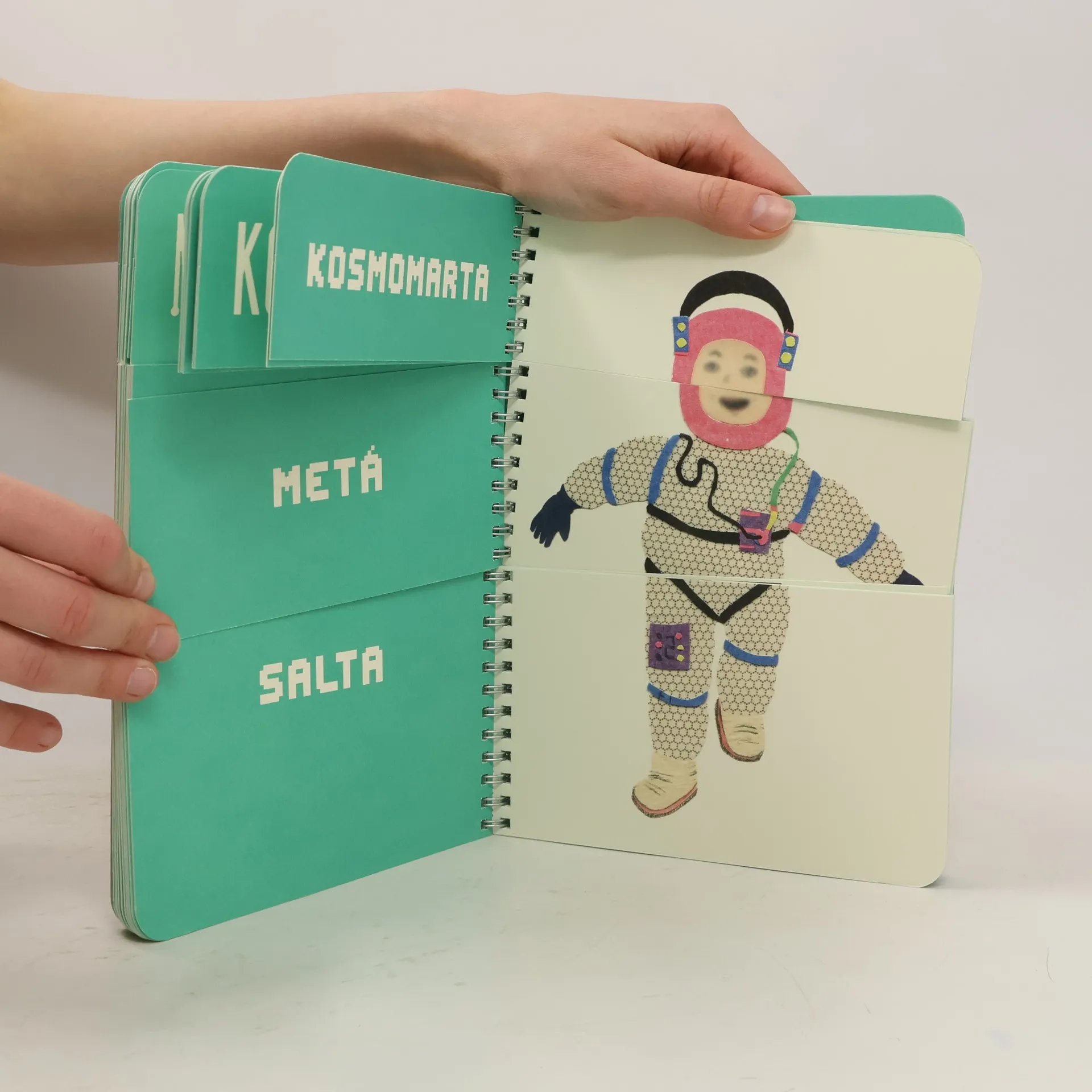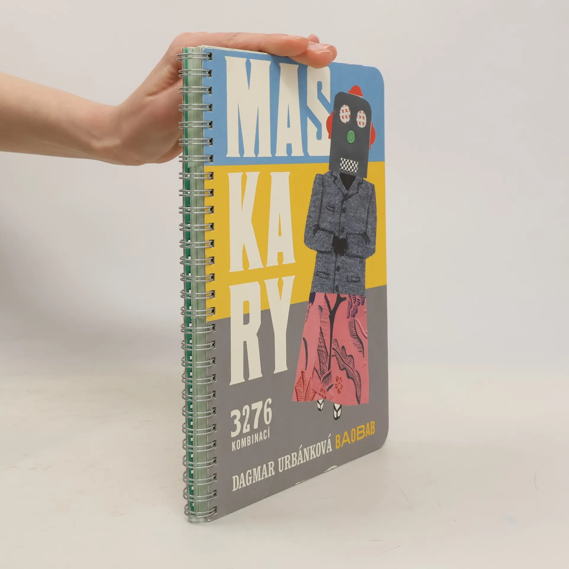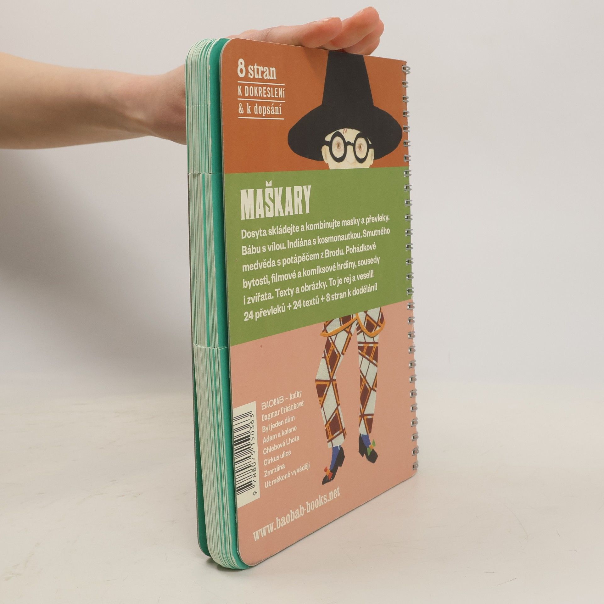 Knížka-hračka ilustrátorky, spisovatelky a scénografky Dagmar Urbánkové je založena na vděčném principu rozřezaných stránek, který umožňuje skládat a kombinovat figury neodmyslitelně patřící k maškarním průvodům a karnevalům. Děti v ní najdou převleky ze starých časů, nedávno minulých i ty ze žhavé současnosti. Kniha je také vzorníkem výtvarných prostředků (kresba, malba, výšivka, koláž), katalogem písmových typů z předpočítačové doby (dřevěné grotesky, zdobné toskánky, těžkopádné egyptienky) i vděčnou slovní hrou. A nakonec — vytvořte si vlastní maškaru i verš!