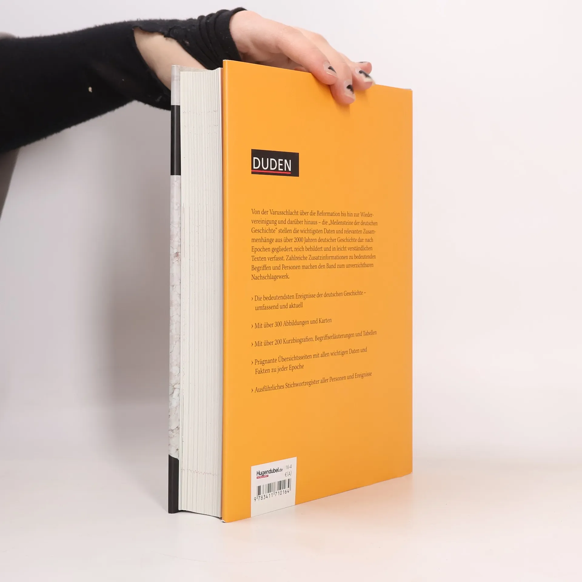 Was man über die deutsche Geschichte wissen muss, steht jetzt im Duden. Verfasst von neun hochkarätigen Historikern bietet Duden das einzige aktuelle Überblickswerk auf dem Markt. Die deutsche Geschichte ist reich an Wandlungen und Umbrüchen, Katastrophen und Neuanfängen, die sich in vielfältigen historischen Ereignissen zeigen und meist Ergebnisse langfristiger Entwicklungen sind. Von der Varusschlacht 9. n. Chr. bis hin zur Wiedervereinigung 1989 und Ukraine-Konflikt in jüngster Zeit: Der reich bebilderte Band zeigt stellt sowohl die Einzelereignisse dar als auch deren Zusammenhänge, gegliedert nach acht Epochen. 1. Antike und Völkerwanderungszeit (1. Jh. n. Chr. bis 919) 2. Mittelalter (919–1495) 3. Konfessionelles Zeitalter (1495–1648) 4. Ancien Régime (1648–1815) 5. Bürgerliches Zeitalter (1815–1914) 6. Zeitalter der Weltkriege (1914–1945) 7. Bundesrepublik Deutschland und Deutsche Demokratische Republik (1945–1990) 8. Deutschland seit der „Wiedervereinigung“ (seit 1990) Über 500 Abbildungen und Karten sowie Kurzbiografien, Begriffserläuterungen und Tabellen bieten anschauliche und eindrucksvolle Hintergrundinformationen. Ein ausführliches Stichwortregister aller Personen und Ereignisse macht den Band zum unverzichtbaren Informationsmedium und Nachschlagewerk.