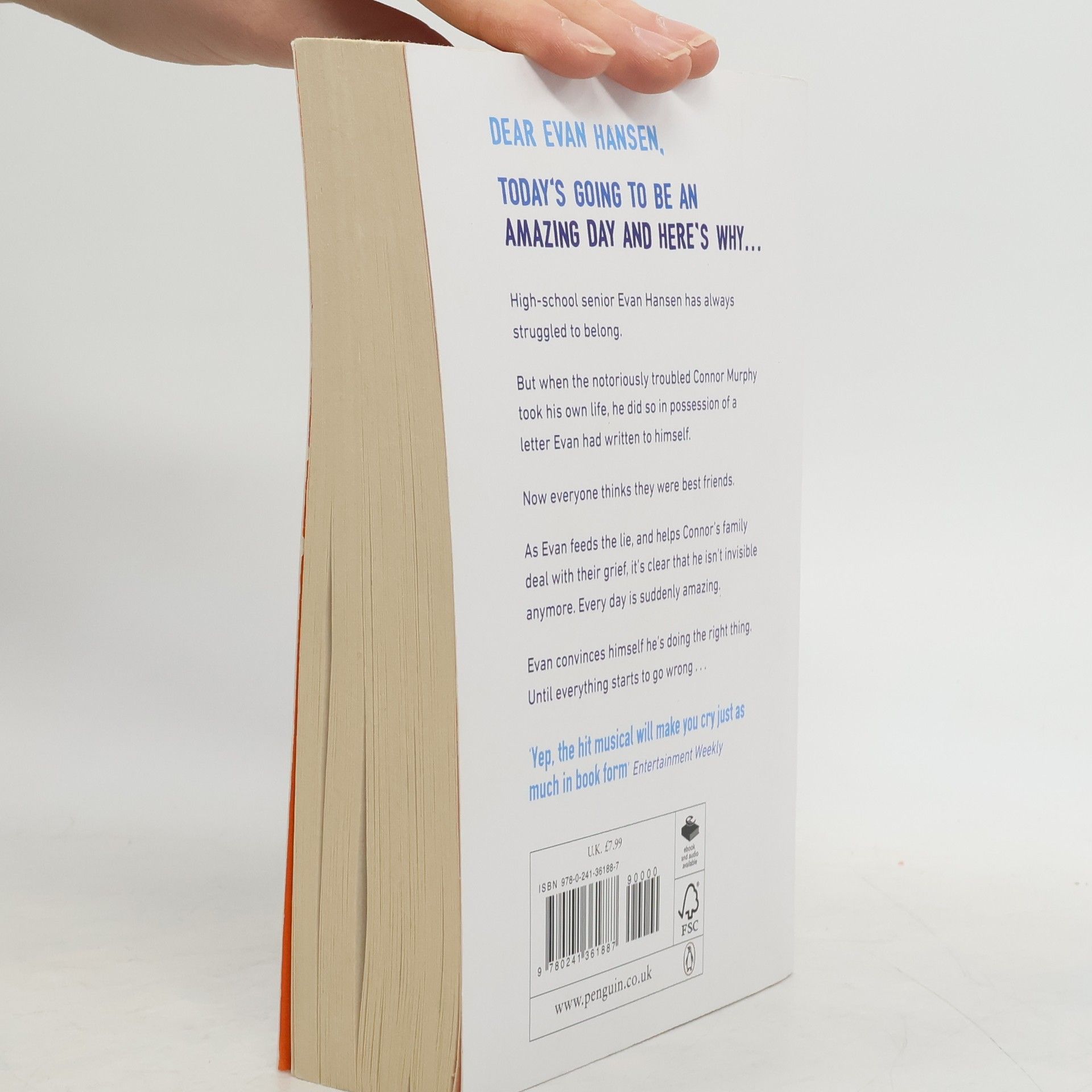 High school senior Evan Hansen has been given the chance of a lifetime- to belong. When the notoriously troubled Connor Murphy took his own life, he did so in possession of a letter Evan had written to himself. Now everyone thinks they were best friends. As he helps Connor's family deal with their grief, it's clear that Evan isn't invisible anymore - even to the girl of his dreams. Every day is suddenly amazing. But Evan is soon pulled deeper into Connor's family's swirl of anger, regret, and confusion. And then everything starts to go wrong . . .