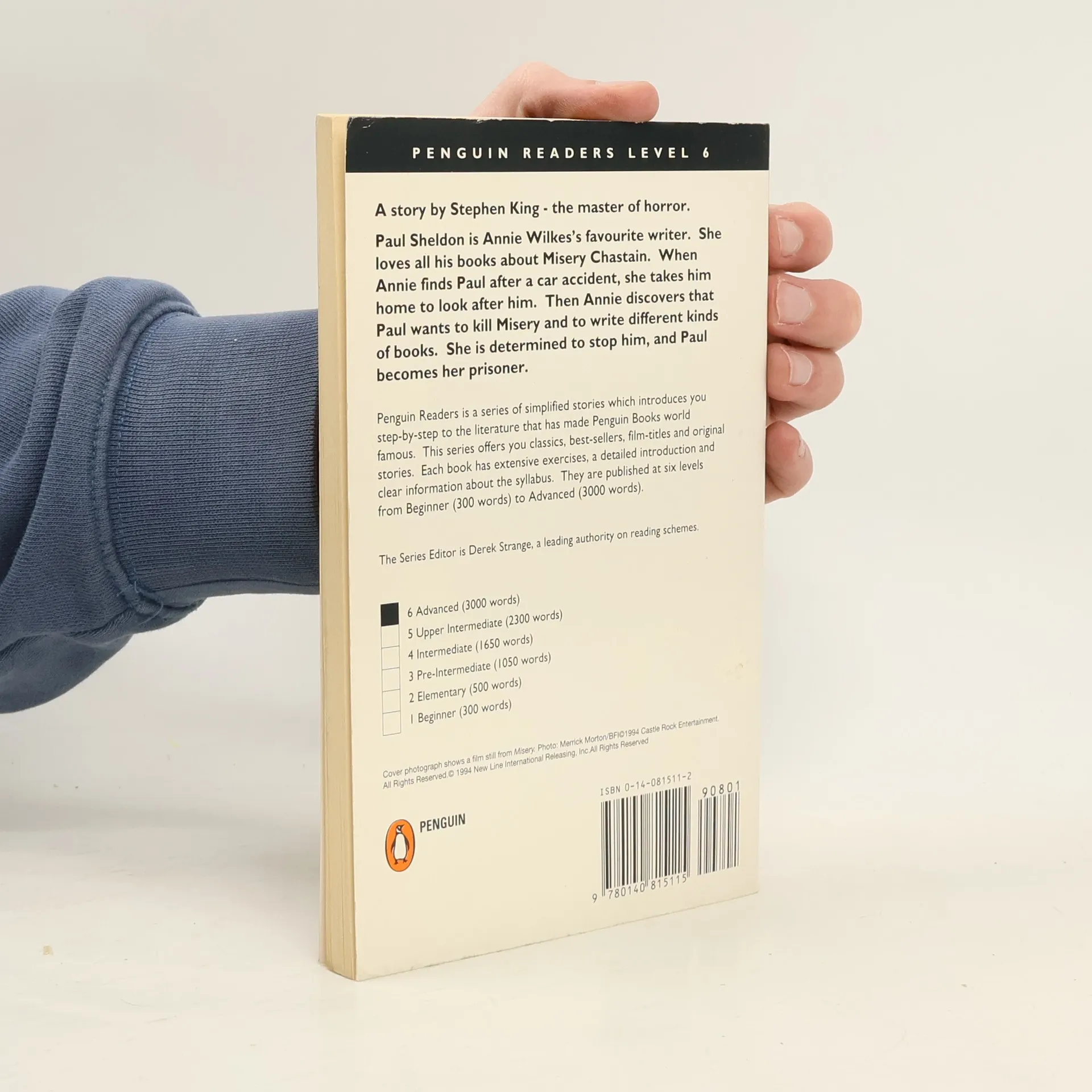 Simplified adaptation with language-learning materials. [Penguin Readers Level 6] Paul Sheldon is Annie Wilkes' favourite writer. She loves all his books about Misery Chastain. When she finds Paul injured after a car crash and takes him home she learns that he has decided to end the series by killing off Misery. Soon Paul's biggest fan turns into his biggest enemy and his nightmare begins! By the master of horror, Stephen King, this will keep you on the edge of your seat!