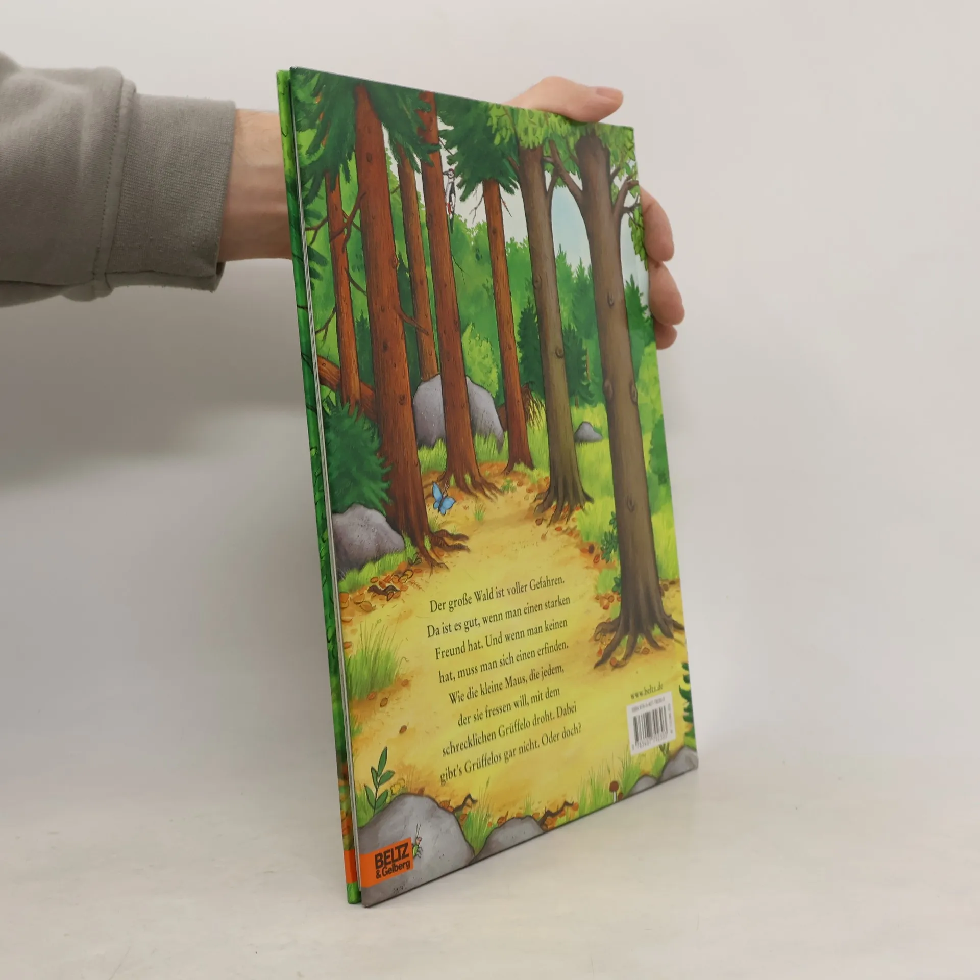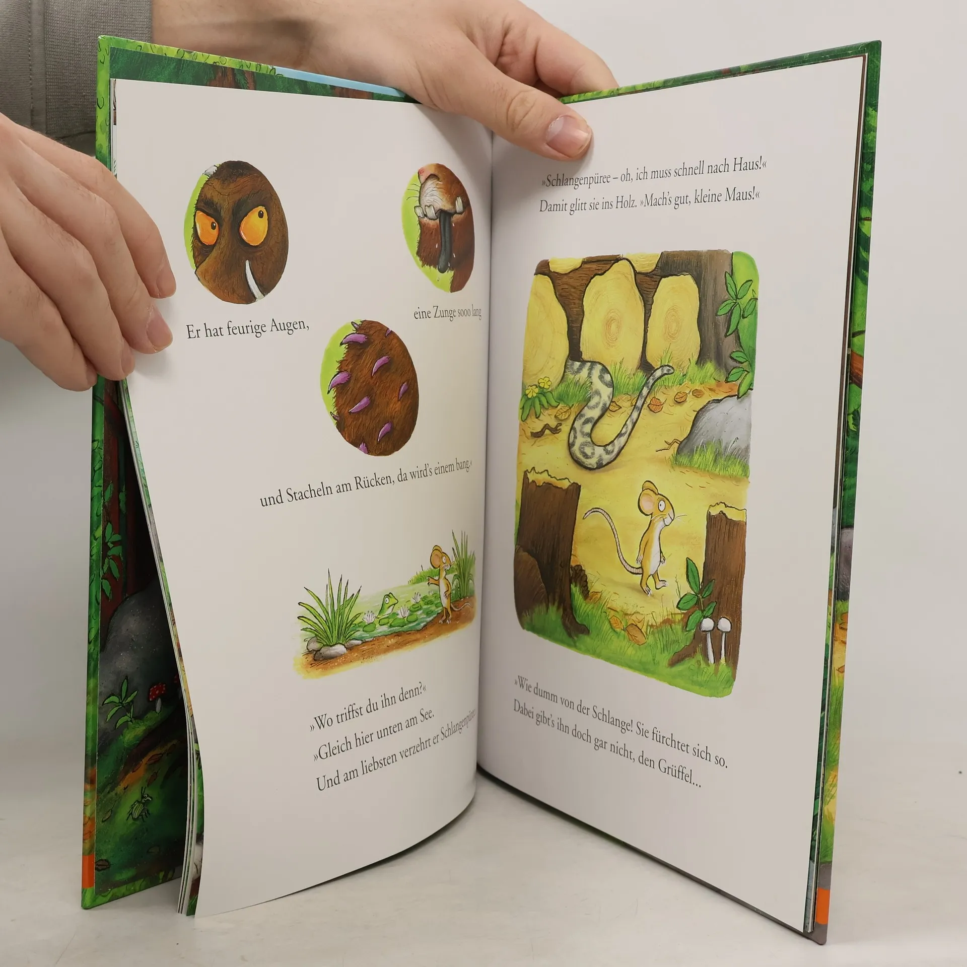 Der große Wald ist voller Gefahren. Da ist es gut, wenn man einen starken Freund hat. Und wenn man keinen hat, erfindet man sich eben einen. Die kleine Maus ist unterwegs im Wald und alle scheinen es gut mit ihr zu meinen. Der Fuchs lädt sie zur Götterspeise ein, die Eule bittet zum Tee und die Schlange zum Schlangen-Mäuse-Fest. Aber die Maus hat immer schon eine Verabredung: mit ihrem Freund, dem schrecklichen Grüffelo. Den hat sie sich zwar nur ausgedacht, aber wenn sie ihn ihren Möchte-gern-Gastgebern beschreibt, wollen die doch lieber alleine speisen. Der Grüffelo ist ein praktischer ausgedachter Freund! - Doch dann taucht er auf einmal wirklich auf, und sein Lieblingsschmaus, sagt er, ist Butterbrot mit kleiner Maus. Das ist nicht so praktisch. Aber was eine clevere kleine Maus ist, die lehrt auch einen Grüffelo in echt das Fürchten.