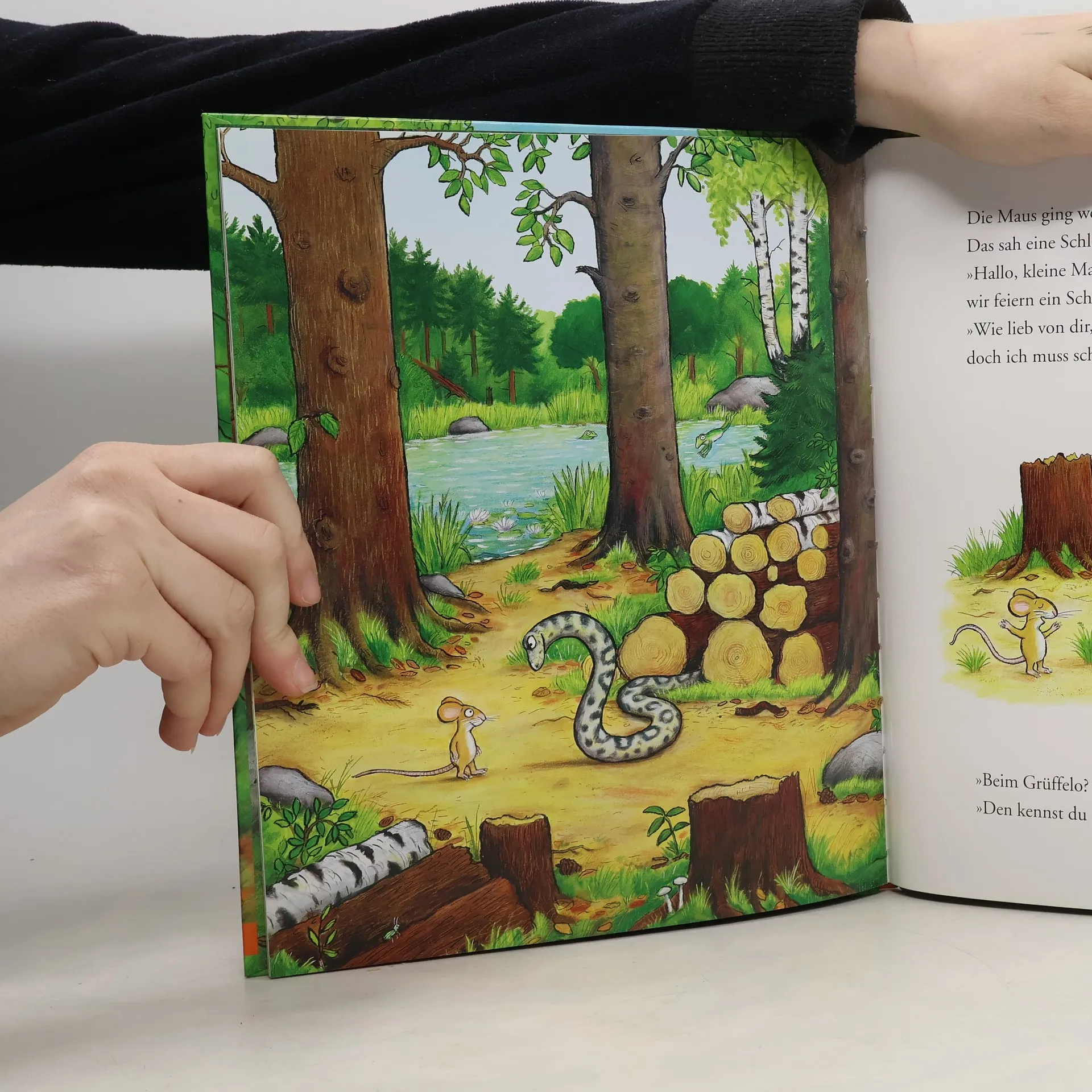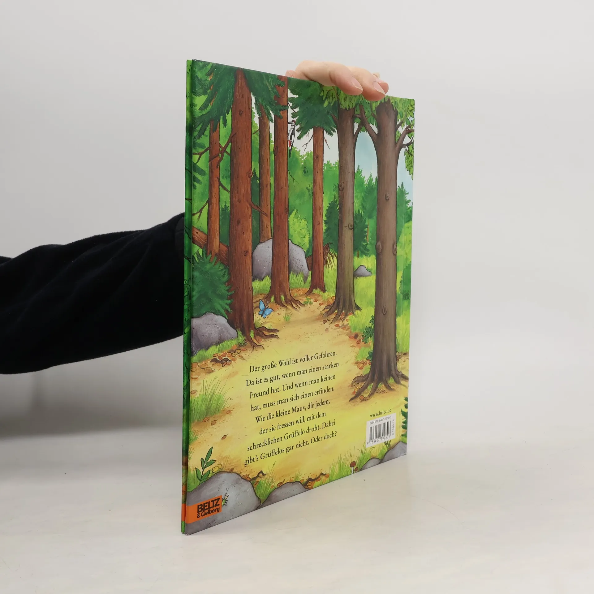 Der große Wald ist voller Gefahren. Da ist es gut, wenn man einen starken Freund hat. Und wenn man keinen hat, erfindet man sich eben einen. Die kleine Maus ist unterwegs im Wald und alle scheinen es gut mit ihr zu meinen. Der Fuchs lädt sie zur Götterspeise ein, die Eule bittet zum Tee und die Schlange zum Schlangen-Mäuse-Fest. Aber die Maus hat immer schon eine Verabredung: mit ihrem Freund, dem schrecklichen Grüffelo. Den hat sie sich zwar nur ausgedacht, aber wenn sie ihn ihren Möchte-gern-Gastgebern beschreibt, wollen die doch lieber alleine speisen. Der Grüffelo ist ein praktischer ausgedachter Freund! - Doch dann taucht er auf einmal wirklich auf, und sein Lieblingsschmaus, sagt er, ist Butterbrot mit kleiner Maus. Das ist nicht so praktisch. Aber was eine clevere kleine Maus ist, die lehrt auch einen Grüffelo in echt das Fürchten.