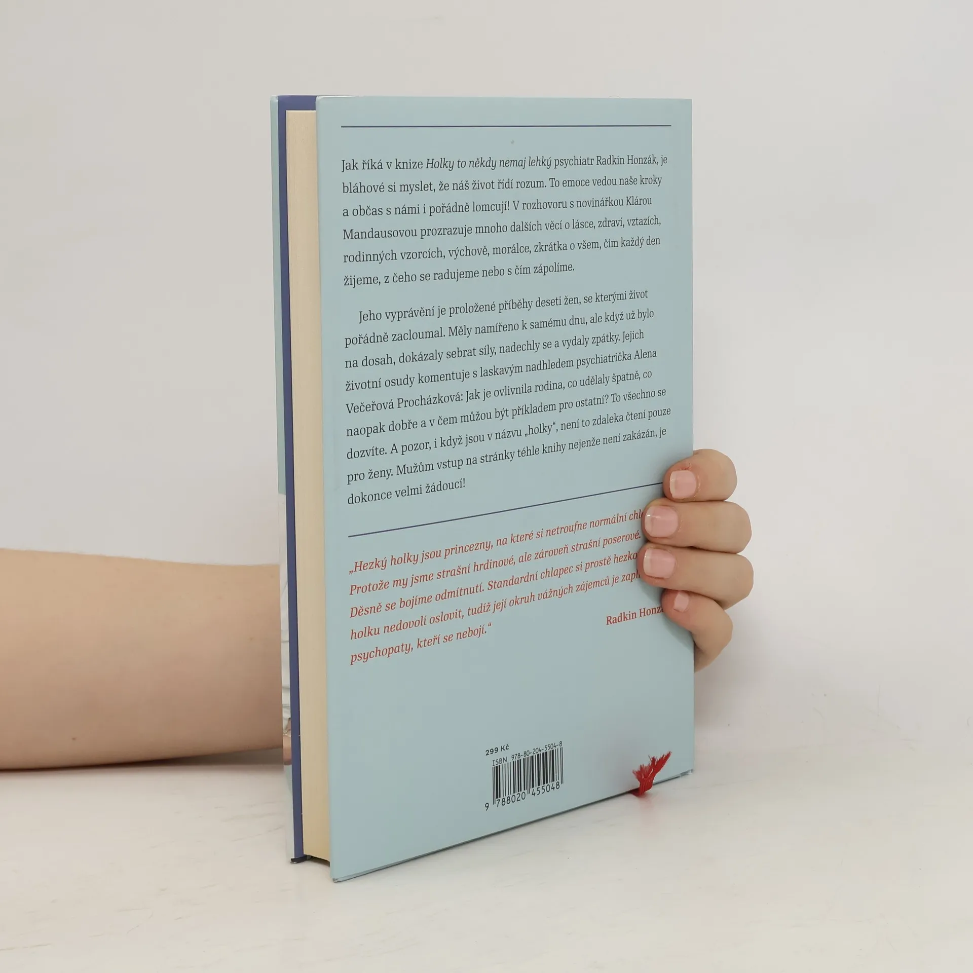 Říká se, že žena vydrží víc než kůň. A kolik toho vlastně vydrží kůň? Hodně, i když se někdy splaší, začne vyvádět a občas jde dokonce hlavou proti zdi. Ať to stojí, co to stojí. Jak říká v knize Holky to někdy nemaj lehký psychiatr Radkin Honzák, je bláhové si myslet, že náš život řídí rozum. Jsou to emoce, co vedou naše kroky a občas s námi i pořádně lomcují! V rozhovoru s novinářkou Klárou Mandausovou prozrazuje mnoho dalších věcí o lásce, zdraví, vztazích, rodinných vzorcích, výchově, morálce, zkrátka o všem, čím každý den žijeme, z čeho se radujeme nebo s čím zápolíme. Jeho vyprávění je proložené příběhy deseti žen, se kterými život pořádně zacloumal. Měly namířeno k samému dnu, ale když už bylo na dosah, dokázaly sebrat síly, nadechly se a vydaly zpátky. Jejich životní osudy komentuje s laskavým nadhledem psychiatrička Alena Večeřová Procházková: Jak je ovlivnila rodina, co udělaly špatně, co naopak dobře a v čem můžou být příkladem pro ostatní? To všechno se dozvíte. A pozor, i když jsou v názvu holky, není to zdaleka čtení pouze pro ženy. Mužům vstup na stránky téhle knihy nejenže není zakázán, je dokonce velmi žádoucí! Je vám, pánové, přece jasné, že rčení o koni a výdrži, platí i pro vás?