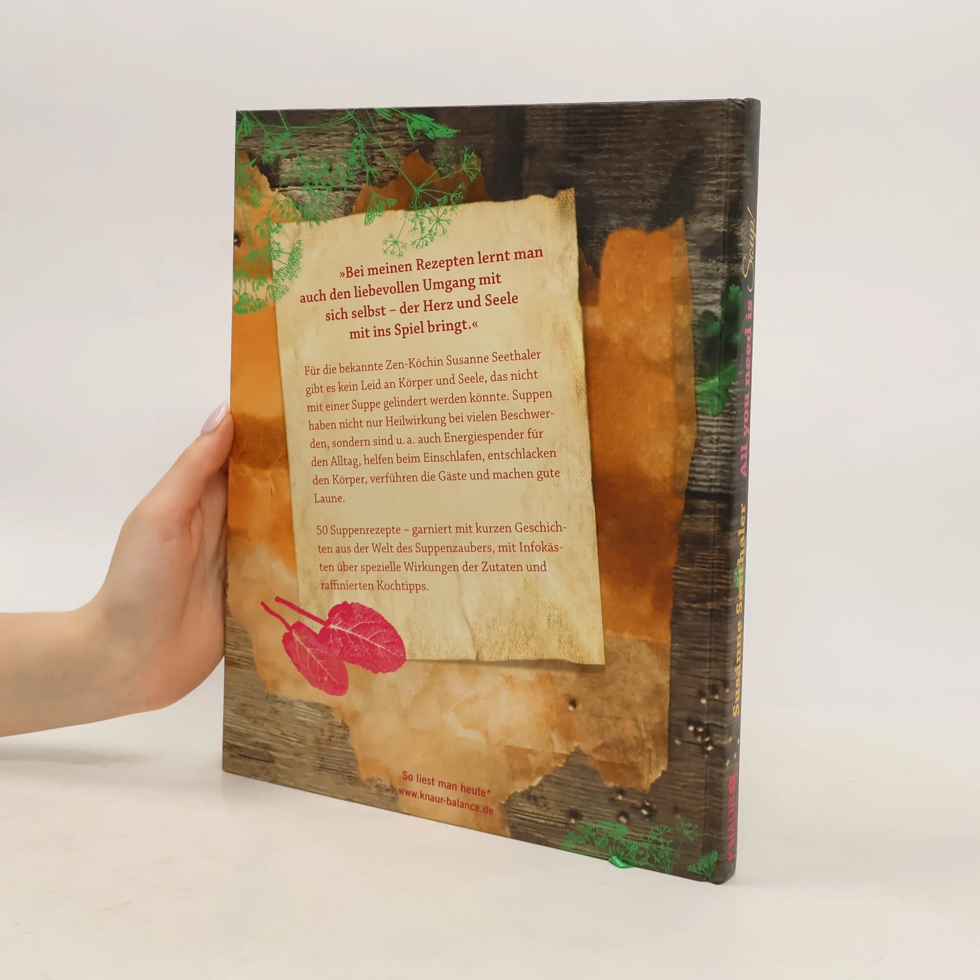 Das lifestylige Suppen-Kochbuch der bekannten Zen-Köchin. Die 50 Suppen-Rezepte von Susanne Seethaler helfen in allen Lebenslagen und nähren Körper und Seele. Eine klare Kartoffel-Suppe bringt gute Laune ins Büro, bei Stress hilft eine vegetarische Wohlfühl-Suppe. Bei Schlafproblemen schenkt eine Johannisbeeren-Suppe eine ruhige Nacht. Ob für angespannte Nerven, einen nervösen Magen, eine Schnupfnase oder schlicht zum Schwelgen mit Glücks-Suppen aus Kindertagen: die kreativen Koch-Ideen der leidenschaftlichen Genuss-Köchin zeigen, dass gesundes Essen die beste Medizin ist. Zur Ruhe kommt man beim Kochen mit den Ideen aus der Achtsamkeits-Küche: dem meditativen Start in den Tag mit Buddhas Frühstücks-Süppchen oder dem Power-Yoga-Gemüsetopf für eine bessere Konzentration. Mit Vanille und Honigmandeln wird eine Verführungs-Suppe für sexy Stunden zu zweit verfeinert. Und wenn’s nicht klappt, hilft bei Liebeskummer eine heiße Brühe mit Bergkäse-Knödeln. Persönliche Geschichten zur Herkunft der Rezepte und Begegnungen aus der Welt des Suppen-Zaubers verbinden die einzelnen Rezepte. Die Koch-Anleitungen vermitteln die Freude der Zubereitung, eine Wertschätzung der Zutaten und geben Informationen zur Heilkraft und Energie der Inhaltsstoffe. Für Susanne Seethaler gibt es kein körperliches oder seelisches Leid, das nicht durch eine Suppe gelindert werden könnte: All you need is soup!