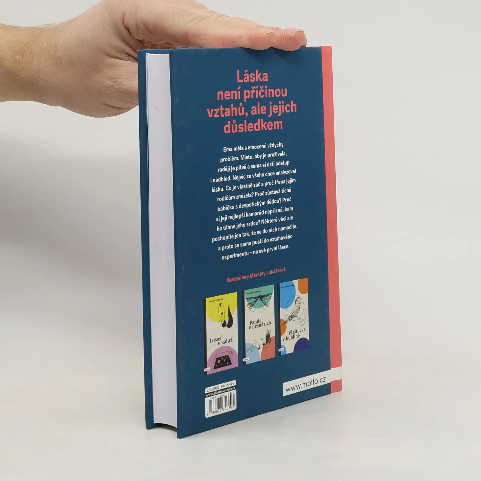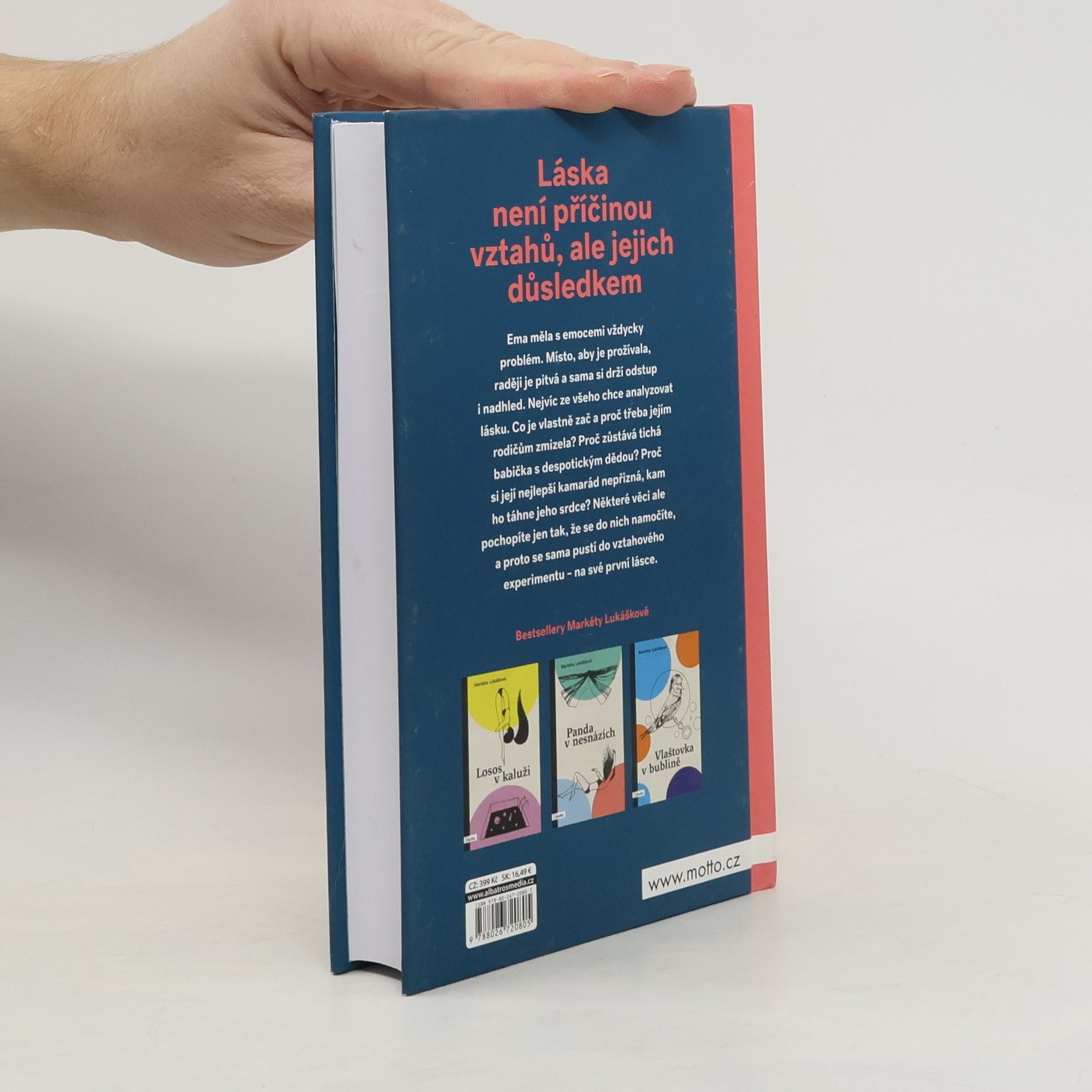 Láska není příčinou vztahů, ale jejich důsledkem Nový samostatný román Markéty Lukáškové. Se svou prvotinou Losos v kaluži objela republiku v rámci divadelního projektu Listování a napsala podle ní scénář, který nyní čeká na filmové zpracování. Po Lososovi následovaly knihy Panda v nesnázích, InTyMně a Vlaštovka v bublině. Skrze své tituly se Markéta snaží šířit osvětu o vnímání psychických problémů. Ema měla s emocemi vždycky problém. Místo, aby je prožívala, raději je pitvá a sama si drží odstup i nadhled. Nejvíc ze všeho chce analyzovat lásku. Co je vlastně zač a proč třeba jejím rodičům zmizela? Proč zůstává tichá babička s despotickým dědou? Proč si její nejlepší kamarád nepřizná, kam ho táhne jeho srdce? Některé věci ale pochopíte jen tak, že se do nich namočíte, a proto se sama pustí do vztahového experimentu – na své první lásce.