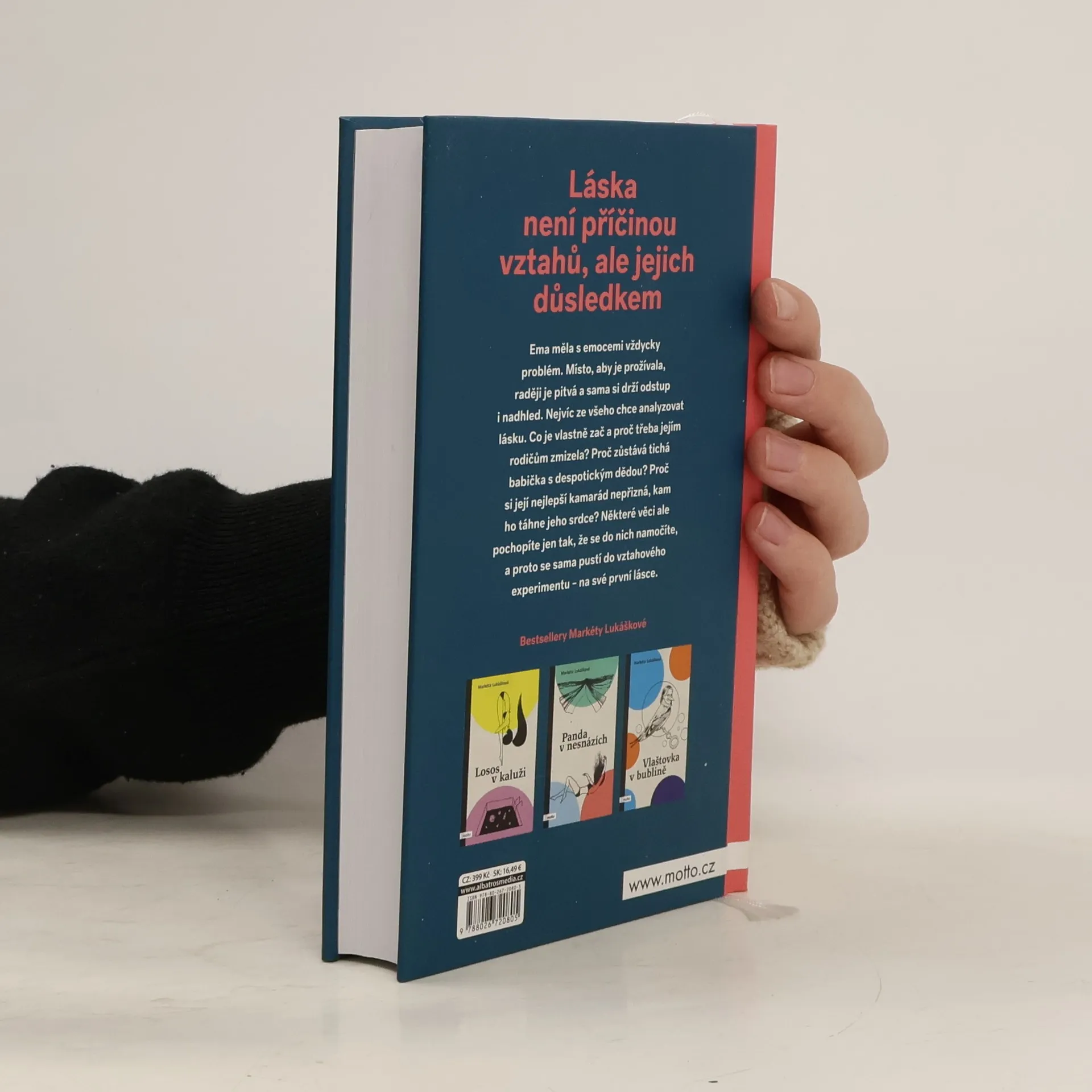Láska není příčinou vztahů, ale jejich důsledkem Nový samostatný román Markéty Lukáškové. Se svou prvotinou Losos v kaluži objela republiku v rámci divadelního projektu Listování a napsala podle ní scénář, který nyní čeká na filmové zpracování. Po Lososovi následovaly knihy Panda v nesnázích, InTyMně a Vlaštovka v bublině. Skrze své tituly se Markéta snaží šířit osvětu o vnímání psychických problémů. Ema měla s emocemi vždycky problém. Místo, aby je prožívala, raději je pitvá a sama si drží odstup i nadhled. Nejvíc ze všeho chce analyzovat lásku. Co je vlastně zač a proč třeba jejím rodičům zmizela? Proč zůstává tichá babička s despotickým dědou? Proč si její nejlepší kamarád nepřizná, kam ho táhne jeho srdce? Některé věci ale pochopíte jen tak, že se do nich namočíte, a proto se sama pustí do vztahového experimentu – na své první lásce.
