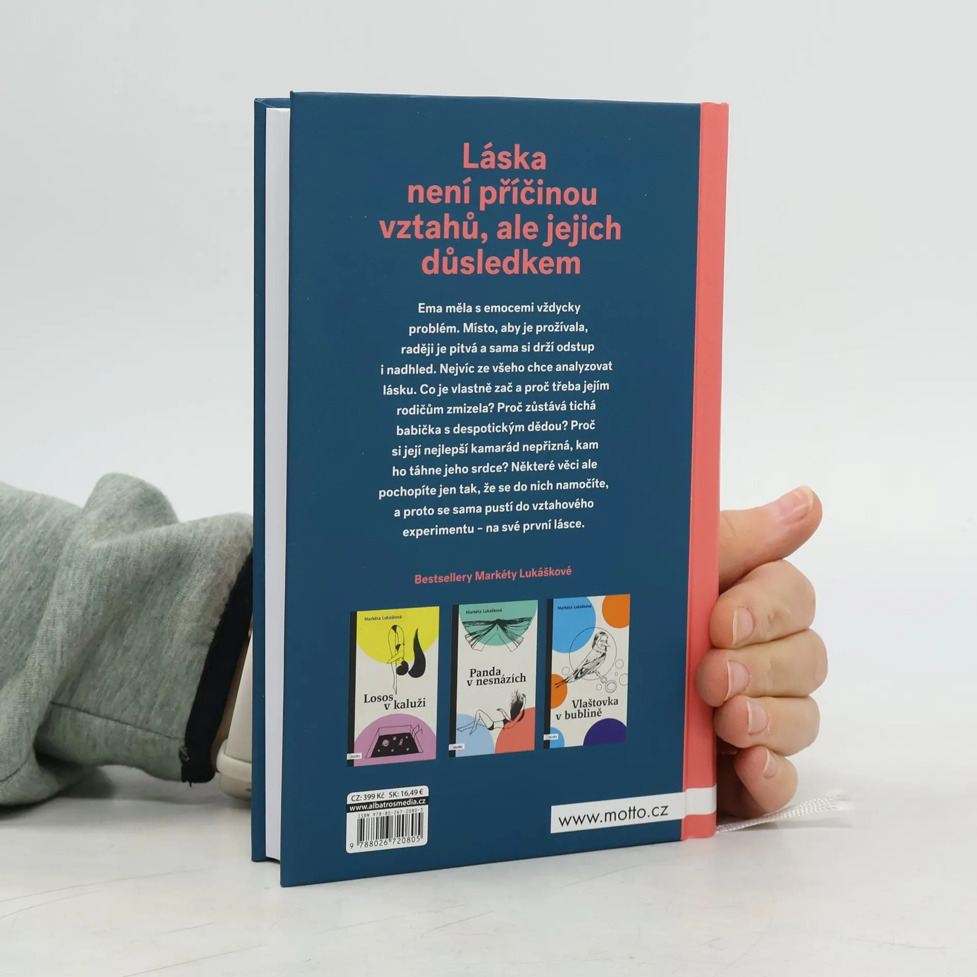 Láska není příčinou vztahů, ale jejich důsledkem Nový samostatný román Markéty Lukáškové. Se svou prvotinou Losos v kaluži objela republiku v rámci divadelního projektu Listování a napsala podle ní scénář, který nyní čeká na filmové zpracování. Po Lososovi následovaly knihy Panda v nesnázích, InTyMně a Vlaštovka v bublině. Skrze své tituly se Markéta snaží šířit osvětu o vnímání psychických problémů. Ema měla s emocemi vždycky problém. Místo, aby je prožívala, raději je pitvá a sama si drží odstup i nadhled. Nejvíc ze všeho chce analyzovat lásku. Co je vlastně zač a proč třeba jejím rodičům zmizela? Proč zůstává tichá babička s despotickým dědou? Proč si její nejlepší kamarád nepřizná, kam ho táhne jeho srdce? Některé věci ale pochopíte jen tak, že se do nich namočíte, a proto se sama pustí do vztahového experimentu – na své první lásce.