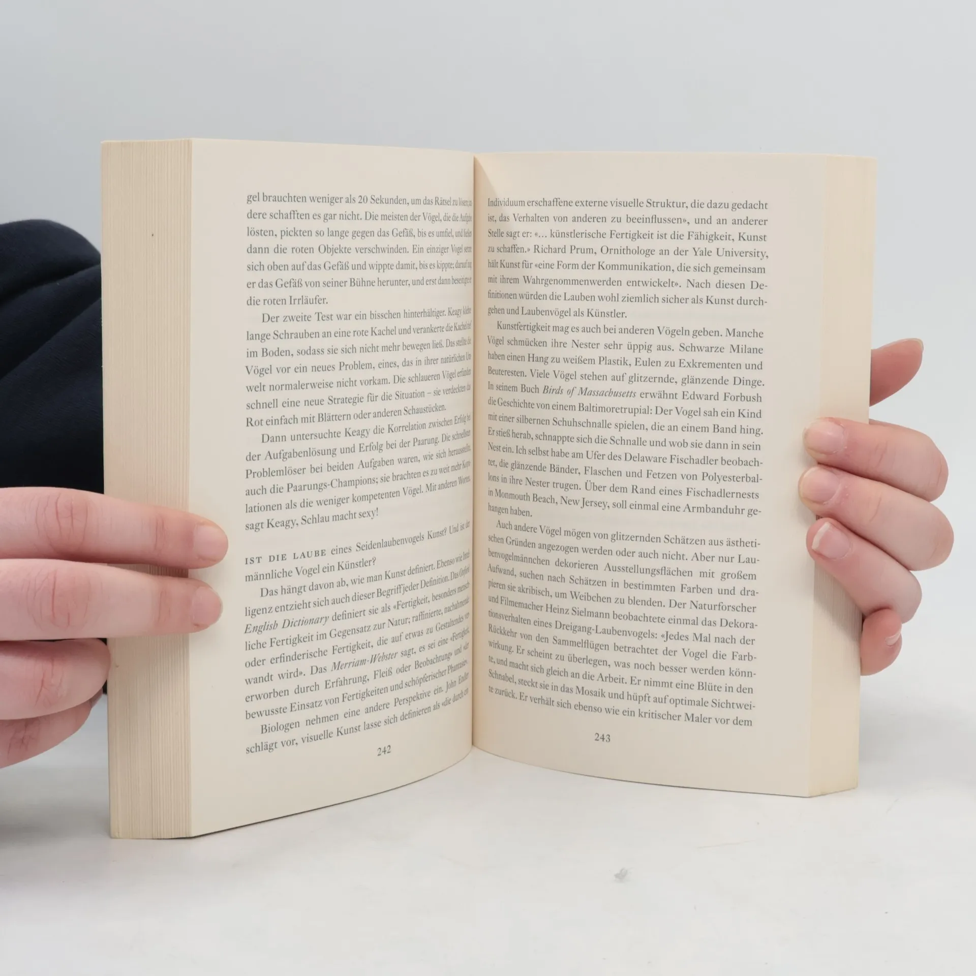 Eines der beeindruckendsten Naturbücher der letzten Jahre! Vögel sind erstaunlich intelligente Wesen: Sie überqueren Kontinente, ohne nach dem Weg zu fragen, erinnern sich an die Vergangenheit und planen für die Zukunft. Ihre kognitiven Fähigkeiten stehen denen von Primaten in nichts nach. Neben technischer Kompetenz zeigen sie auch beeindruckende soziale Intelligenz: Sie täuschen, manipulieren, machen Geschenke und trösten einander – alles mit einem Gehirn kleiner als eine Walnuss. Jennifer Ackerman, begeisterte Vogelbeobachterin, begibt sich auf Entdeckungsreise zu den Genies der Lüfte. Sie berichtet von ihren Besuchen bei Ornithologen weltweit und versetzt den Leser in Staunen: über die Neukaledoniekrähe, die Werkzeuge zur Futtersuche nutzt, oder den Kiefernhäher, der bis zu 30.000 Samen über große Flächen verteilt und Monate später noch weiß, wo sie sind. Ihr Fazit: Das einzigartige Talent der Vögel zeigt sich in ihrer Fähigkeit, sich an verändernde Lebensumstände anzupassen und innovative Lösungen zu finden. Ackerman verbindet persönliche Anekdoten und Reisereportagen mit neuesten wissenschaftlichen Erkenntnissen – nach der Lektüre sieht man die Wunder der Vogelwelt mit neuen Augen.