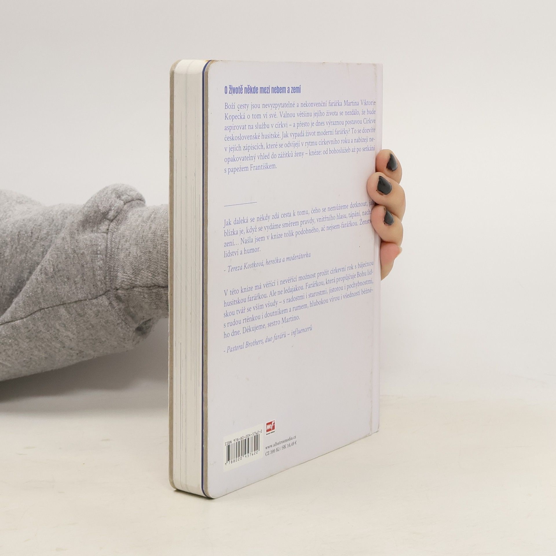 O životě někde mezi nebem a zemí. „Proboha! Tohle všechno se stalo za tři roky?“ Boží cesty jsou nevyzpytatelné a nekonvenční farářka Martina Viktorie Kopecká o tom ví své. Valnou většinu jejího života to nevypadalo, že bude aspirovat na službu v církvi – a přesto je dnes výraznou postavou Církve československé husitské. Knižní vydání blogu Deník farářky přináší zápisky posledních tří let a provádí čtenáře celým církevním rokem, který začíná adventem. Jaké to je být ženou – knězem? Čeho se kvůli službě musela vzdát? O čem přemýšlí, jak podle ní vypadá ráj a co by nám Ježíš pověděl, kdyby žil v dnes? S jakými předsudky se musí v životě vyrovnávat? V knize najdete úvahy, které se zdaleka netočí jen okolo náboženství, ale také vyprávění z cest po světě, příhody možné i dost nemožné, fotky, výstřižky z rozhovorů, vzpomínky na setkání, která mladé farářce bezmála změnila život. Přečtete si také její kázání, sny i otázky, na které není snadné odpovědět. Kniha vznikala v době pandemie, a tak se nevyhýbá ani tématům křehkosti života, smrti a snaze porozumět, co se to v naší společnosti děje, kam se poděla víra i kde hledat pevnou půdu pod nohama.