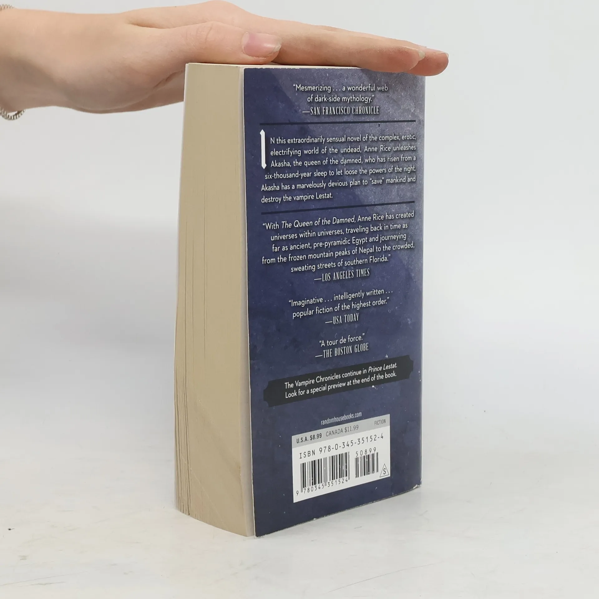 In a feat of virtuoso storytelling, Anne Rice unleashes Akasha, the queen of the damned, who has risen from a six-thousand-year sleep to let loose the powers of the night. Akasha has a marvelously devious plan to “save” mankind and destroy the vampire Lestat—in this extraordinarily sensual novel of the complex, erotic, electrifying world of the undead. Praise for The Queen of the Damned “Mesmerizing . . . a wonderful web of dark-side mythology.”—San Francisco Chronicle “With The Queen of the Damned, Anne Rice has created universes within universes, traveling back in time as far as ancient, pre-pyramidic Egypt and journeying from the frozen mountain peaks of Nepal to the crowded, sweating streets of southern Florida.”—Los Angeles Times “Imaginative . . . intelligently written . . . This is popular fiction of the highest order.”—USA Today “A tour de force.”—The Boston Globe