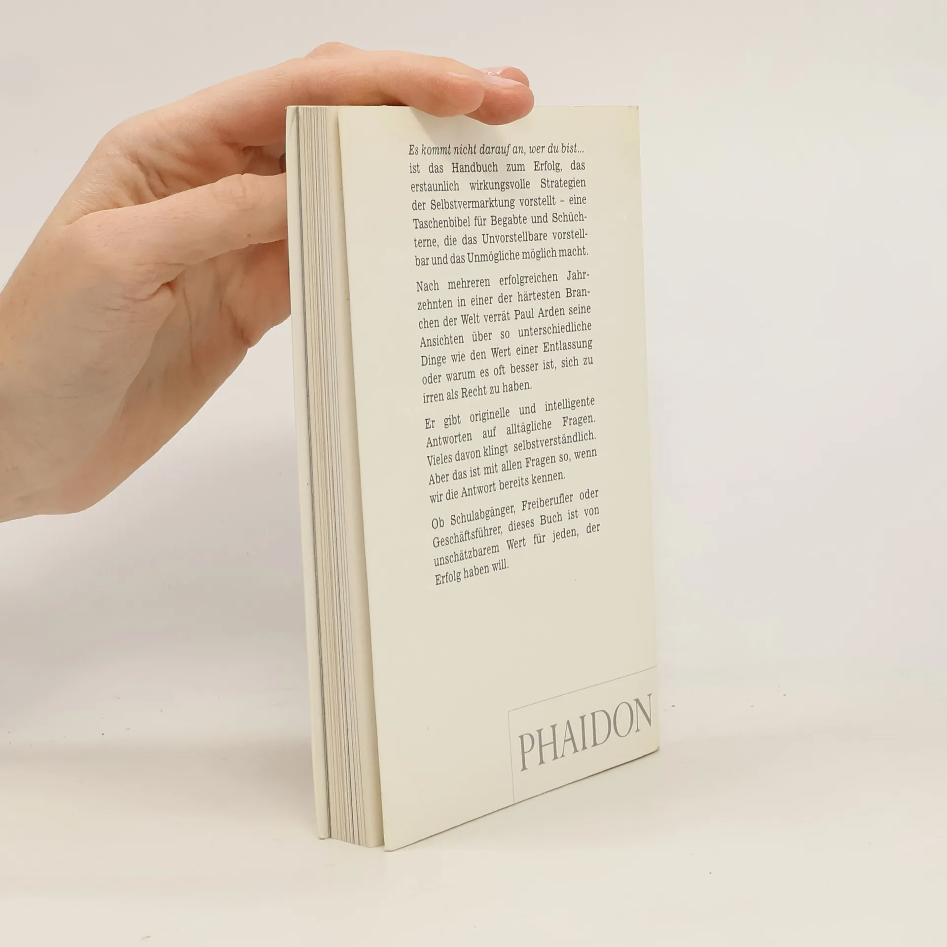 Werbefachmann Paul Arden zeigt in einer kurzen Anleitung, wie man das Beste aus sich machen kannEine Taschenbibel für Begabte und Schüchterne, die das Unvorstellbare vorstellbar und das Unmögliche möglich machtBeleuchtet den Nutzen, den ein Rausschmiss haben kann, und erklärt, warum es oft besser ist, sich zu irren als Recht zu habenEin erbaulicher, humorvoller kleiner Band, der originelle und schlüssige Antworten auf Alltagsfragen bereithält.