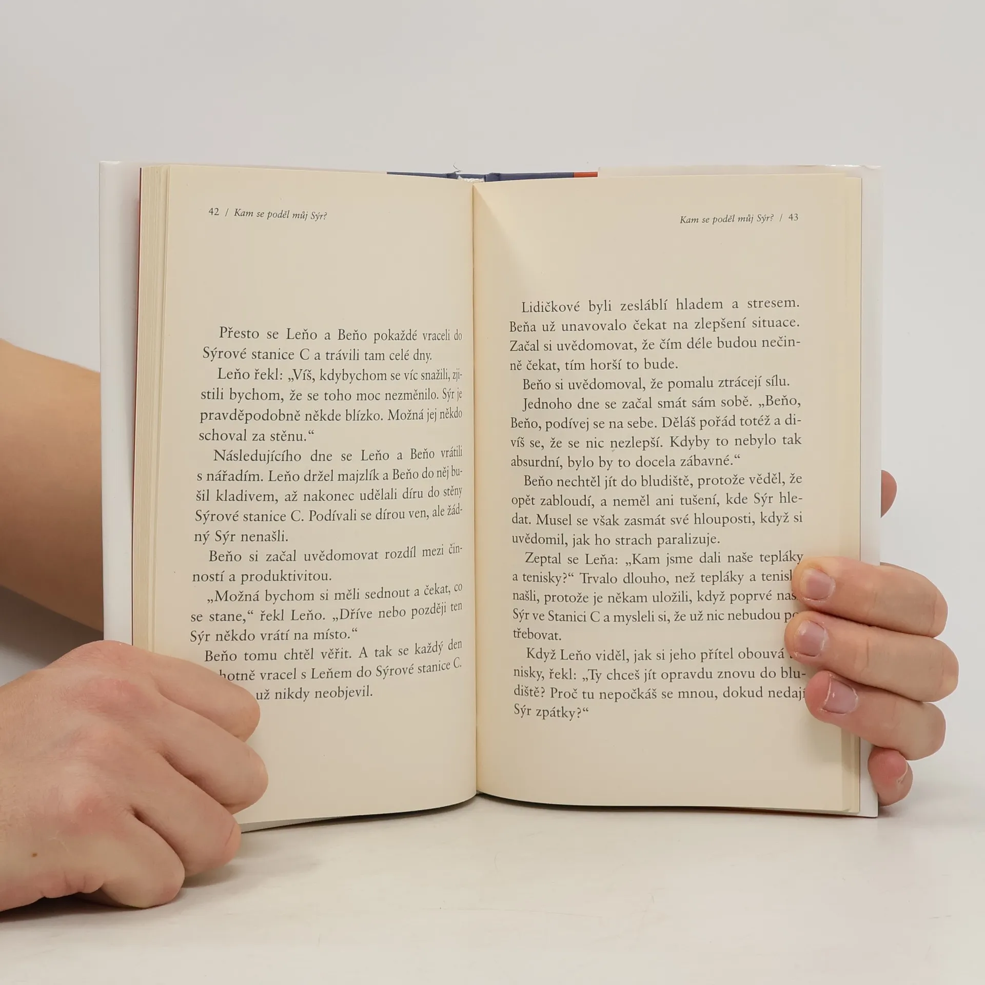 Jedná se o podobenství, které odhaluje hluboké pravdy o změně. Je to zábavný a poučný příběh o čtyřech zajímavých postavičkách, které žijí v „Bludišti“, kde hledají „Sýr“. Sýr je metaforou toho, co v životě chceme, ať už je to zaměstnání, partnerský vztah, peníze, dům, svoboda, dobré zdraví, společenské uznání nebo duševní vyrovnanost. Bludiště je místo, kde hledáme to, co chceme.