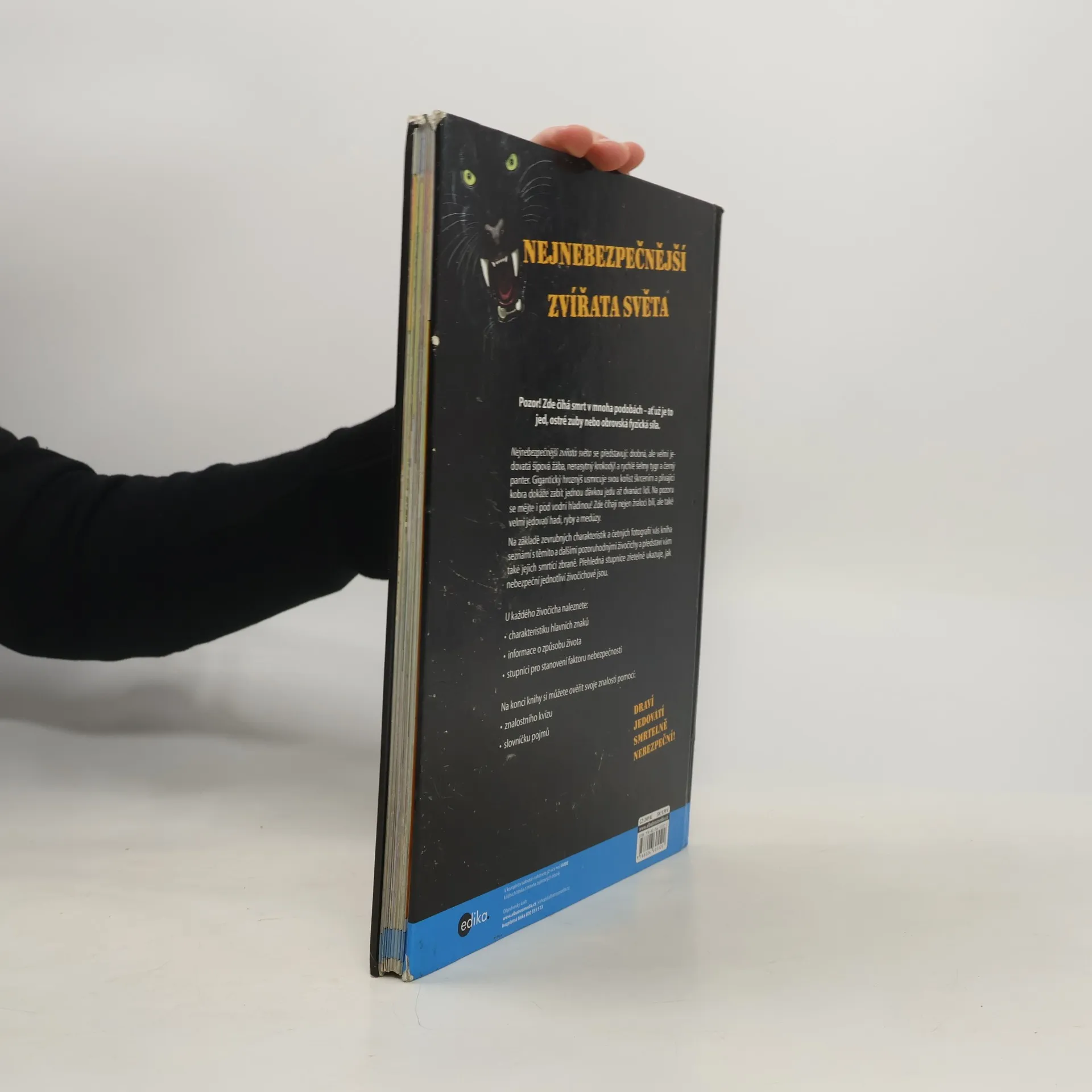 Nejnebezpečnější zvířata světa se představují: drobná, ale velmi jedovatá šípová žába, nenasytný krokodýl a rychlé šelmy tygr a černý panter. Gigantický hroznýš usmrcuje svou kořist škrcením a plivající kobra dokáže zabít jednou dávkou jedu až dvanáct lidí. Na pozoru se mějte i pod vodní hladinou! Zde číhají nejen žraloci bílí, ale také velmi jedovatí hadi, ryby a medúzy. Na základě zevrubných charakteristik a četných fotografií vás kniha seznámí s těmito a dalšími pozoruhodnými živočichy a představí vám také jejich smrticí zbraně. Přehledná stupnice zřetelně ukazuje, jak nebezpeční jednotliví živočichové jsou. U každého živočicha naleznete: charakteristiku hlavních znaků, informace o způsobu života, stupnici pro stanovení faktoru nebezpečnosti. Na konci knihy si můžete ověřit svoje znalosti pomocí znalostního kvízu a slovníčku pojmů.