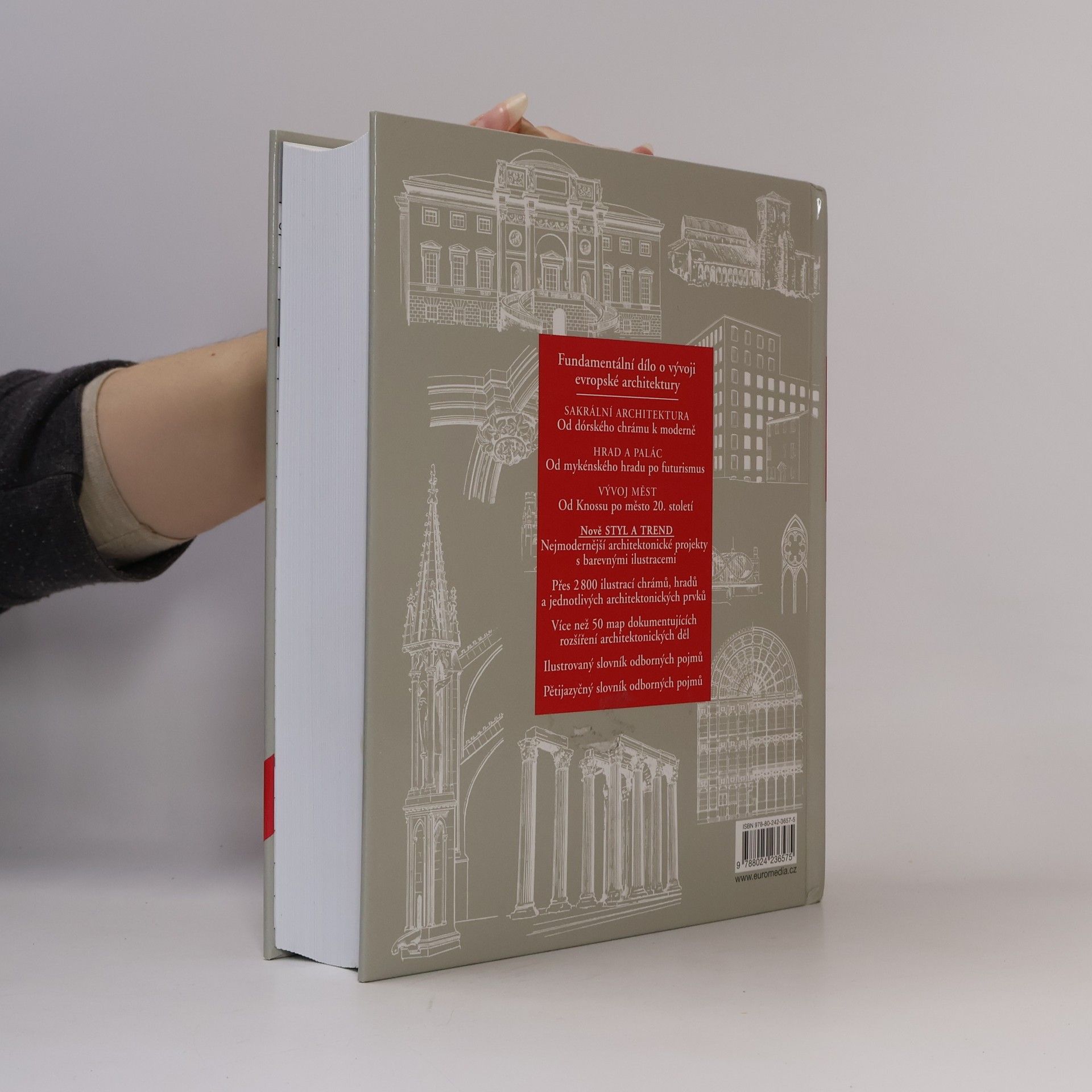 Dějiny evropské architektury od antických dob přes románský a gotický sloh, španělský islám, renesanci a manýrismus, baroko, klasicismus a secesi po současnost. Kniha pojednává o stavebních stylech sakrální architektury, hradů a paláců, měšťanských a veřejných budov i o vývoji měst. Praktická příručka určená laikům i odborníkům je doplněna podrobnými kresbami, mapkami, ilustrovaným slovníkem a cizojazyčnými slovníčky základních pojmů. 3. vydání