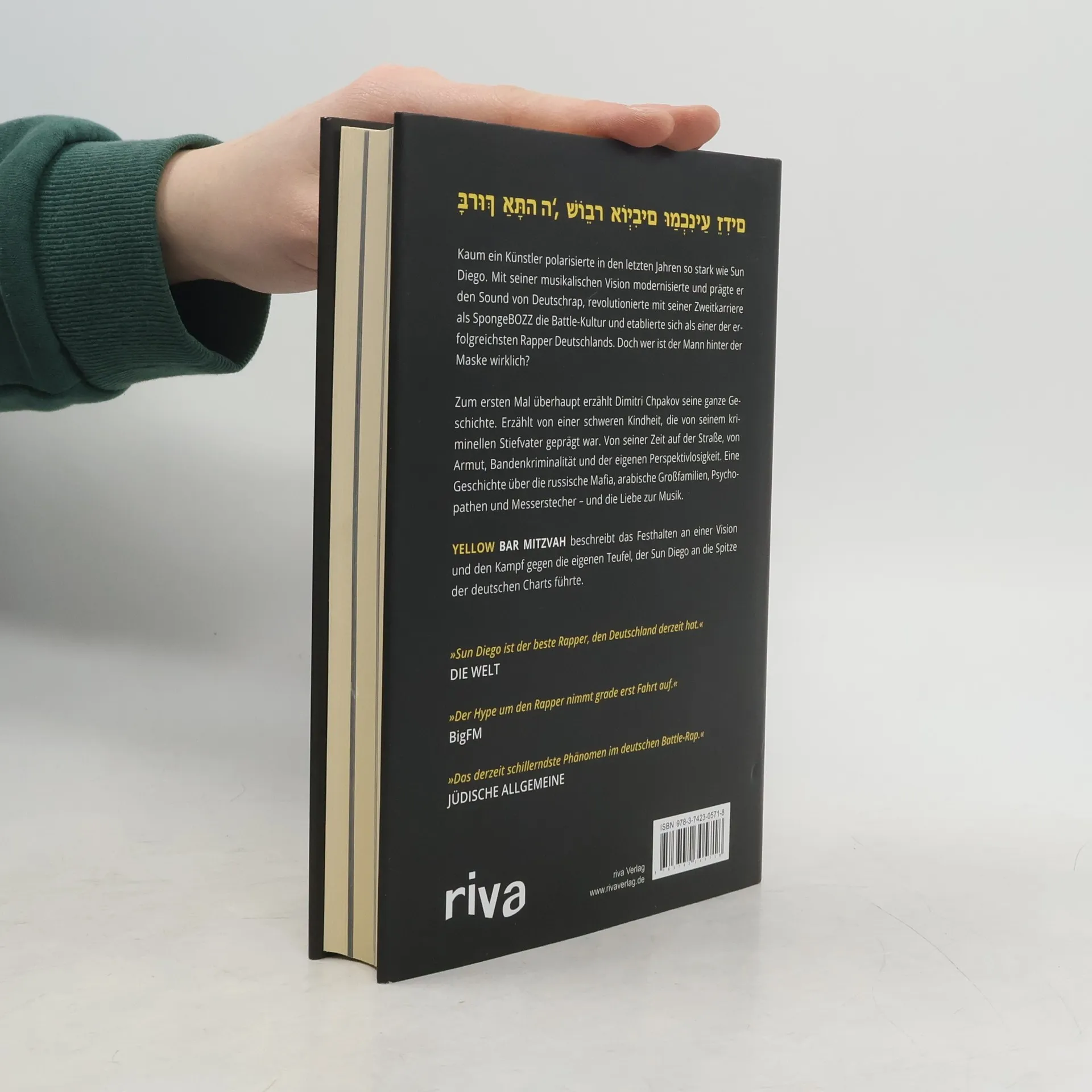 Kaum ein Künstler polarisierte in den letzten Jahren so stark wie Sun Diego. Mit seiner musikalischen Vision modernisierte und prägte er den Sound von Deutschrap, revolutionierte mit seiner Zweitkarriere als SpongeBOZZ die Battle-Kultur und etablierte sich als einer der erfolgreichsten Rapper Deutschlands. Doch wer ist der Mann hinter der Maske wirklich? Zum ersten Mal überhaupt erzählt Dimitri Chpakov seine ganze Geschichte. Erzählt von einer schweren Kindheit, die von seinem kriminellen Stiefvater geprägt war. Von seiner Zeit auf der Straße, von Armut, Bandenkriminalität und der eigenen Perspektivlosigkeit. Eine Geschichte über die russische Mafia, arabische Großfamilien, Psychopathen und Messerstecher – und die Liebe zur Musik. Yellow Bar Mitzvah beschreibt das Festhalten an einer Vision und den Kampf gegen seine eigenen Teufel, der Sun Diego an die Spitze der deutschen Charts führte. »Das derzeit schillerndste Phänomen im deutschen Battle-Rap.« Jüdische Allgemeine »Sun Diego ist der beste Rapper, den Deutschland derzeit hat.« Die Welt »Der Hype um den Rapper nimmt grade erst Fahrt auf.« BigFM