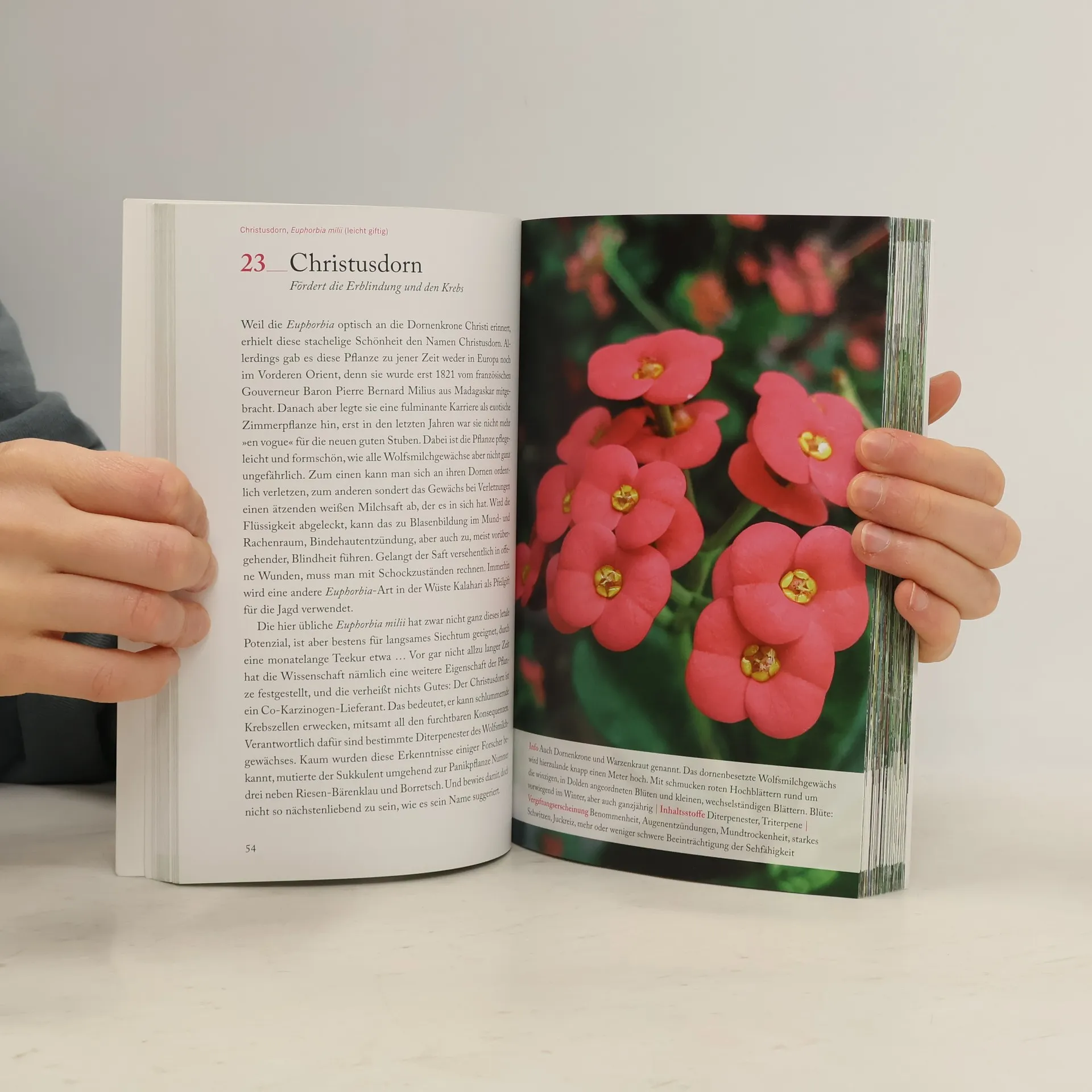 Sie würgen und schmerzen, berauschen und betäuben, sorgen für Wahnvorstellungen, Schweißausbrüche, Atemnot und Herzstillstand – böse Pflanzen und fiese Kräuter. Dennoch sind diese gemeinen botanischen Geschöpfe meist lieblich duftend, angenehm aromatisch oder von betörender Schönheit. Und kommen zudem ganz harmlos daher, im Gartenbeet oder in der Blumenvase, als Zimmerpflanze und Gemüsesuppe. Allein in europäischen Breiten ist die Artenvielfalt pflanzlicher Giftmörder größer als jedes Leichentuch. Wer kleine Kinder, Haustiere oder eine böse Stiefmutter besitzt, sollte jedenfalls ein scharfes Auge auf potenzielle pflanzliche Übeltäter haben – ein Leben kann sehr schnell zu Ende gehen.