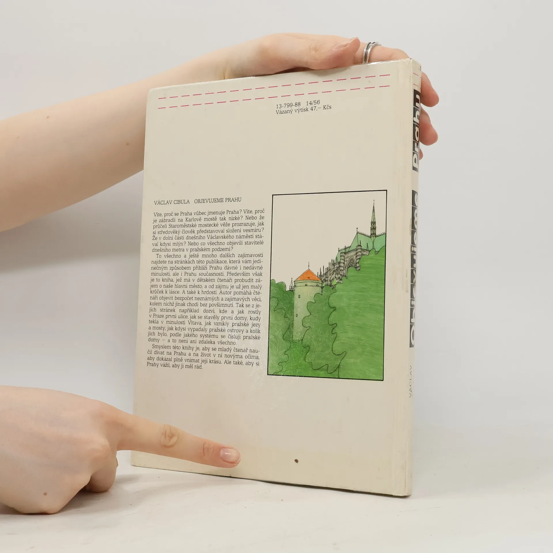 Populárně-naučná publikace přibližuje dětskému čtenáři nejrůznější zajímavosti minulé i současné (80. léta 20. stol.) Prahy. Publikace vybavená řadou barevných ilustrací, fotografií a reprodukcí se pokouší vzbudit zájem mladých čtenářů o Prahu - přitažlivým způsobem jim město přiblížit a přispět k tomu, aby začali vnímat jeho krásu a získali k Praze vztah. V devíti kapitolách se čtenáři dozvědí mimo jiné kde a jak rostly v Praze první ulice, jak se stavěly první domy, kudy tekla v minulosti Vltava, jak vznikly pražské jezy a mosty, jak kdysi vypadaly pražské ostrovy, podle jakého systému se číslují pražské domy, jak dostala Praha své jméno, jak se poznají umělecké slohy pražské architektury, jaké jsou zelené dějiny města, jak vypadá pražská doprava a kulturní život (divadla, kina, rozhlas, televize) i jaké památky jsou v Praze ty nejvýznamnější. - Kniha určená čtenářům od 8 let obsahuje i přehled základní literatury o Praze.