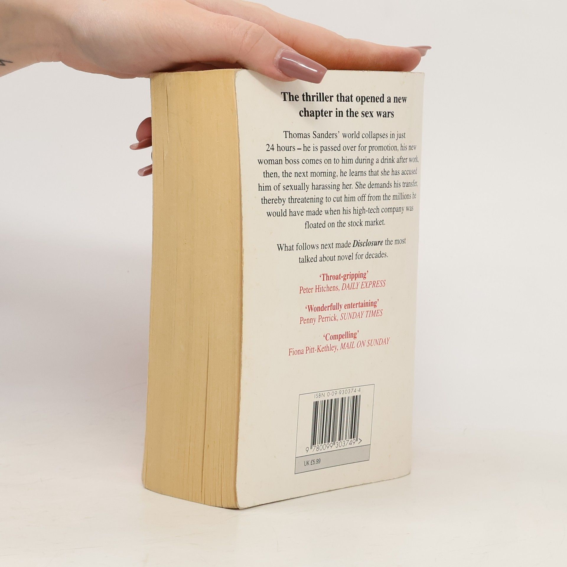 Thomas Sanders' world collapses in just 24 hours - he is passed over for promotion, his new woman boss comes on to him during a drink after work, then, the next morning, he learns that she has accused him of sexually harassing her. She demands his transfer, thereby threatening to cut him off from the millions he would have made when his high-tech company was floated on the stock market.What follow next made Disclosure the most talked about novel of the decade.