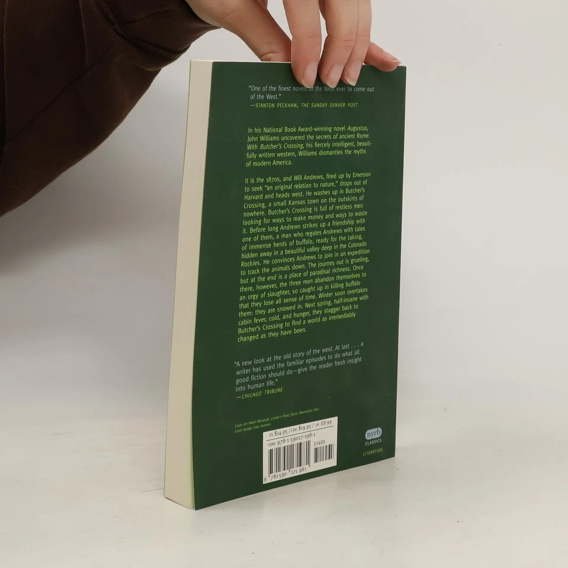 In his National Book Award–winning novel Augustus, John Williams uncovered the secrets of ancient Rome. With Butcher’s Crossing, his fiercely intelligent, beautifully written western, Williams dismantles the myths of modern America.It is the 1870s, and Will Andrews, fired up by Emerson to seek “an original relation to nature,” drops out of Harvard and heads west. He washes up in Butcher’s Crossing, a small Kansas town on the outskirts of nowhere. Butcher’s Crossing is full of restless men looking for ways to make money and ways to waste it. Before long Andrews strikes up a friendship with one of them, a man who regales Andrews with tales of immense herds of buffalo, ready for the taking, hidden away in a beautiful valley deep in the Colorado Rockies. He convinces Andrews to join in an expedition to track the animals down. The journey out is grueling, but at the end is a place of paradisal richness. Once there, however, the three men abandon themselves to an orgy of slaughter, so caught up in killing buffalo that they lose all sense of time. Winter soon overtakes them: they are snowed in. Next spring, half-insane with cabin fever, cold, and hunger, they stagger back to Butcher’s Crossing to find a world as irremediably changed as they have been.