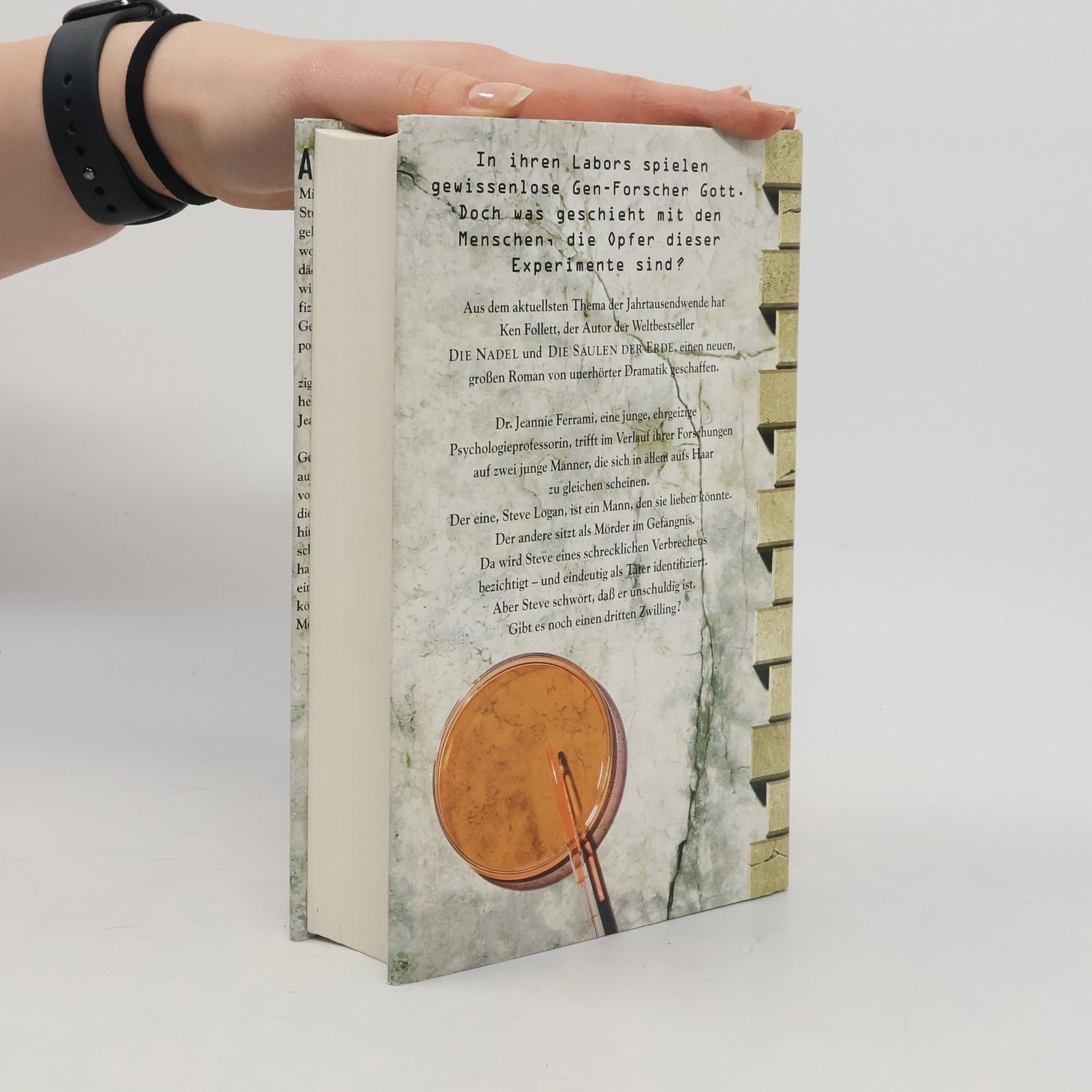 Stellen Sie sich vor, es gibt einen Menschen, der Ihnen aufs Haar gleicht, bis in die kleinste Zelle ... Jeannie Ferrami, eine brillante, ehrgeizige Wissenschaftlerin, die sich mit der Entstehung kriminellen Verhaltens befaßt, entdeckt ein solches Paar genetischer Zwillinge. Der eine, Steve Logan, studiert Jura. Der andere sitzt als Mörder im Gefängnis. Da wird Steve eines schrecklichen Verbrechens bezichtigt - und eindeutig als Täter identifiziert. Aber Steve ist unschuldig. Gibt es noch einen dritten Zwilling? Wie in seinen historischen Meisterwerken zeigt Ken Follett auch seinem neuen Roman das dramatische Schicksal von Menschen in ihrer Zeit - diesmal mit einem brandaktuellen Thema von heute.