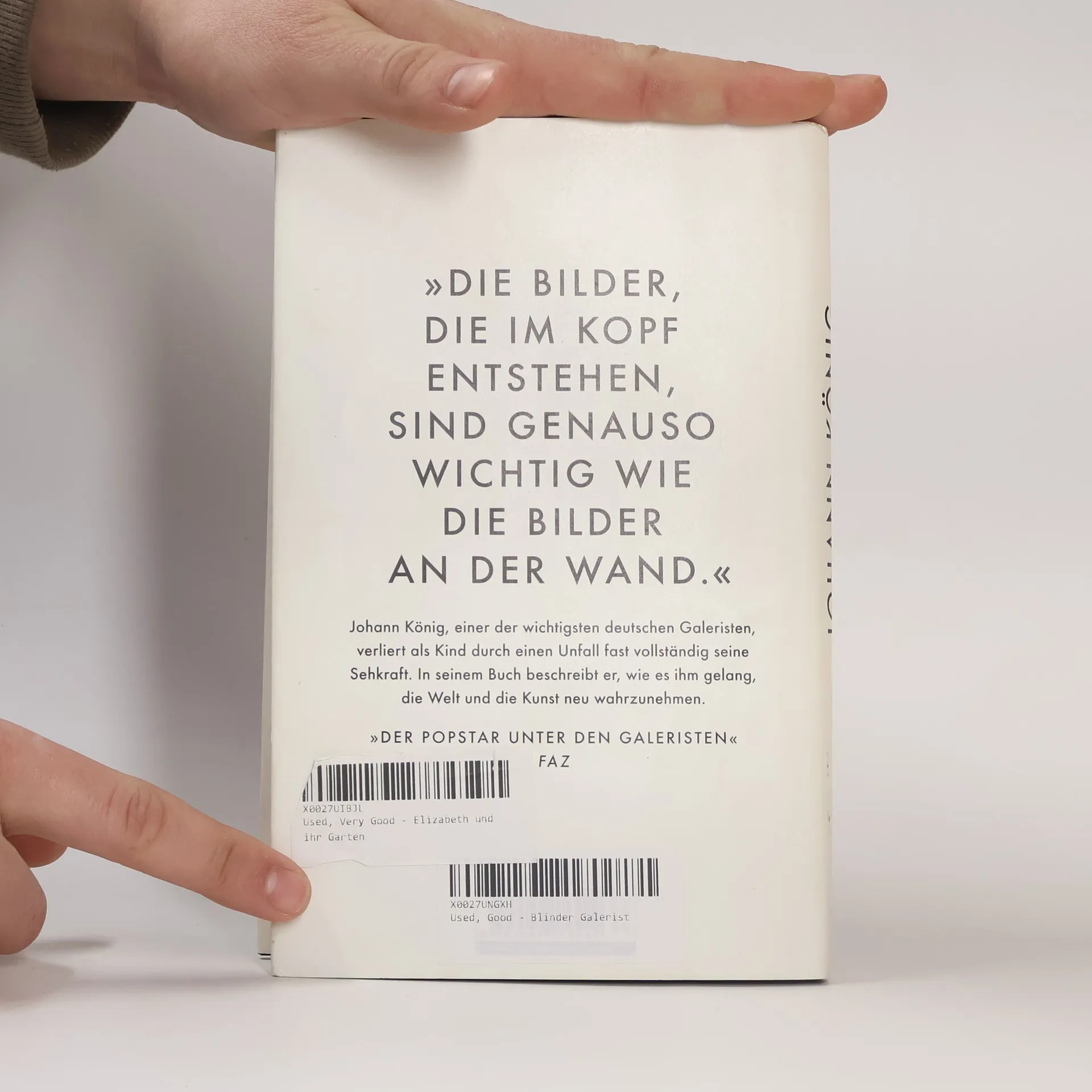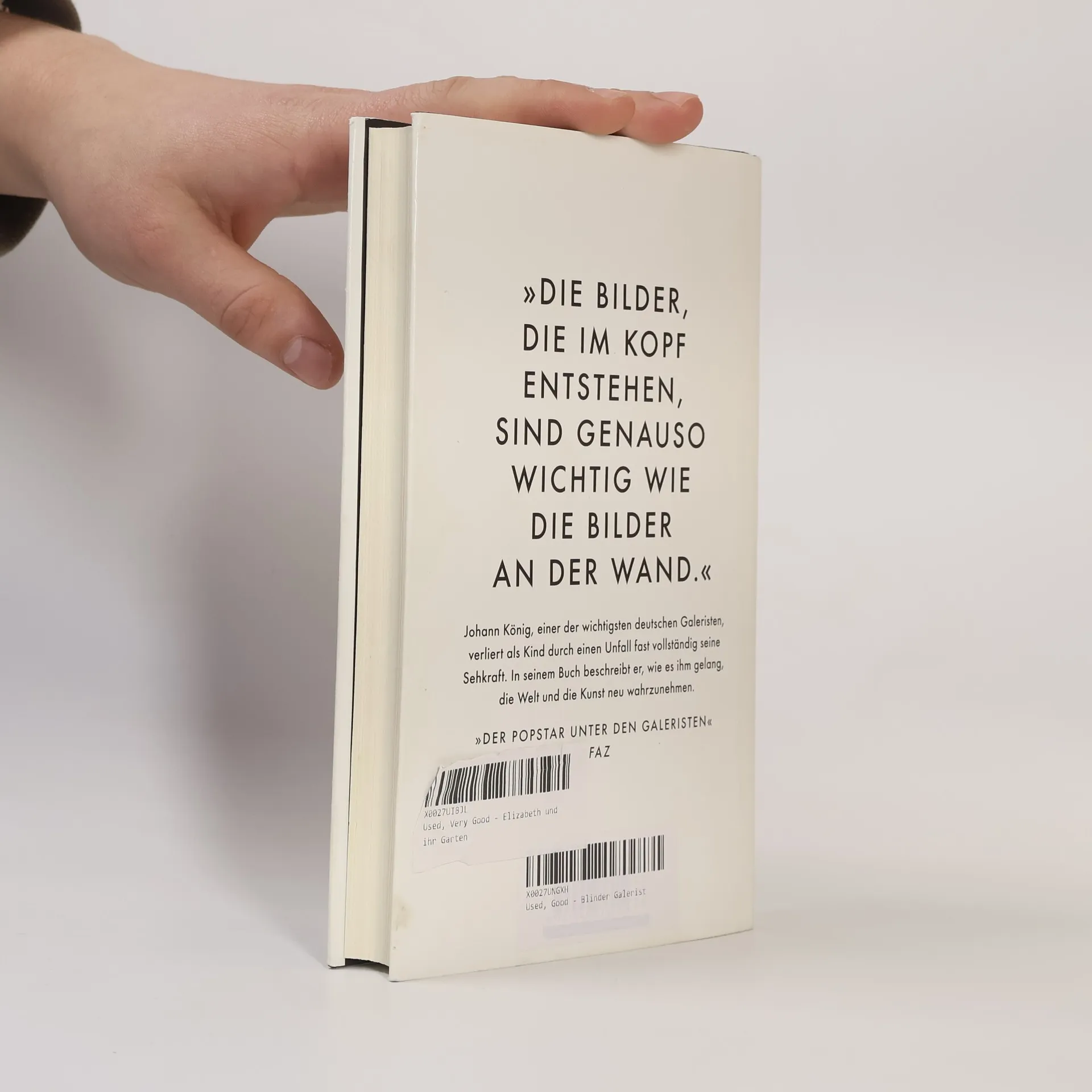 »DIE BILDER, DIE IM KOPF ENTSTEHEN, SIND GENAUSO WICHTIG WIE DIE BILDER AN DER WAND.« Johann König, einer der wichtigsten deutschen Galeristen, verliert als Kind durch einen Unfall fast vollständig seine Sehkraft. In seinem Buch beschreibt er, wie es ihm gelang, die Welt und die Kunst neu wahrzunehmen. »DER POPSTAR UNTER DEN GALERISTEN« FAZ Andy Warhol, Isa Genzken, On Kawara, Rosemarie Trockel – von Kindheit an ist Johann König umgeben von großen Künstlern und ihrer Kunst. Mit zwanzig gründet er eine Galerie, obwohl er kaum etwas sieht. Was bedeutet es, nicht sehen zu können und Galerist zu werden? Wie kann man sich Kunst erschließen, wenn man sich auf seine Augen nicht verlassen kann? Was ist Sehen überhaupt, wenn die Welt um einen herum verschwimmt? Als Kind bekommt Johann König von Gerhard Richter Indianerkassetten geschenkt. Sein Vater Kasper nimmt ihn mit in die Städelschule und nach New York in das Atelier von Jeff Koons. Ein tragischer Unfall mit zwölf Jahren wirft ihn komplett aus der Bahn. Am tiefsten Punkt erkennt er, dass Kunst seine Rettung ist. In einer Betonkirche aus den Sechzigern betreibt er heute eine der spektakulärsten Galerien Deutschlands.