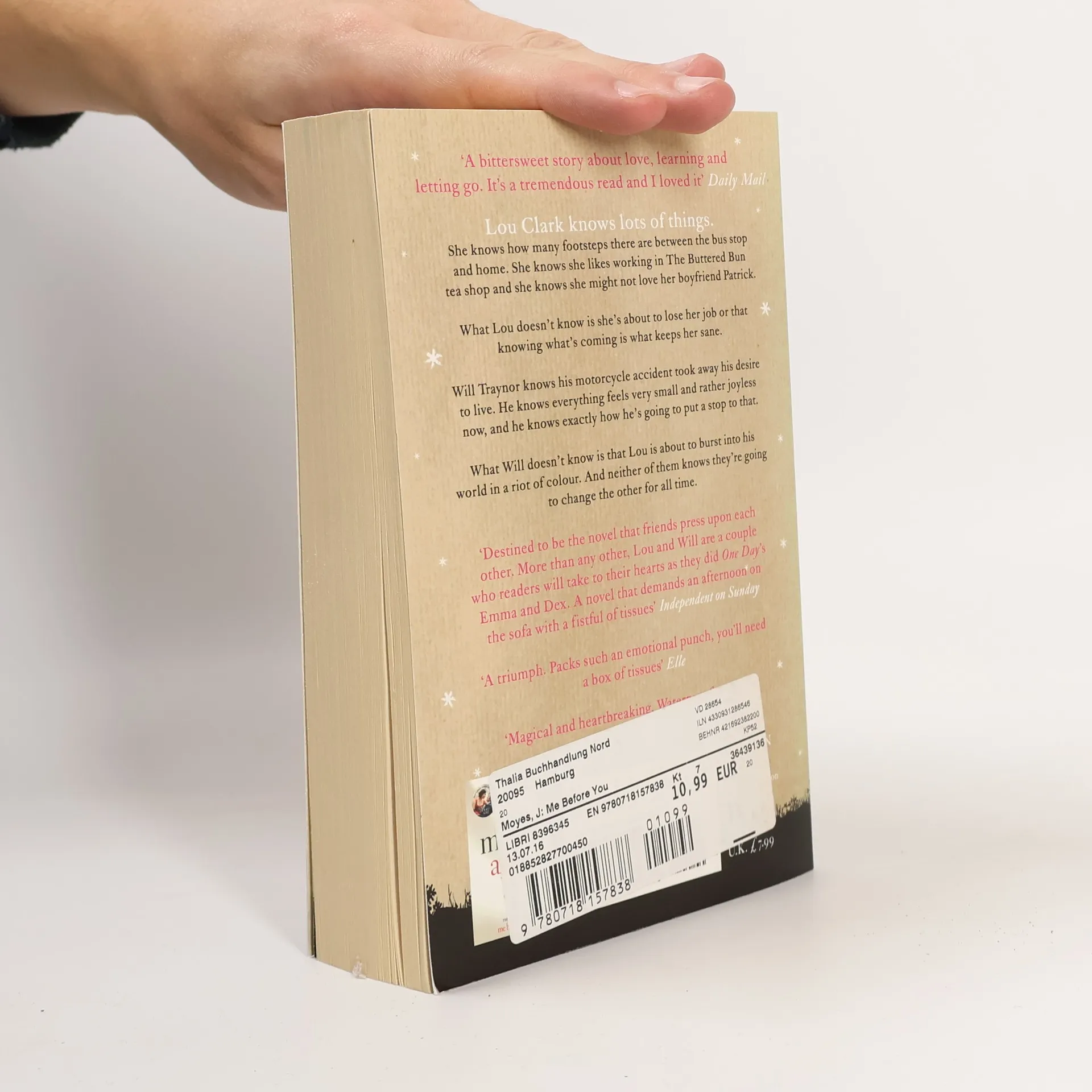 Lou Clark knows lots of things. She knows how many footsteps there are between the bus stop and home. She knows she likes working in The Buttered Bun tea shop and she knows she might not love her boyfriend Patrick. What Lou doesn't know is she's about to lose her job or that knowing what's coming is what keeps her sane. Will Traynor knows his motorcycle accident took away his desire to live. He knows everything feels very small and rather joyless now and he knows exactly how he's going to put a stop to that. What Will doesn't know is that Lou is about to burst into his world in a riot of colour. And neither of them knows they're going to change the other for all time.