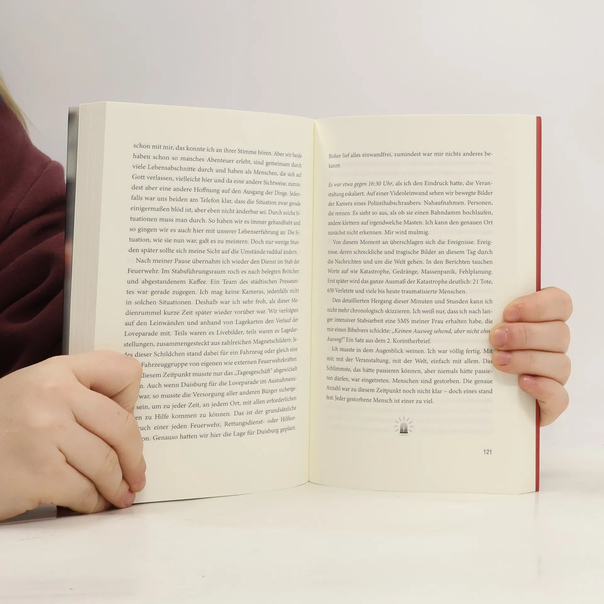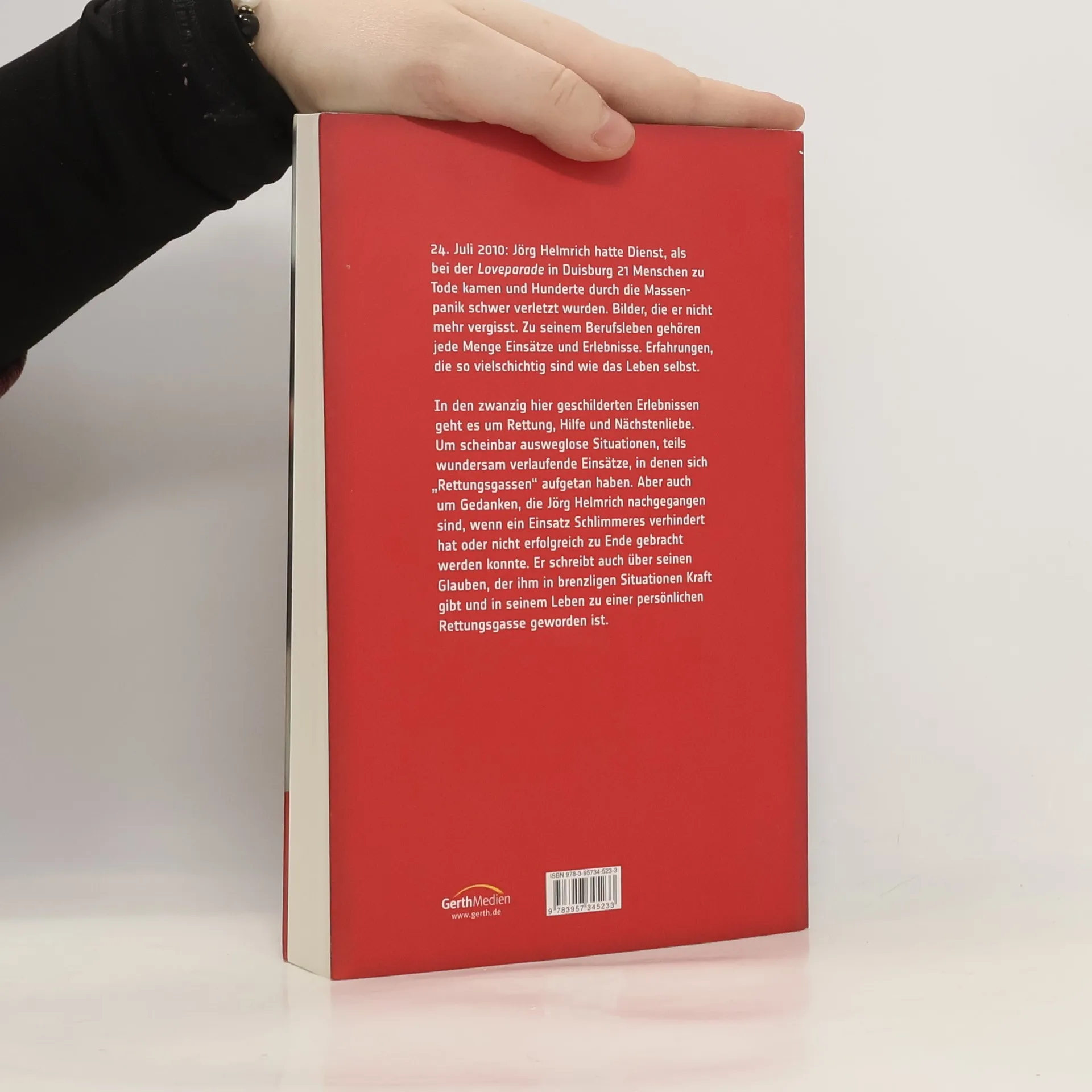 24. Juli 2010: Jörg Helmrich hatte Dienst, als bei der Loveparade in Duisburg 21 Menschen zu Tode kamen und Hunderte durch die Massenpanik schwer verletzt wurden. Bilder, die er nicht mehr vergisst. Zu seinem Berufsleben gehören jede Menge Einsätze und Erlebnisse. Erfahrungen, die so vielschichtig sind wie das Leben selbst. In den zwanzig hier geschilderten Erlebnissen geht es um Rettung, Hilfe und Nächstenliebe. Um scheinbar ausweglose Situationen, teils wundersam verlaufende Einsätze, in denen sich „Rettungsgassen“ aufgetan haben. Aber auch um Gedanken, die Jörg Helmrich nachgegangen sind, wenn ein Einsatz Schlimmeres verhindert hat oder nicht erfolgreich zu Ende gebracht werden konnte. Er schreibt auch über seinen Glauben, der ihm in brenzligen Situationen Kraft gibt und in seinem Leben zu einer persönlichen Rettungsgasse geworden ist.