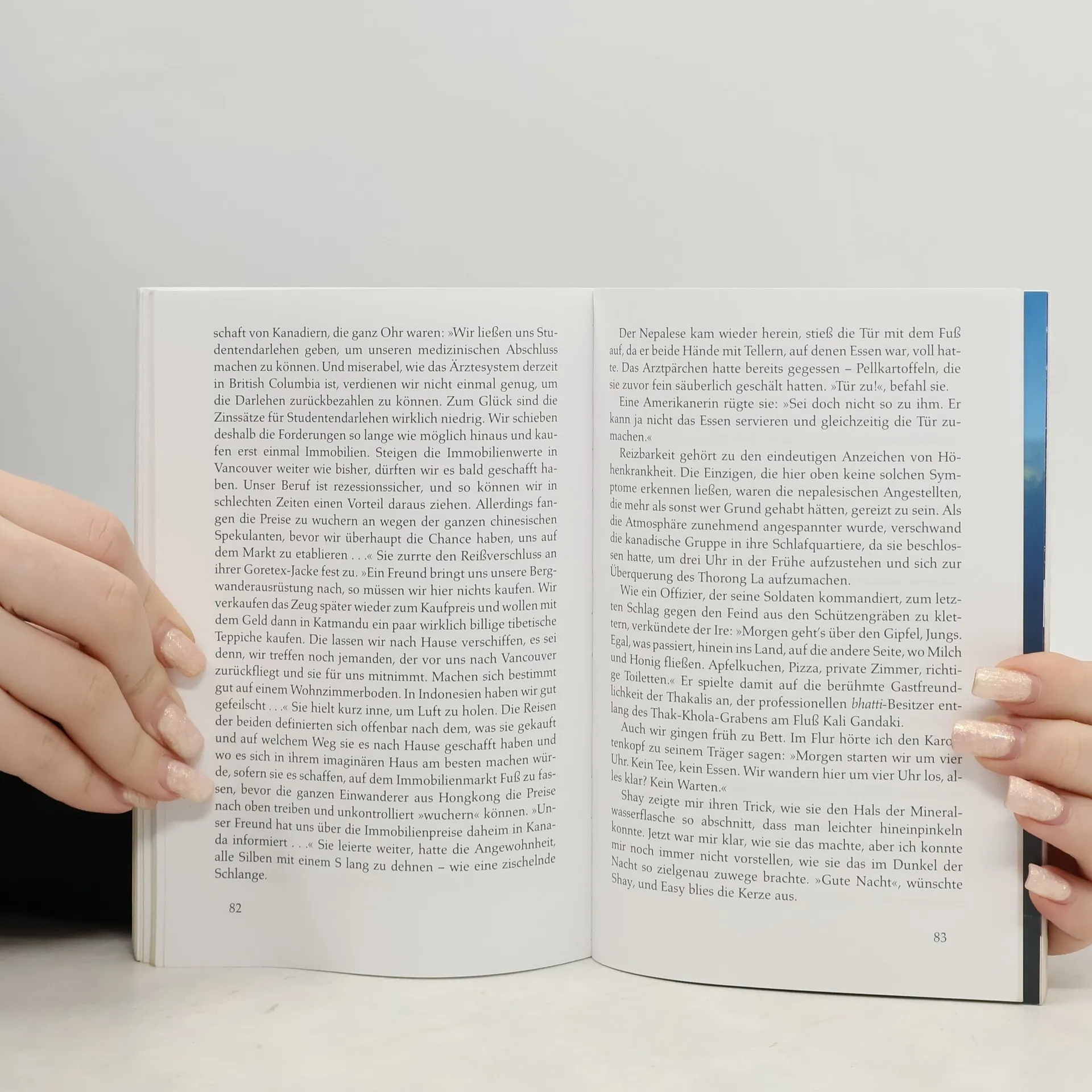 Anfangs hat er große Schwierigkeiten mit der Höhenkrankheit und seinem schweren Rucksack, doch allmählich lebt er sich ein, schließt Freundschaften, die ihm weiterhelfen, körperlich wie auch spirituell. Denn in einer so außergewöhnlichen Natur mit seinen freundlichen, tief gläubigen Menschen öffnet sich einem das Herz, tiefe Gedanken sind möglich. Mehr und mehr wandert er allein, hält sich von den Touristen fern, freundet sich mit Nepalesen an, versucht ihre Lebensart und Lebensweise zu verstehen und kann aus der Distanz das hektische Leben der westlichen Welt mit der Gier nach Luxus und Perfektion kritisch betrachten. Ganz allmählich wird die Reise zu einer inneren Reise. Angenehm bei diesem Bericht ist, dass der Autor sich nicht für etwas Besonderes hält und sich ganz von seiner Herkunft aus der westlichen Welt zu distanzieren versucht - ein Grundübel vieler Fernreisender. Er ist Tourist wie jeder andere auch, und so erfreut er sich bei aller Kritik am übertriebenen Luxus der westlichen Welt durchaus auch an einer heißen Dusche oder einem komfortablen Bett. Ein amüsanter aber auch nachdenklicher Bericht.