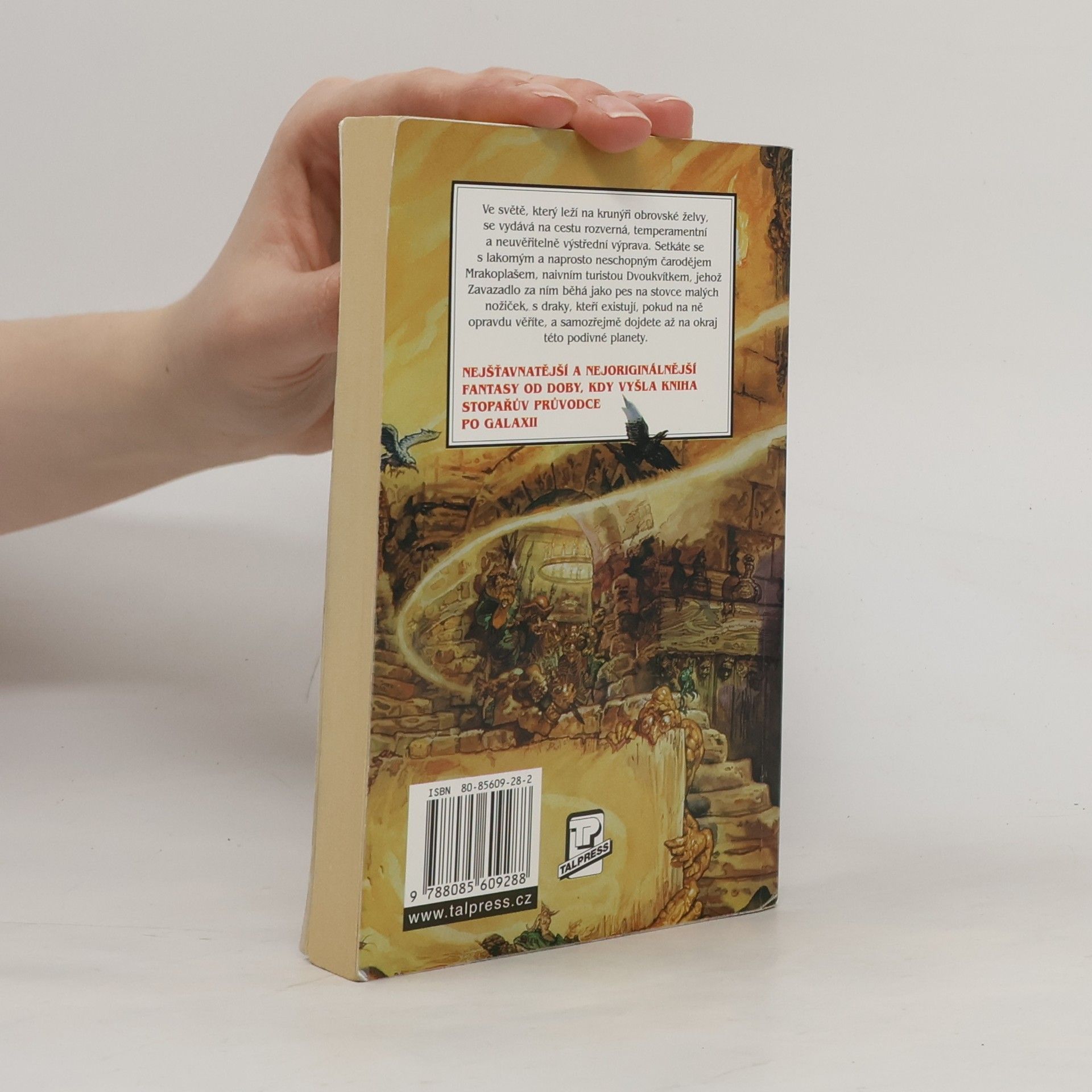 Ve světě, který leží na krunýři obrovské želvy, se vydává na cestu rozverná, temperamentní a neuvěřitelně výstřední výprava. Setkáte se s lakomým a naprosto neschopným čarodějem Mrakoplašem, naivním turistou Dvoukvítkem, jehož Zavazadlo za ním běhá jako pes na stovce malých nožiček, s draky, kteří existují pokud na ně opravdu věříte, a samozřejmě dojdete až na okraj této podivné planety.