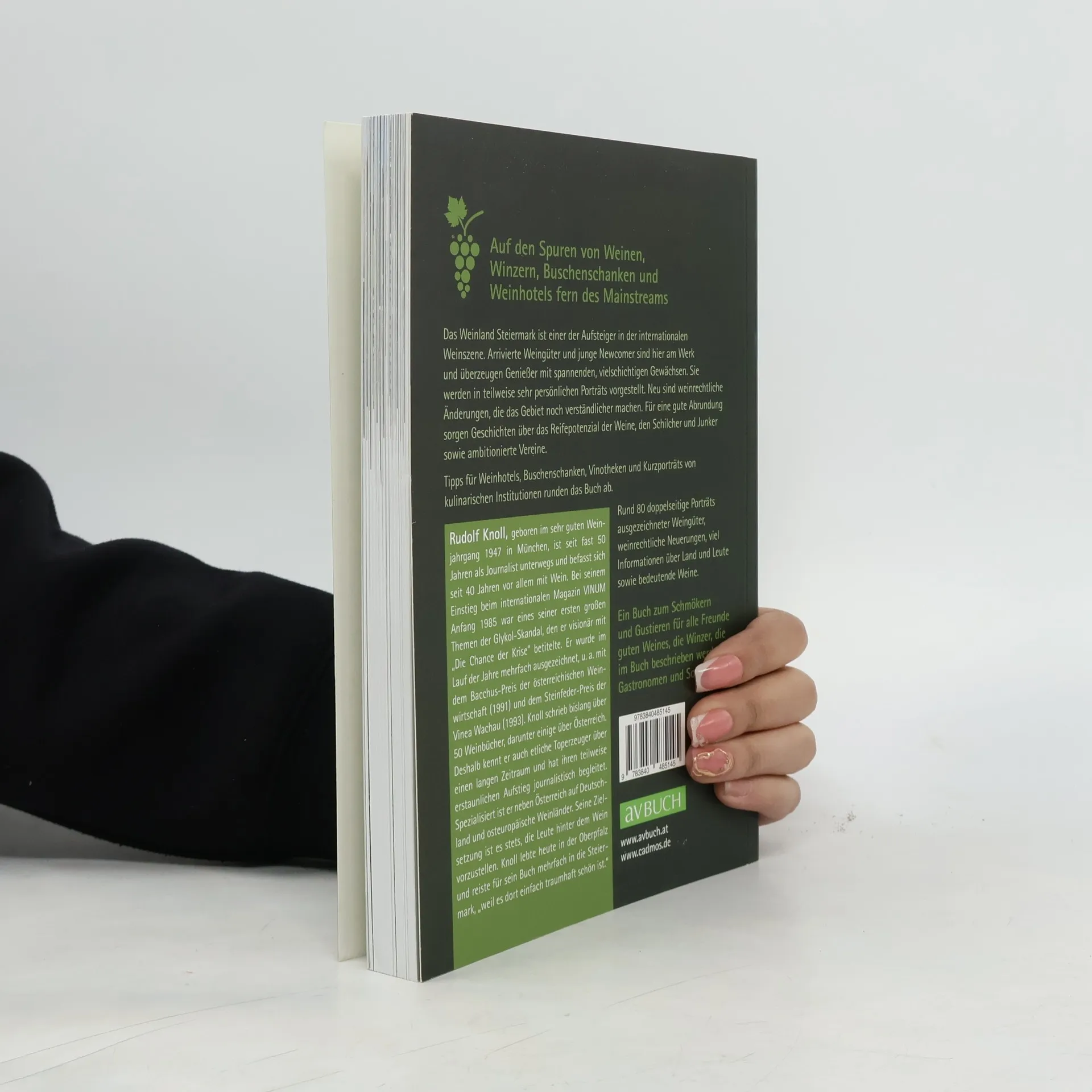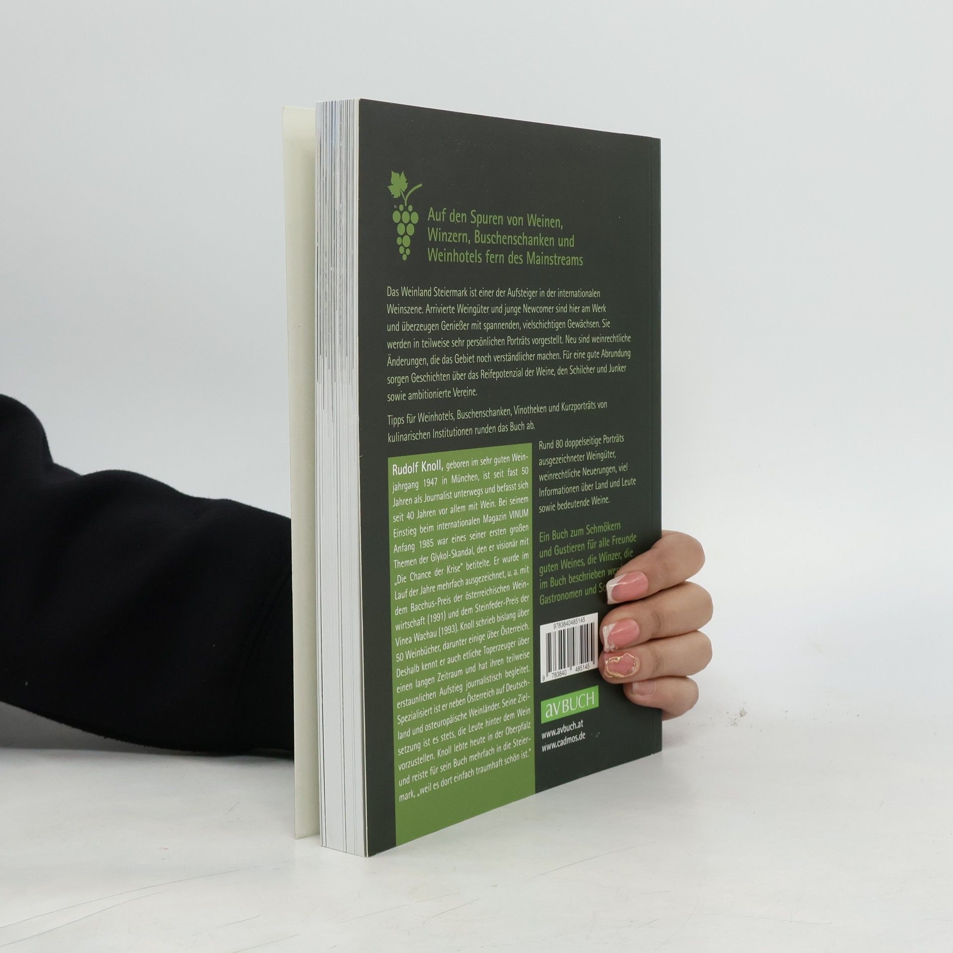 Obwohl die Steiermark mit ihren knapp 5000 Hektar Reben zu den kleineren Weinländern gehört, sind ihre Weine in vieler Munde. Die Südsteiermark, das Vulkanland (früher Südost-Steiermark) und die für Schilcher bekannte Weststeiermark gehören zusammen zu den Aufsteiger-Regionen in der internationalen Szene. Die Weine sind sogar in führenden internationalen Restaurants zu finden. Im Weinbuch des namhaften deutschen Weinjournalisten Rudolf Knoll, der sich seit über 30 Jahren intensiv mit Wein aus Österreich beschäftigt und bereits 1991 mit dem Bacchus-Preis der Weinwirtschaft ausgezeichnet wurde, werden rund 75 Betriebe mit teilweise sehr persönlichen Portraits vorgestellt, etwas abseits des üblichen Mainstreams und oft mit einer Prise Humor bereichert. Auf die aktuellen weinrechtlichen Änderungen wird ebenso eingegangen wie auf das überraschende Reifepotenzial bedeutender Gewächse der Top-Weingüter. Geschichten über die wichtigen Vereine vor und hinter den Kulissen, die Besonderheiten des Schilcher und die Karriere des Junker runden das Buch ab. Wichtig für Weinreisende sind Tipps für empfehlenswerte Weinhotels, Vinotheken, Buschenschanken und kulinarische Institutionen.