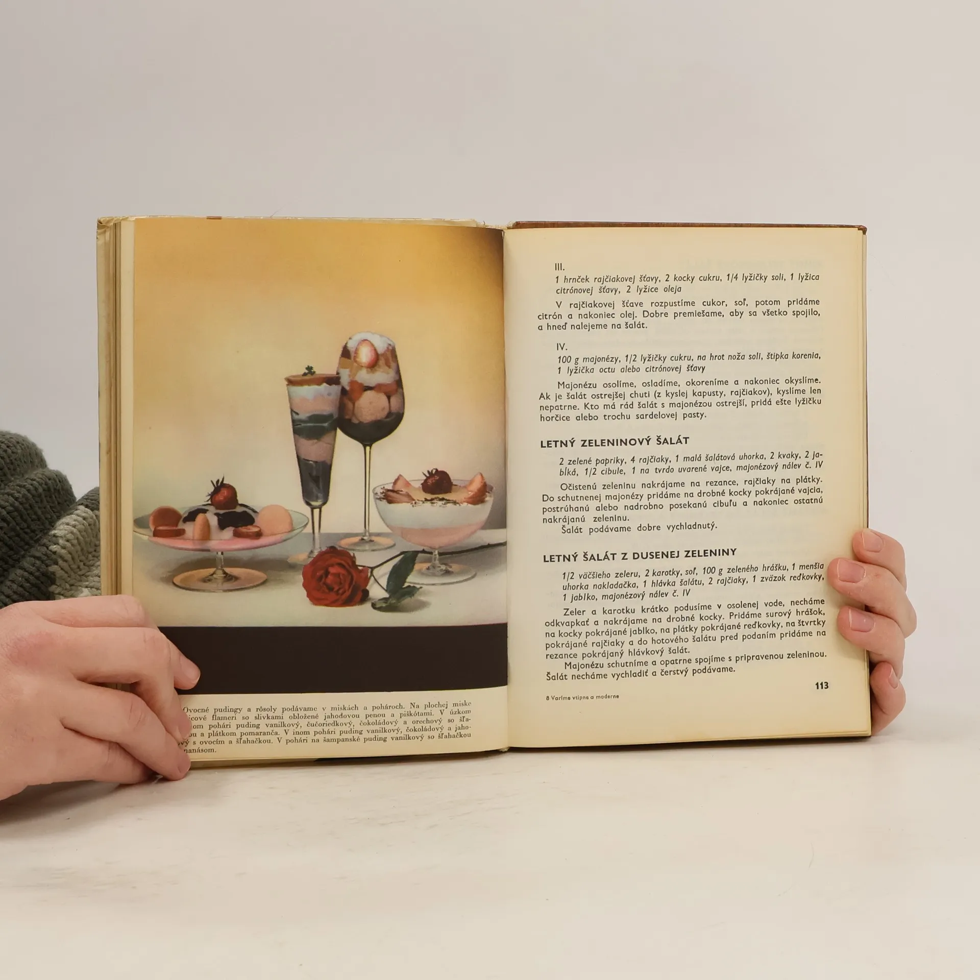 V prvej časti knihy sú nové predpisy, ktoré spestria náš jedálny lístok. Sú to nové polievky, predjedlá pre rodinnú večeru i hosťov, menej zvyčajné prílohy, šaláty, nápoje a pod. V druhej časti knihy sú úsporné a lacné recepty, rady, ako využívať zvyšky, predpisy na večere s malým kúskom mäsa alebo bezmäsité. Prvé vydanie. Cena knihy v čase vydania: 23.- Kčs.