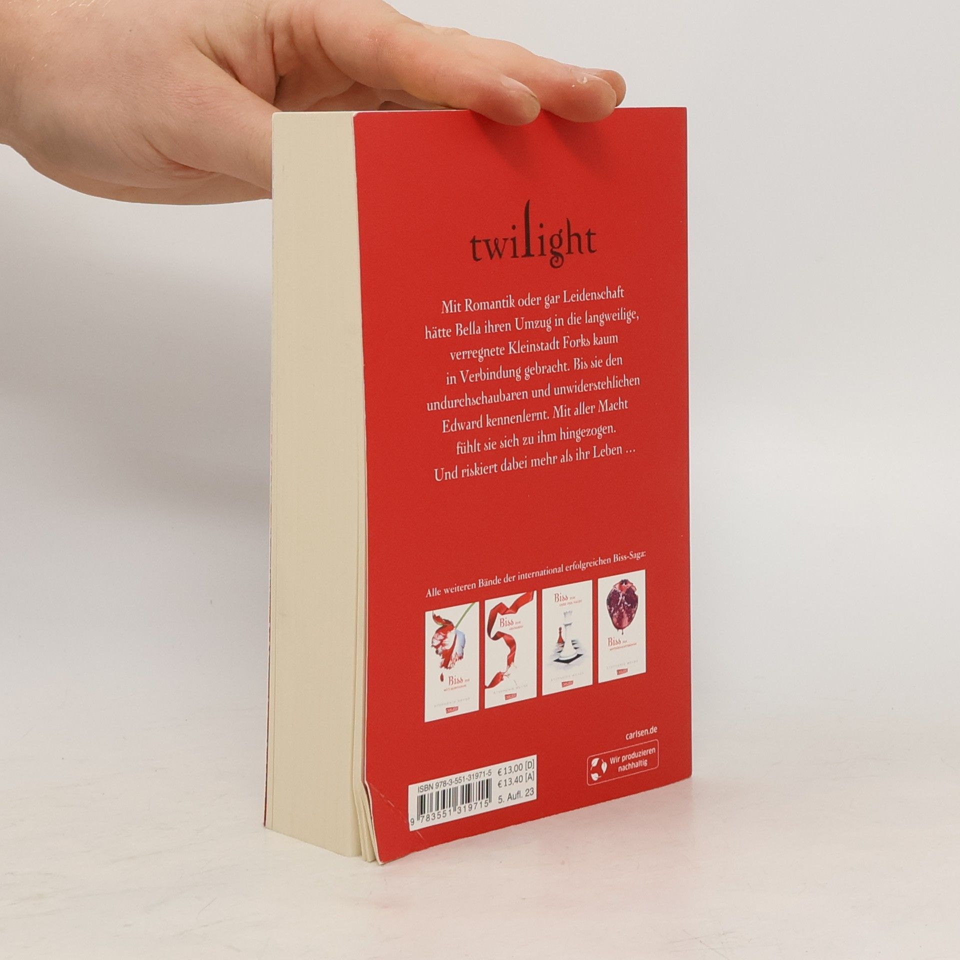 Der Beginn der packenden Liebesgeschichte zwischen Edward und Bella von Spiegel-Bestseller-Autorin Stephenie Meyer »Es gab drei Dinge, deren ich mir ganz sicher war: Erstens, Edward war ein Vampir. Zweitens, ein Teil von ihm - und ich wusste nicht, wie mächtig dieser Teil war - dürstete nach meinem Blut. Und drittens, ich war bedingungslos und unwiderruflich in ihn verliebt.« Mit Romantik oder gar Leidenschaft hätte Isabella Swan ihren Umzug in die langweilige, verregnete Kleinstadt Forks kaum in Verbindung gebracht. Bis sie den undurchschaubaren und unwiderstehlichen Edward kennenlernt. Mit aller Macht fühlt sie sich zu ihm hingezogen. Und riskiert dabei mehr als ihr Leben … Dies ist Band 1 der international erfolgreichen »Biss«-Saga. Alle Bände auf einen Blick: Biss zum Morgengrauen Biss zur Mittagsstunde Biss zum Abendrot Biss zum Ende der NachtBiss zur Mitternachtssonne Biss zum ersten Sonnenstrahl – Das kurze zweite Leben der Bree Tanner Seit August 2020 gibt es auch Band 5 der weltweit geliebten Fantasy-Romance-Serie: »Biss zur Mitternachtssonne« und endlich erfahren wir die Geschichte aus Edwards Sicht! Mit farbigem Schnitt in der ersten Auflage!
