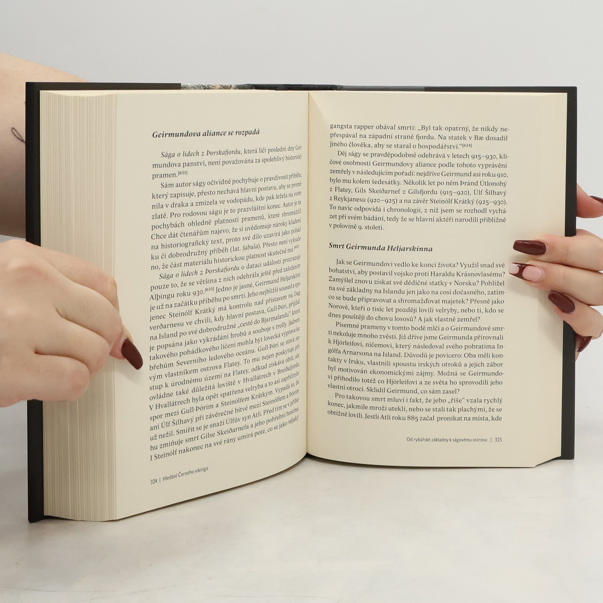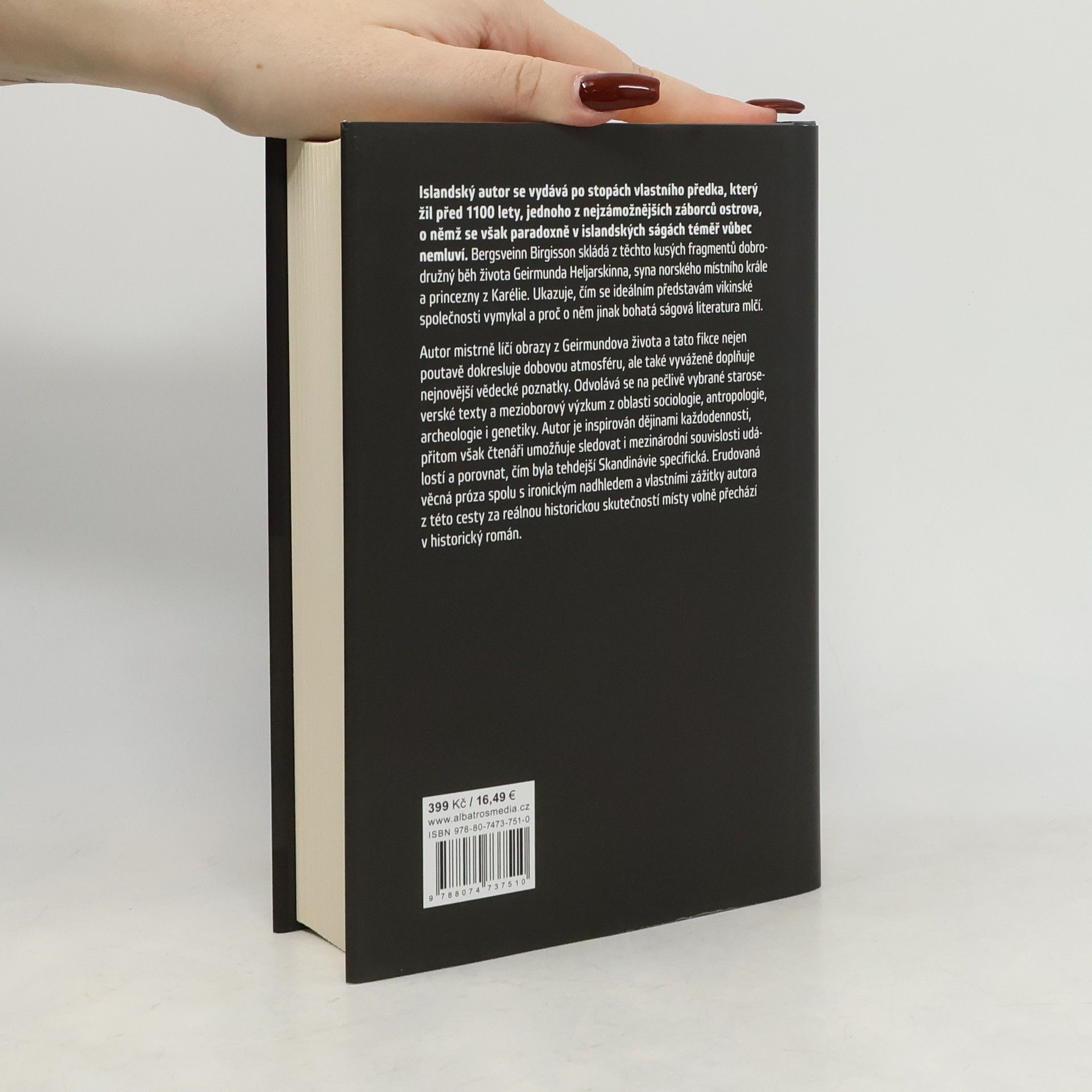 Vikinská éra z pohledu historie i fikce. Islandský autor se vydává po stopách vlastního předka, který žil před 1100 lety, jednoho z nejzámožnějších záborců ostrova, o němž se však paradoxně v islandských ságách téměř vůbec nemluví. Bergsveinn Birgisson skládá z těchto kusých fragmentů dobrodružný běh života Geirmunda Heljarskinna, syna norského místního krále a princezny z Karélie. Ukazuje, čím se ideálním představám vikinské společnosti vymykal a proč o něm jinak bohatá ságová literatura mlčí. Autor mistrně líčí obrazy z Geirmundova života a tato fikce nejen poutavě dokresluje dobovou atmosféru, ale také vyváženě doplňuje nejnovější vědecké poznatky. Odvolává se na pečlivě vybrané staroseverské texty a mezioborový výzkum z oblasti sociologie, antropologie, archeologie i genetiky. Autor je inspirován dějinami každodennosti, přitom však čtenáři umožňuje sledovat i mezinárodní souvislosti událostí a porovnat, čím byla tehdejší Skandinávie specifická. Erudovaná věcná próza spolu s ironickým nadhledem a vlastními zážitky autora z této cesty za reálnou historickou skutečností místy volně přechází v historický román.