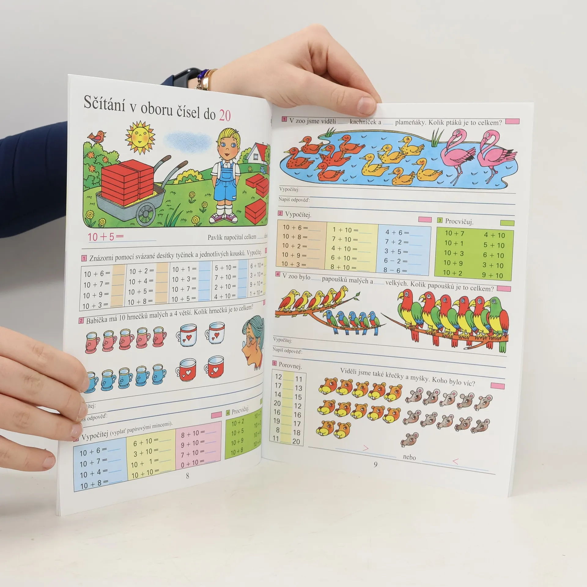 Pracovní sešit obsahující numeraci, sčítání a odčítání bez přechodu desítky v oboru čísel do 20 a jednoduché slovní úlohy. Dále obsahuje vztahy o x méně a o x více a výklad některých jednotek (metr, litr, kilogram) a prostorová tělesa