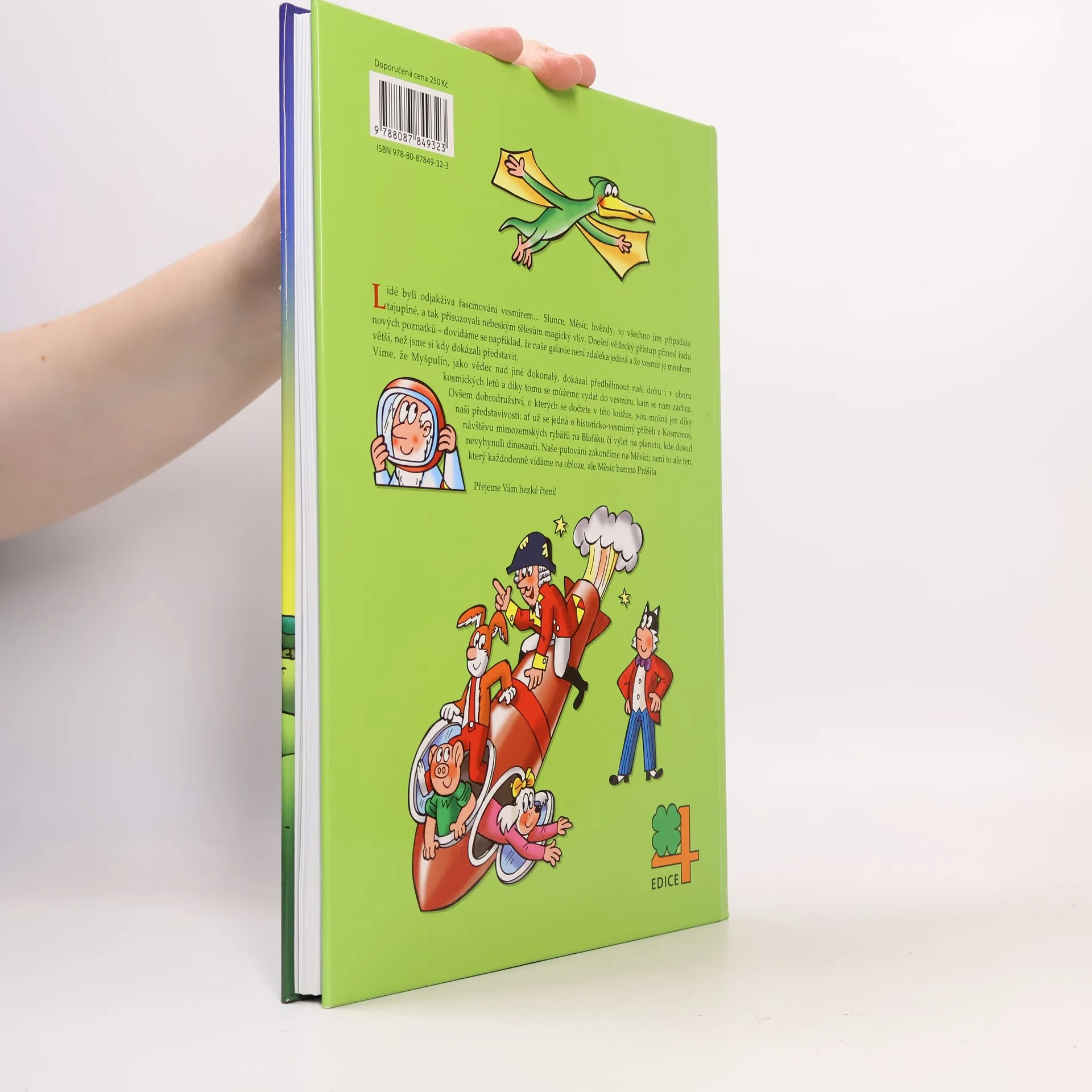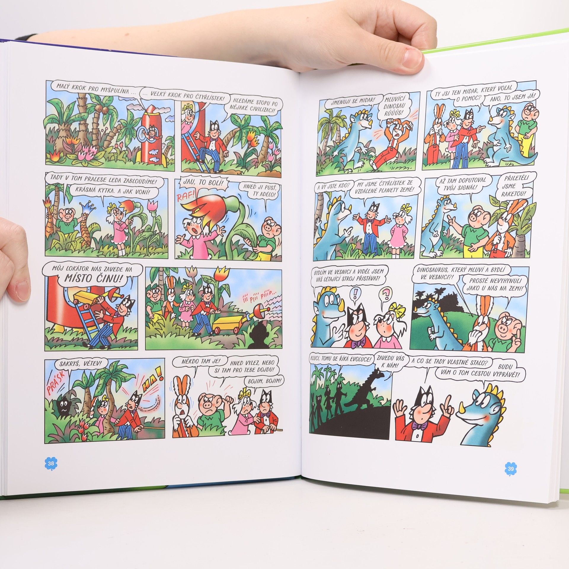 V pořadí desátá čtyřlístková kniha z edice 4. Tentokrát bude mít Čtyřlístek co do činění s vesmírem. Na rybníku Blaťáku se setká s mimozemšťany, v Kosmonosech objeví dávného kosmonauta, zaletí si na vzdálenou planetu dinosaurů a potká se dokonce se slovutným baronem Prášilem. Obsahuje komiksy: Mimozemšťané na Blaťáku - Jaroslav Němeček, Jaroslav Němeček Kosmonos z kosmonmos - Hana Lamková, Jaroslav Němeček Planeta dinosaurů - Radim Krajčovič, Jaroslav Němeček Výlet na měsíc - Jiří Poborák, Jaroslav Němeček