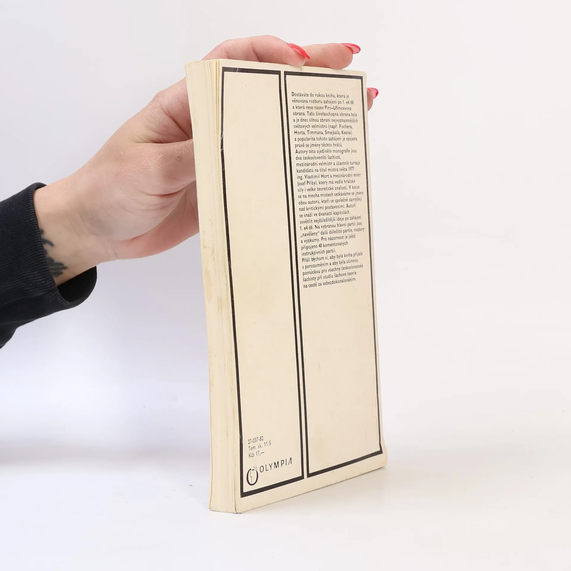 Tato životaschopná obrana byla a je dnes silnou zbraní nejvýznamnějsích světových velmistrů (např. Fischera, Horta, Timmana, Smejkala, Keena) a popularita tohoto zahájení je spojena právě se jmény těchto hráčů. Autory této ojedinělé monografie jsou dva českoslovenští šachisté, mezinárodní velmistr a účastník turnaje kandidátů na titul mistra světa 1977 ing. Vlastimil Hort a mezinárodní mistr Josef Přibyl, který má vedle hráčské síly i velké teoretické znalosti. V knize se na mnoha místech setkáváme se jmény obou autorů, kteří se společně zamýšlejí nad kritickými postaveními. Autoři se snaží ve dvanácti kapitolách osvětlit nejdůležitější ideje po zahájení t. e4 d6. Na vybranou hlavní partii jsou „navěšeny" další důležité partie, rozbory a výzkumy. Pro názornost je ještě připojeno 40 komentovaných instruktivních partií. Přáli bychom si, aby byla kniha přijata s porozuměním a aby byla účinnou pomůckou pro všechny československé šachisty při studiu šachové teorie na cestě za sebezdokonalováním.