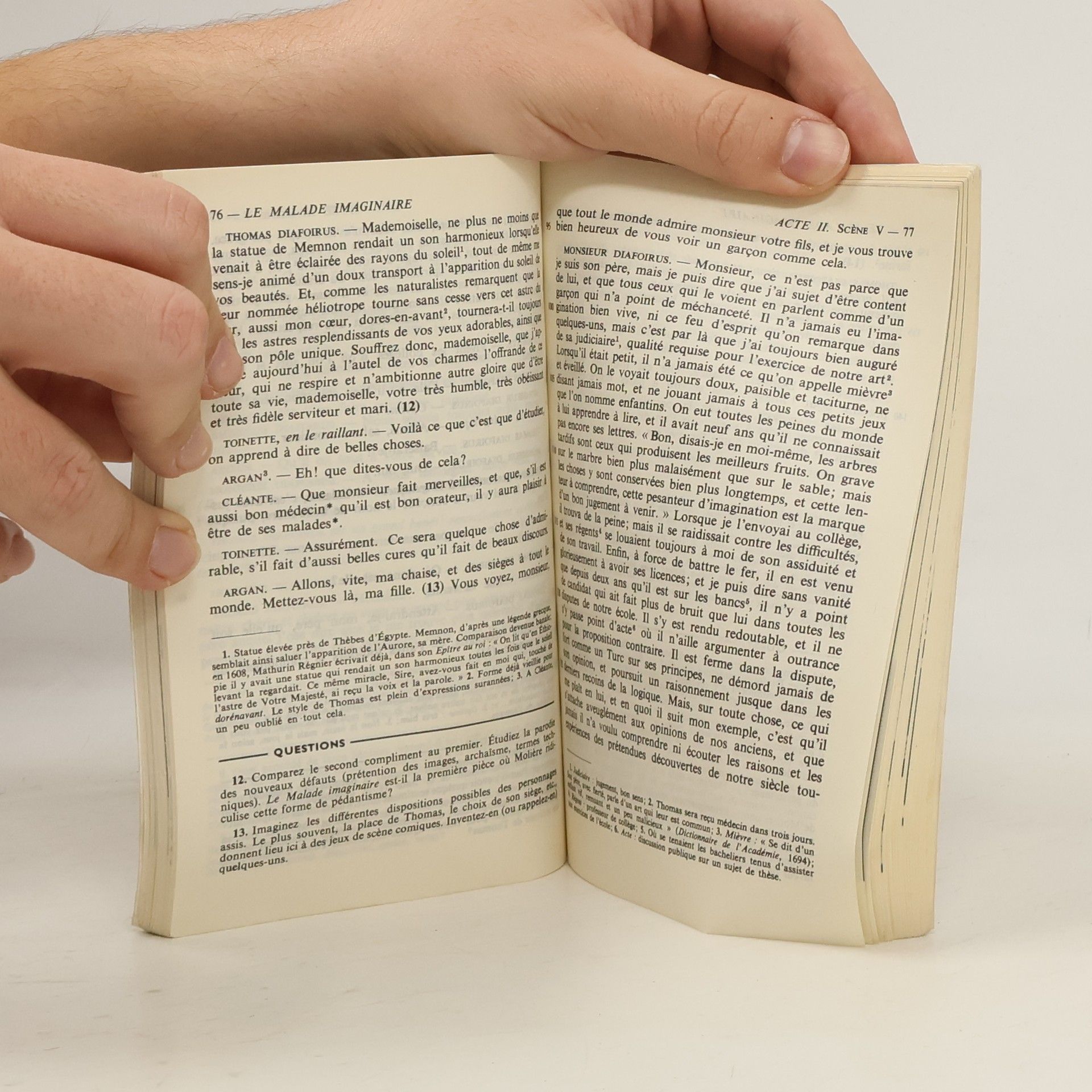 Extrait : «TOINET : Que diantre faites-vous de ce bras-là ? ARGAN : Comment ? TOINET : Voilà un bras que je me ferais couper tout à l'heure, si j'étais que de vous. ARGAN : Et pourquoi ? TOINET : Ne voyez-vous pas qu'il tire à soi toute la nourriture, et qu'il empêche ce côté-là de profiter ?»