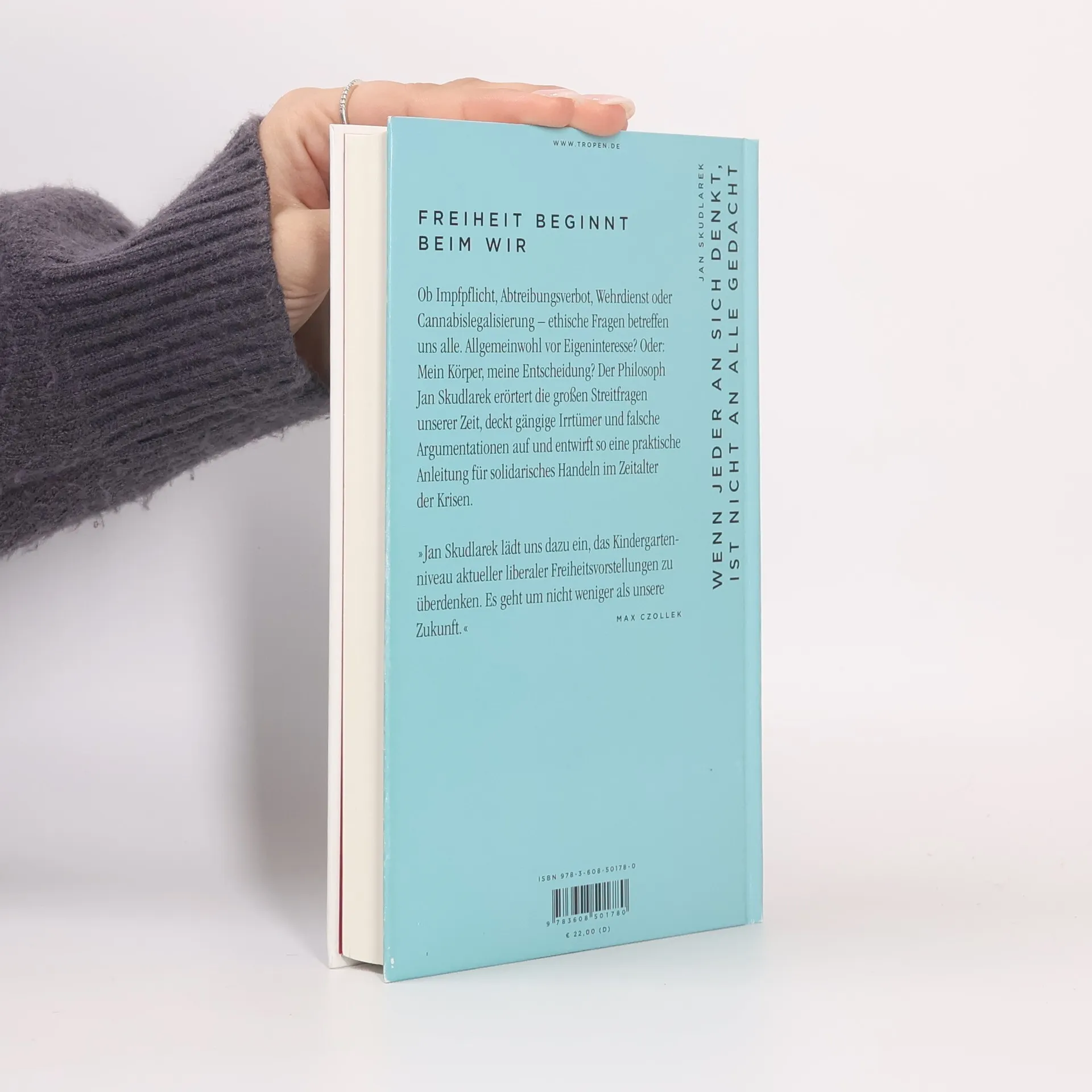 Jan Skudlarek lädt uns ein, das aktuelle Niveau liberaler Freiheitsvorstellungen zu überdenken. Ethische Fragen wie Impfpflicht, Abtreibungsverbot und Cannabislegalisierung betreffen uns alle. Der Philosoph erörtert zentrale Streitfragen unserer Gesellschaft, deckt Irrtümer und falsche Argumentationen auf und bietet eine Handreichung für solidarisches Handeln in Krisenzeiten. Vor über vierzig Jahren stellte Hans Jonas in seinem Hauptwerk die Frage, wo die Freiheit des Einzelnen endet. Heute ist die Debatte über Freiheit und Verantwortung drängender denn je. Was bedeutet Verantwortung? Warum fällt sie uns schwer? Und warum führt individuelles Denken nicht zu einem gemeinsamen Wohl? Die gegenwärtigen Krisen zeigen, dass menschliche Gemeinschaft mehr ist als die Summe egoistischer Individuen. Wie gelingt gesellschaftlicher Zusammenhalt in Krisenzeiten? Skudlarek entwirft ein neues Wir, das Freiheit und Selbstbestimmung vereint und solidarisch ist. Dieses Wir trägt und verbindet, anstatt auszugrenzen. Wenn Freiheit toxisch wird, ist Solidarität die Antwort. Skudlarek präsentiert einen neuen Freiheitsbegriff, der uns durch die Krisen unserer Zeit leitet. Ein kluges, differenziertes Werk.