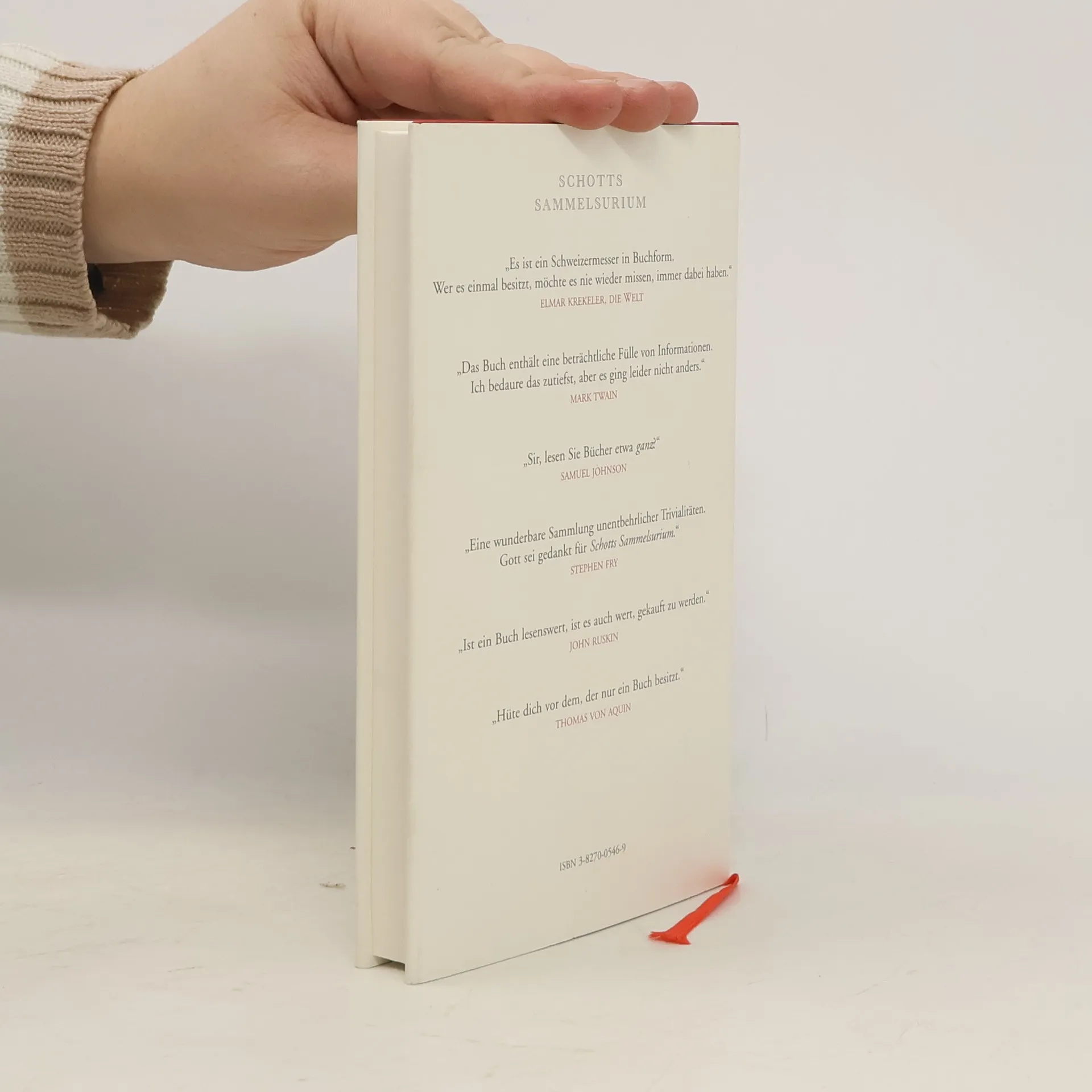 „Ben Schott ist ein Sammler von (scheinbaren) Nutzlosigkeiten: von kuriosen Statistiken, Klassifikationen, Hierarchien, Kategorien, Formaten, Bezeichnungen, Zitaten, Fachausdrücken, Namen, Definitionen, Abkürzungen, Größen, Symbolen, Phobien, Nomenklaturen und vielen anderen Merkwürdigkeiten. Ein Gemeinplatz, ein Potpourri, ein Mischmasch, ein Lexikon, ein Vademekum, ein Sammelsurium.“