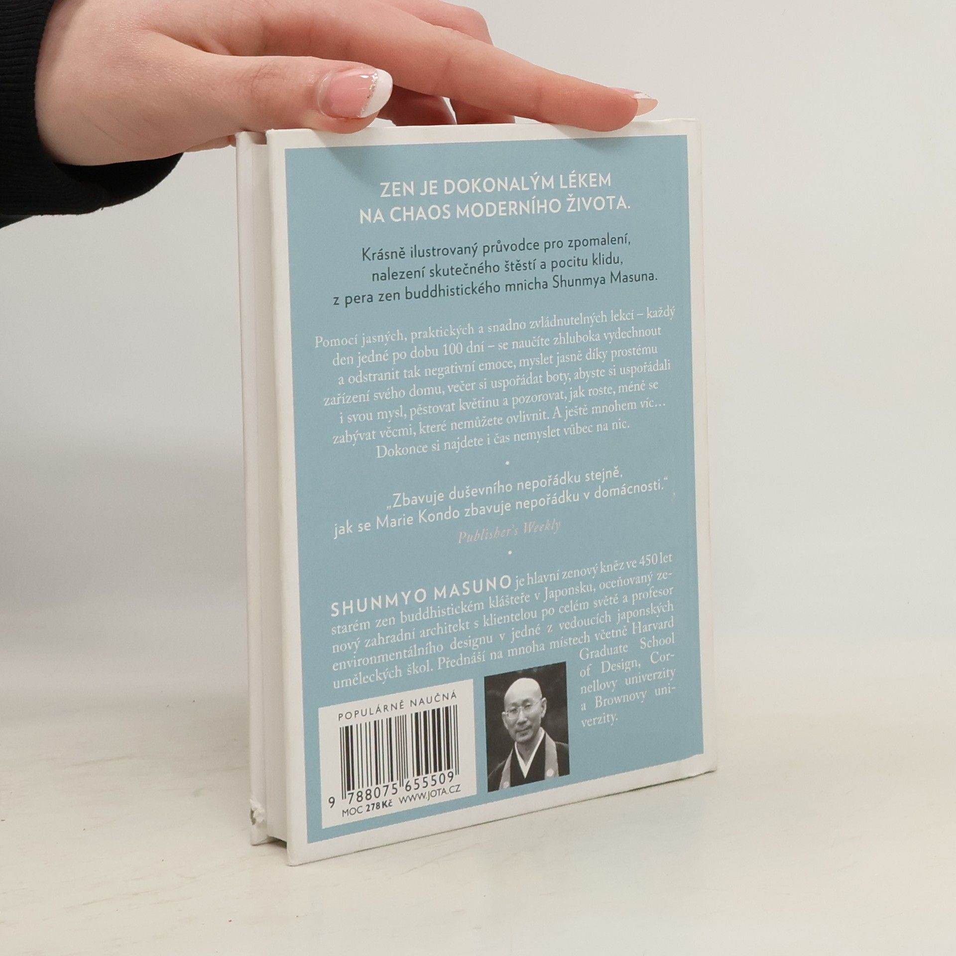 Renomovaný buddhistický mnich Shunmyo Masuno čerpá ze sto let staré moudrosti, aby vám ukázal, jak do moderního života vnést podstatu zen buddhismu. Pomocí jasných, praktických a snadno zvládnutelných lekcí – každý den jedné po dobu 100 dní – se naučíte zhluboka vydechnout a odstranit tak negativní emoce; myslet jasně díky prostému zařízení svého domu; večer si uspořádat boty, abyste si uspořádali i svou mysl; pěstovat květinu a pozorovat, jak roste; méně se zabývat věcmi, které nemůžete ovlivnit; a ještě mnohem víc… Dokonce si najdete i čas nemyslet vůbec na nic.