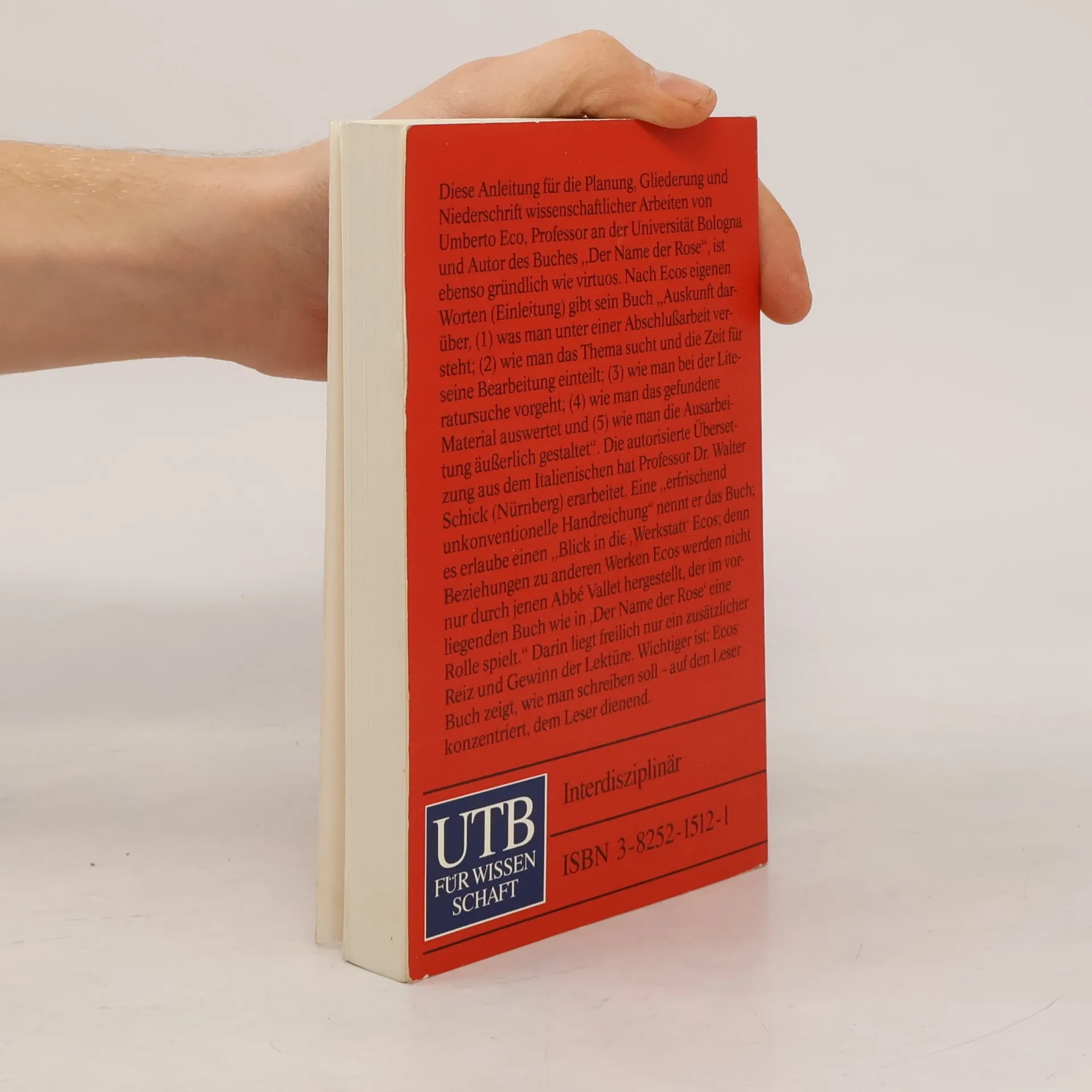 Diese Anleitung für die Planung, Gliederung und Niederschrift wissenschaftlicher Arbeiten von Umberto Eco, Professor an der Universität Bologna, ist ebenso gründlich wie virtuos. Nach Ecos eigenen Worten (Einleitung) gibt sein Buch „Auskunft darüber, (1) was man unter einer Abschlussarbeit versteht, (2) wie man das Thema sucht und die Zeit für seine Bearbeitung einteilt, (3) wie man bei der Literatursuche vorgeht, (4) wie man das gefundene Material auswertet und (5) wie man die Ausarbeitung äußerlich gestaltet“. Die autorisierte Übersetzung hat Professor Dr. Walter Schick erarbeitet. Eine „erfrischend unkonventionelle Handreichung“ nennt er das Buch; es erlaube einen "Blick in die 'Werkstatt' Ecos; denn Beziehungen zu anderen Werken Ecos werden nicht nur durch jenen Abbé Vallet hergestellt, der im vorliegenden Buch wie in 'Der Name der Rose' eine Rolle spielt." Darin liegt freilich nur ein zusätzlicher Reiz und Gewinn der Lektüre. Wichtiger ist: Ecos Buch zeigt, wie man schreiben soll - auf den Leser konzentriert, dem Leser dienend.