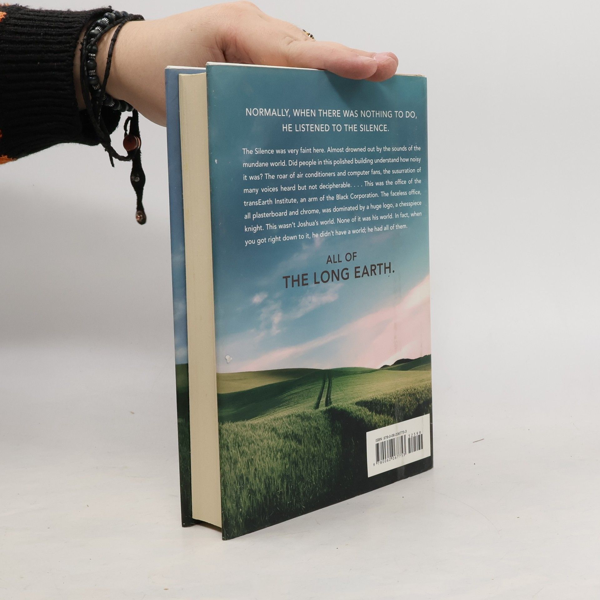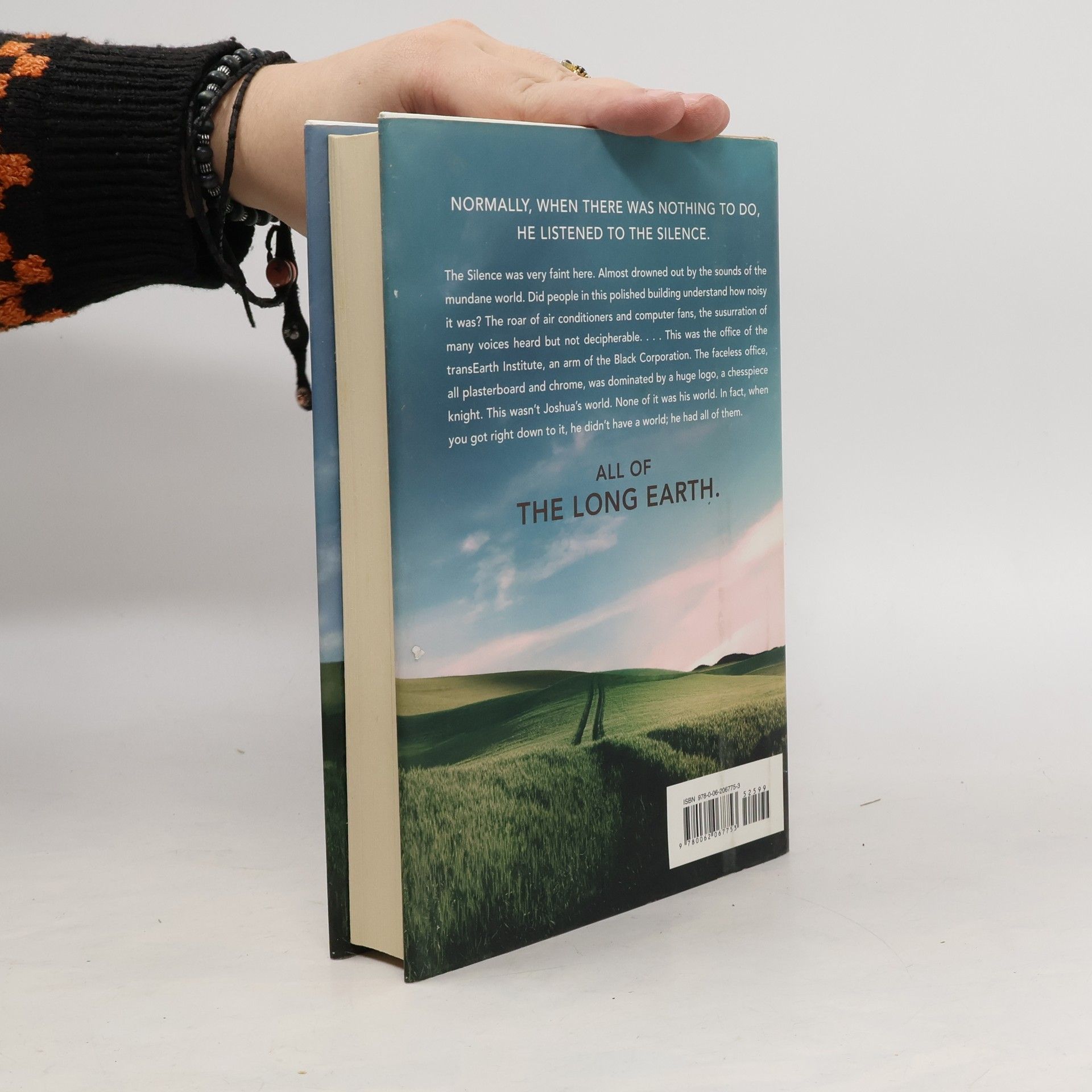 From the back jacket: NORMALLY, WHEN THERE WAS NOTHING TO DO, HE LISTENED TO THE SILENCE. The Silence was very faint here. Almost drowned out by the sounds of the mundane world. Did people in this polished building understand how noisy it was? The roar of air conditioners and computer fans, the susurration of many voices heard but not decipherable.... This was the office of the transEarth Institute, an arm of the Black Corporation. The faceless office, all plasterboard and chrome, was dominated by a huge logo, a chesspiece knight. This wasn't Joshua's world. None of it was his world. In fact, when you got right down to it, he didn't have a world; he had all of them. ALL OF THE LONG EARTH. From the inside jacket: The possibilites are endless. Just be careful what you wish for....) 1916: The Western Front. Private Percy Blakeney wakes up. He is lying on fresh spring grass. He can hear birdsong, and the wind in the leaves. Where has the mud, blood and blasted landscape of no-man's-land gone? For that matter, where has Percy gone? 2015: Madison, Wisconsin. Police officer Monica Jansson is exploring the burned-out home of a reclusive--some said mad, others allege dangerous--scientist who seems to have vanished. Sifting through the wreckage, Jansson finds a curious gadget: a box containing some rudimentary wiring, a three-way switch, and...a potato. It is the prototype of an invention that will change the way humankind views the world forever. The first novel in an exciting new collaboration between Discworld creator Terry Pratchett and the acclaimed SF writer Stephen Baxter, The Long Earth transports readers to the ends of the earth and far beyond. All it takes is a single step....