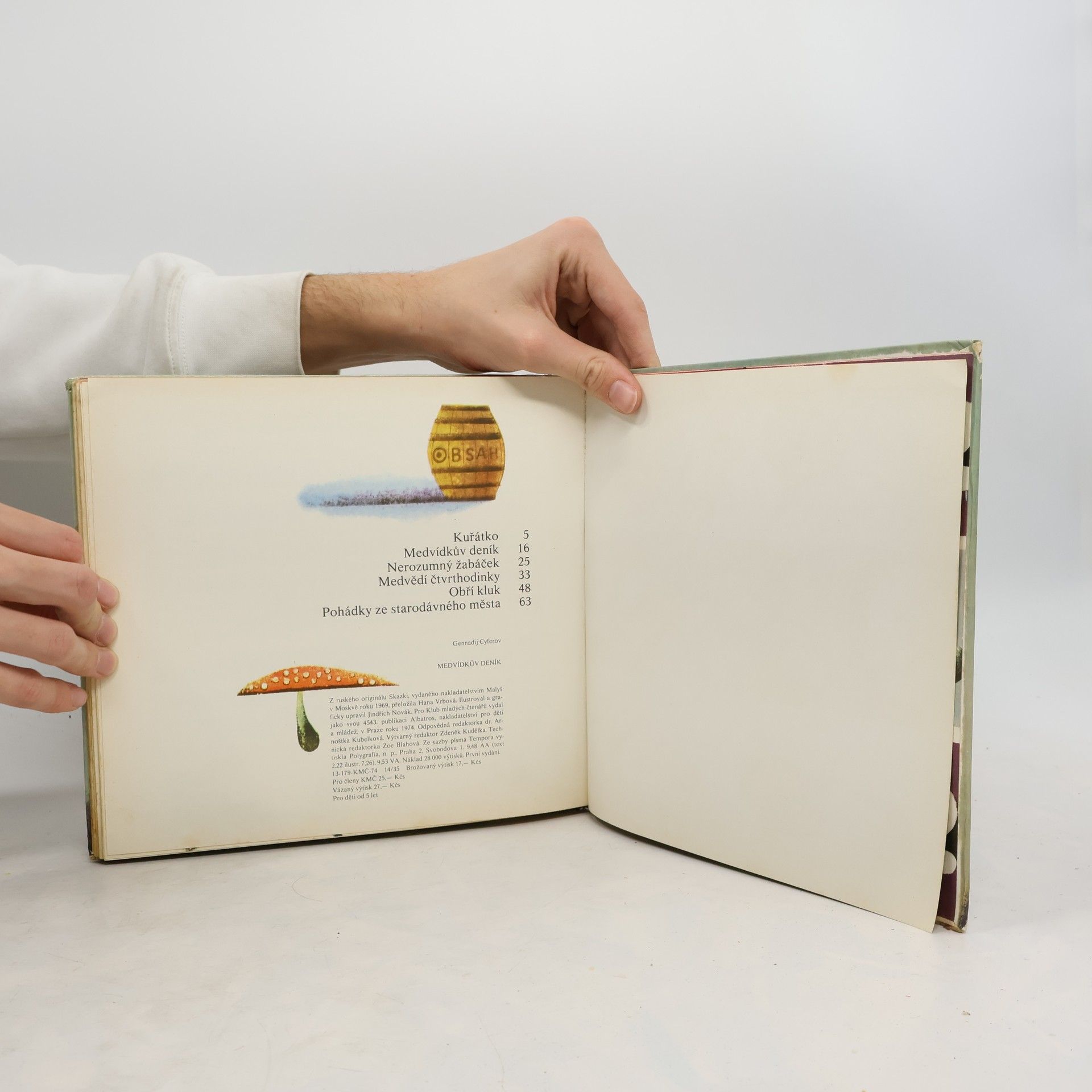Knížka obsahuje pohádky: Kuřátko, Medvídkův deník, Nerozumný žabáček, Medvědí čtvrthodinky, Obří kluk a Pohádky ze starodávného města.