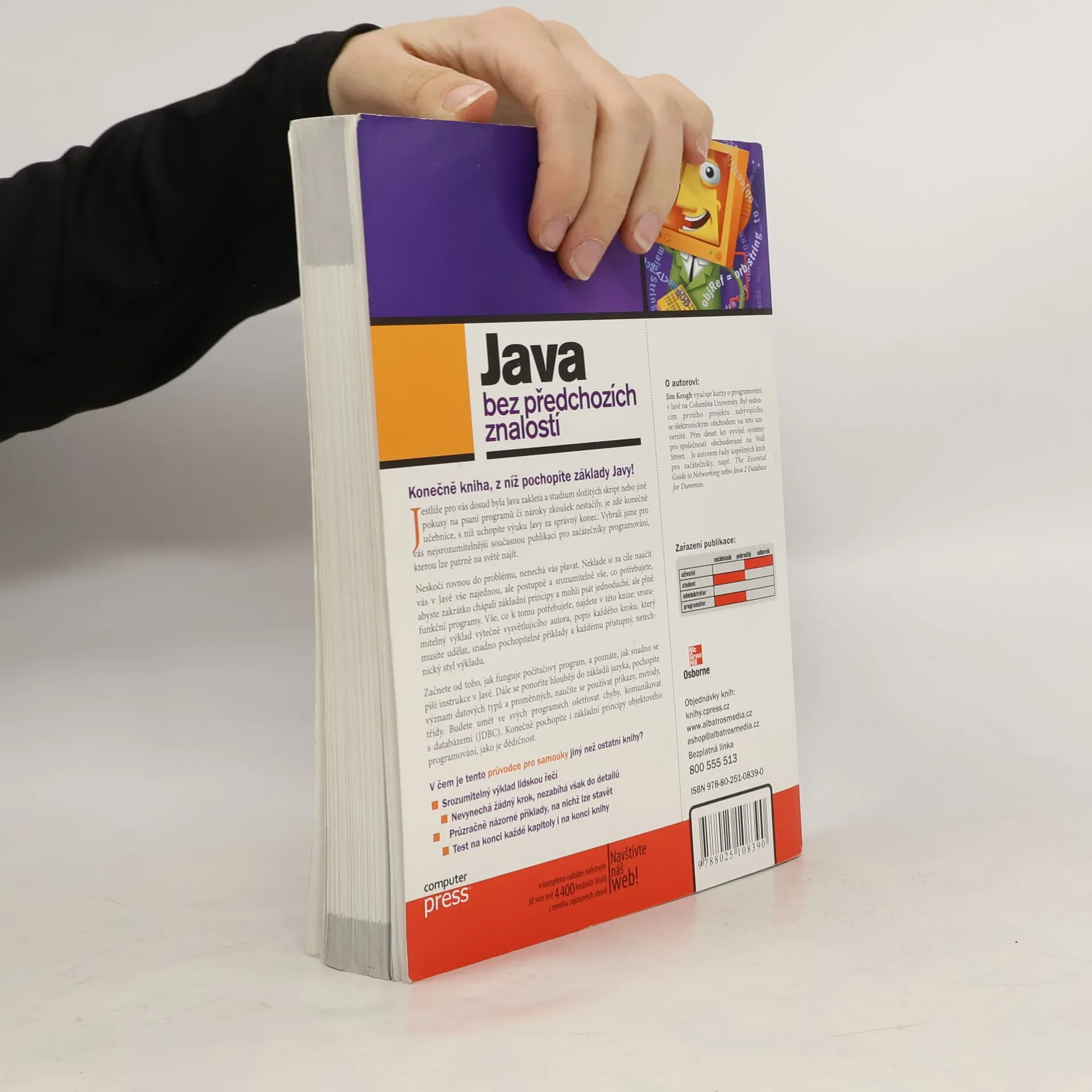 Konečně je zde kniha, s níž porozumíte Javě! Bez obvyklého odborného slangu, na množství jednoduchých příkladů, s kontrolními otázkami na koncích kapitol a se závěrečným testem sami a v krátké době zvládnete základy Javy: stavbu programů, výrazy a příkazy, ošetření výjimek a JDBC, zvládnete zkrátka vytváření fungujících programů v Javě!