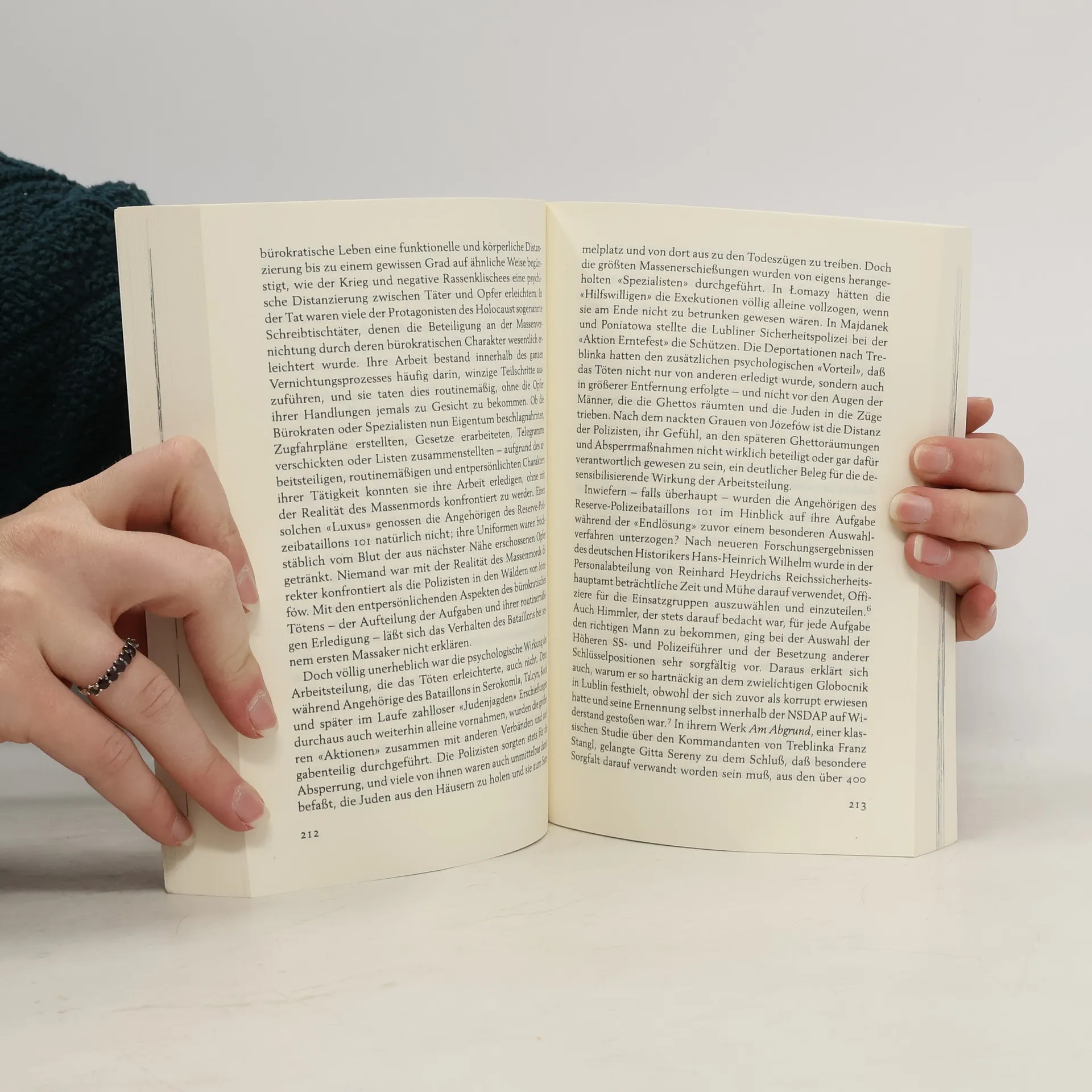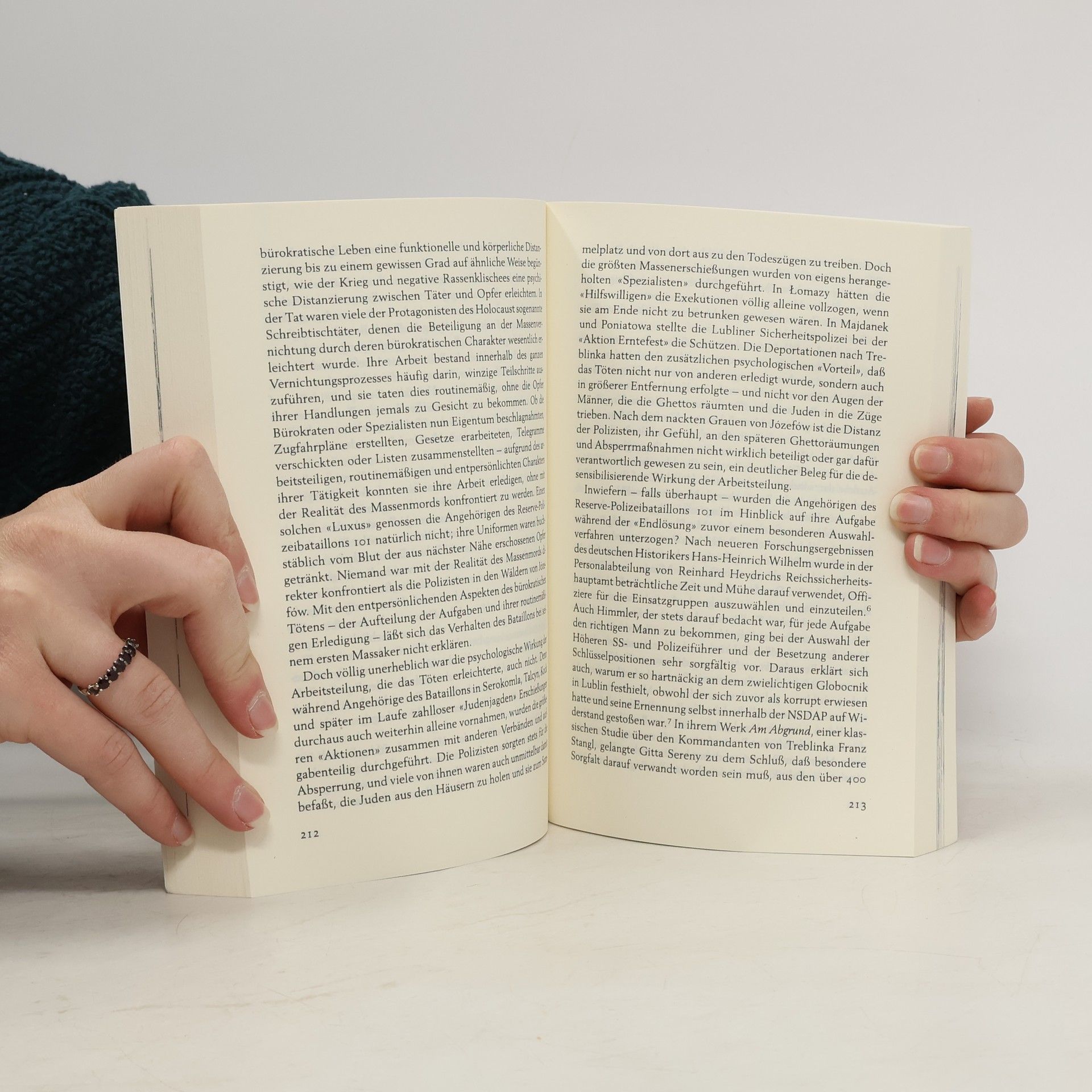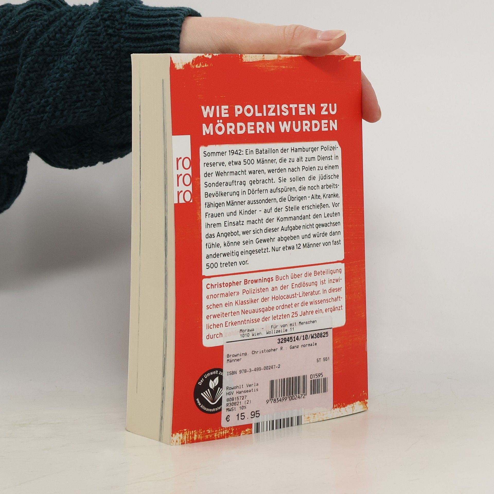 Christopher Brownings Buch über die Beteiligung „normaler“ Polizisten an der Endlösung ist inzwischen ein Klassiker der Holocaust-Literatur. In dieser erweiterten Neuausgabe ordnet er die wissenschaftlichen Erkenntnisse der letzten 25 Jahre, ergänzt durch zahlreiche zusätzliche Fotos, ein. Sommer 1942: Ein Bataillon der Hamburger Polizeireserve, etwa 500 Männer, die zu alt zum Dienst in der Wehrmacht waren, werden nach Polen zu einem Sonderauftrag gebracht. Sie sollen die jüdische Bevölkerung in Dörfern aufspüren, die noch arbeitsfähigen Männer aussondern, die übrigen – Alte, Kranke, Frauen und Kinder – auf der Stelle erschießen. Vor ihrem Einsatz macht der Kommandant den Leuten das Angebot, wer sich dieser Aufgabe nicht gewachsen fühle, könne sein Gewehr abgeben und würde dann zu einer anderen Aufgabe eingesetzt. Nur etwa 12 Männer von fast 500 treten vor.