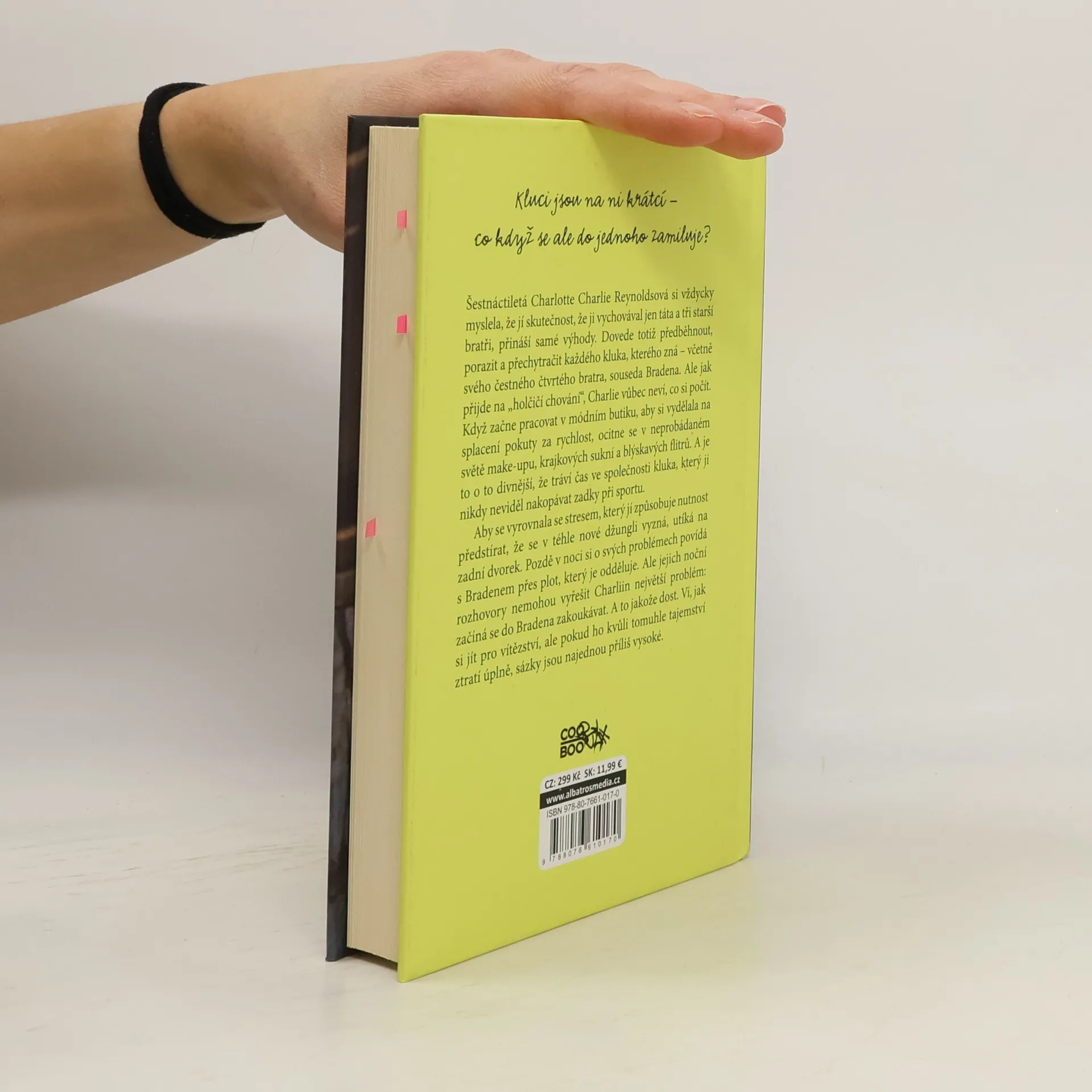 Šestnáctiletá Charlotte Charlie Reynoldsová si vždycky myslela, že jí skutečnost, že ji vychovával jen táta a tři starší bratři, přináší samé výhody. Dovede totiž předběhnout, porazit a přechytračit každého kluka, kterého zná - včetně svého čtvrtého bratra, souseda Bradena. Ale jak přijde na ,,holčičí chování", Charlie vůbec neví, co si počít. Když začne pracovat v módním butiku, aby si vydělala na splacení pokuty za rychlost, ocitne se v neprobádaném světě make-upu, krajkových sukní a blýskávých flitrů. A je to o to divnější, že tráví čas ve společnostu kluka, který ji nikdy neviděl nakopávat zadky při sportu. Aby se vyrovnala se stresem, který ji způsobuje nutnost předstírat, že se v téhle nové džungli vyzná, utíká na zadní dvorek. Pozdě v noci si o svých problémech povídá s Bradenem přes plot, který je odděluje. Ale jejich noční rozhovory nemohou vyřešit Charliin největší problém: začíná se do Bradena zakoukávat. A to jakože dost. Ví, jak si jít pro vítězství, ale pokud ho kvůli tomuhle tajemství ztratí úplně, sázky jsou najednou příliš vysoké.